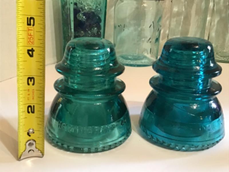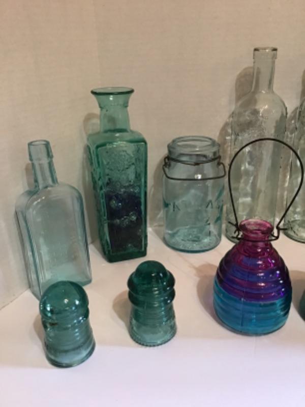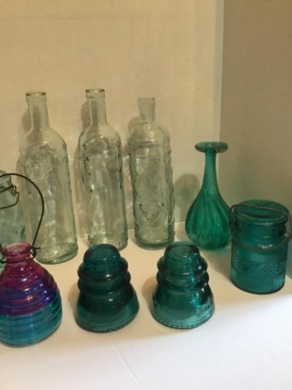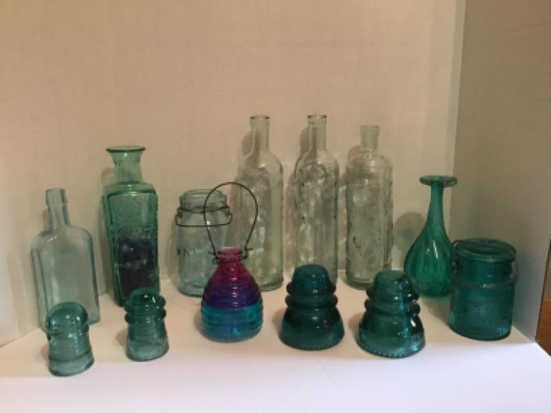 165: Lot of Vintage Teal and Clear Glass Bottles and Insulators