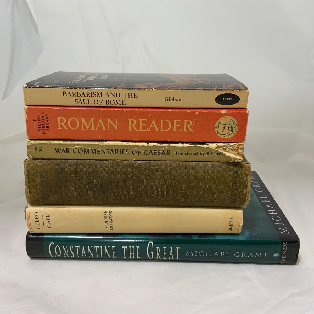 From the Estate of Peter Radovanovich: Six books about Rome and leaders of Rome. Books included are: Constantine The Great by Michael Grant | Cicero by Clark | Caesar’s Commentaries by Francis W. Kelsey | War Commentaries of Caesar by Rex Warner | Roman Reader by Basil Davenport | Barbarism and the Fall of Rome by Crane Britton and Paul Edwards. Books are in good to great used condition. Please see photos for details and condition. ::: Shipping is available on this lot. If you require shipping you must let us know at the close of the auction. We will coordinate with you after the item has been won. Shipping fees will include insurance up to or exceeding the value of all items being mailed. If you have any questions regarding this lot please contact the auctioneer either via this website, by direct email or by phone. PICK UP TIMES and other important information can be found in the TERMS and DESCRIPTION of the auction. Please take a look for pertinent information. Thanks!