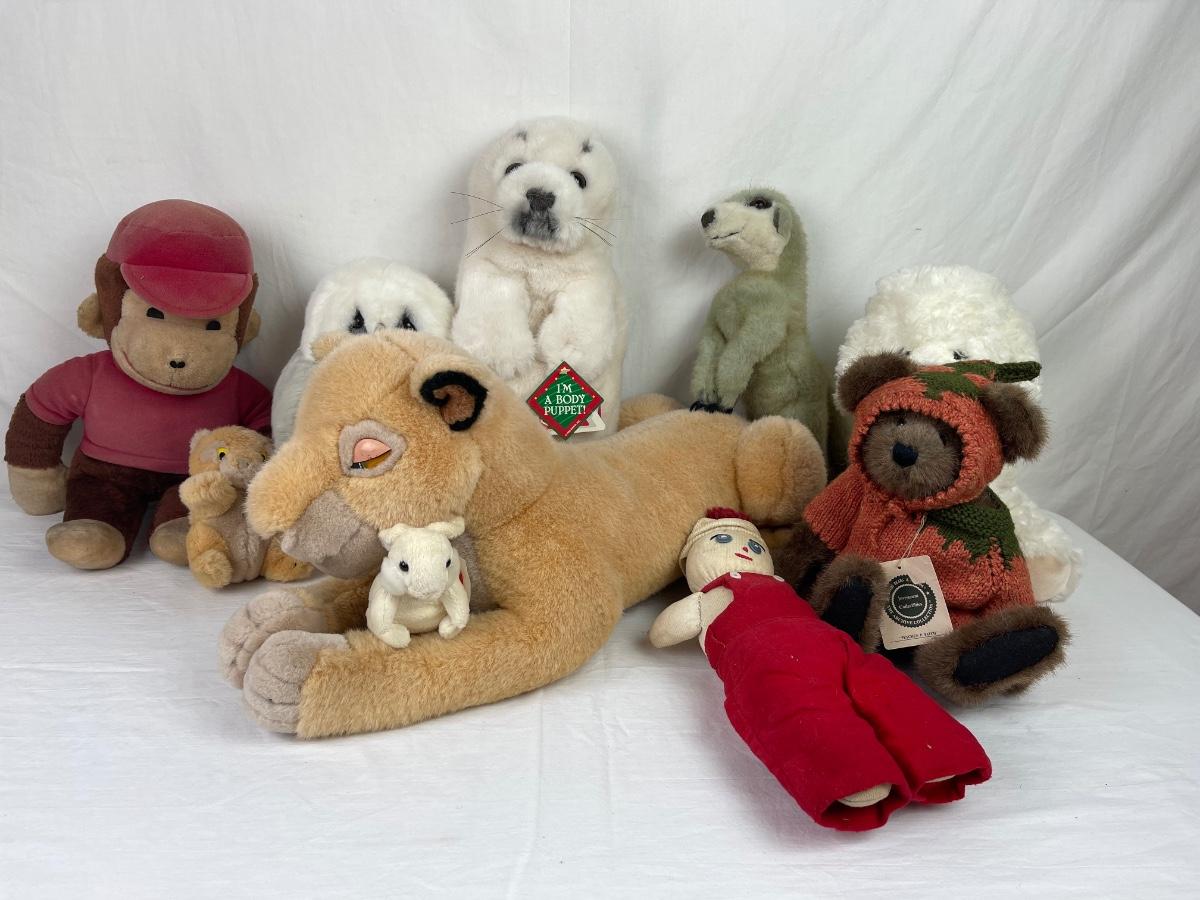 Large lion king, Boyd bear, fill body seal puppet , owl and more