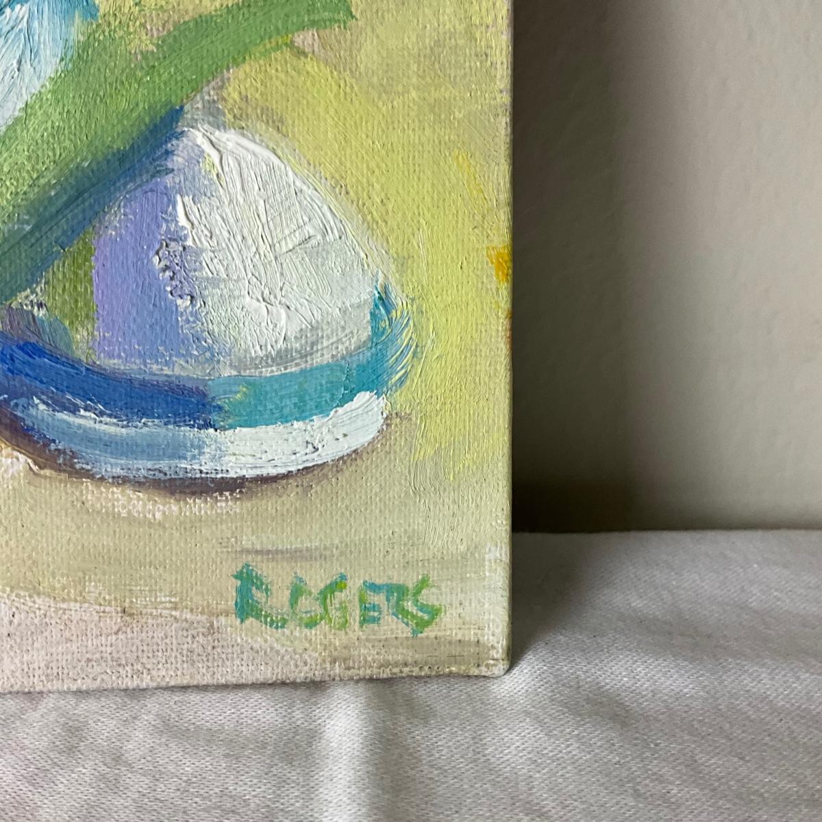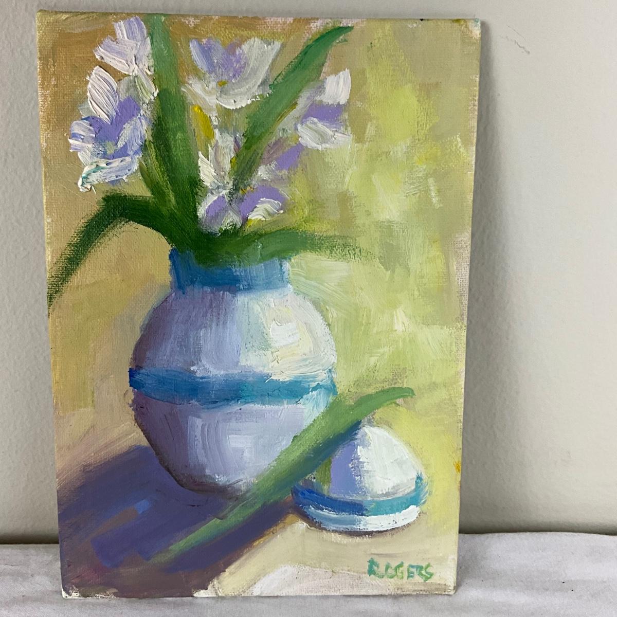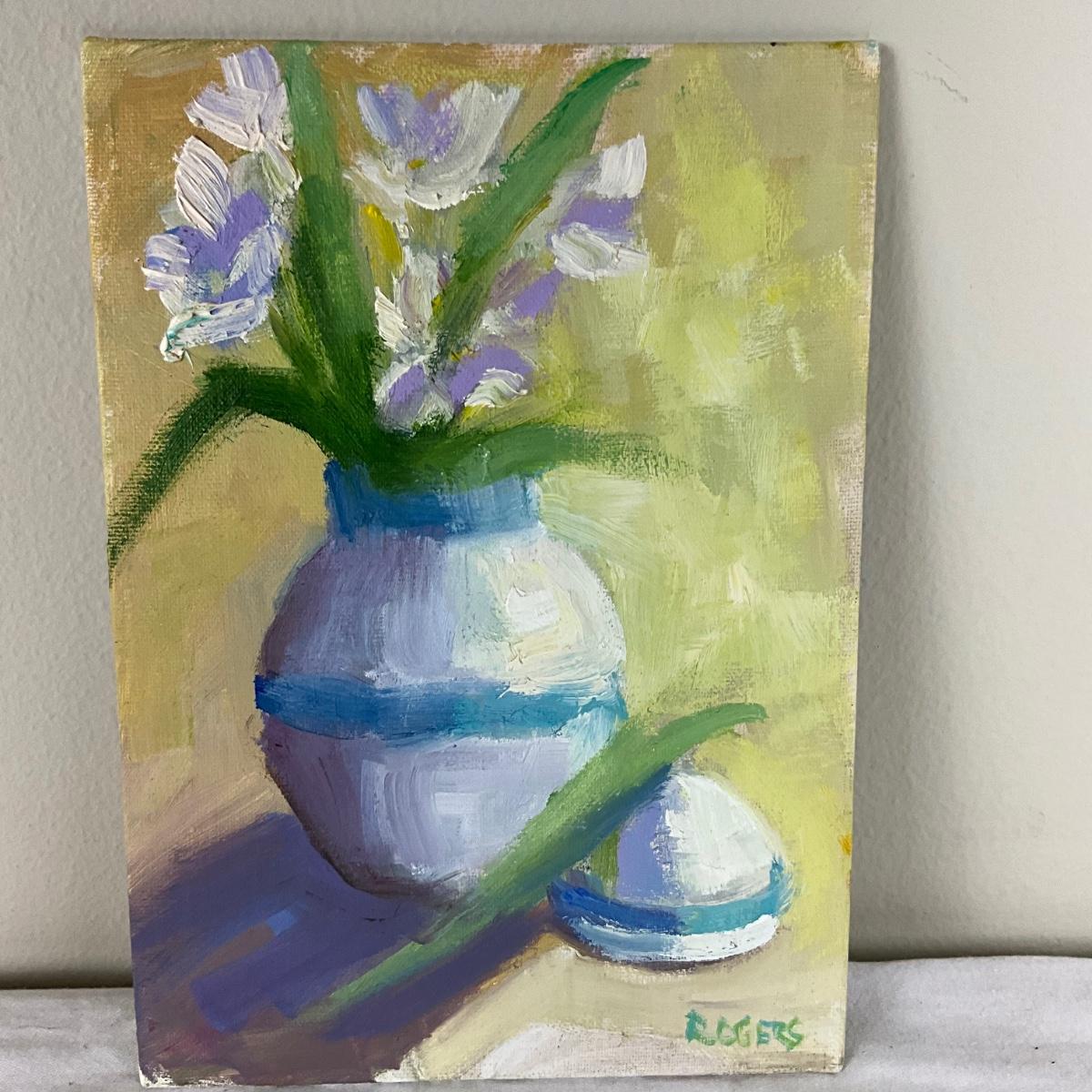 165 Original Oil Painting "White Flowers in Blue /White Jar" by Kathie Rogers