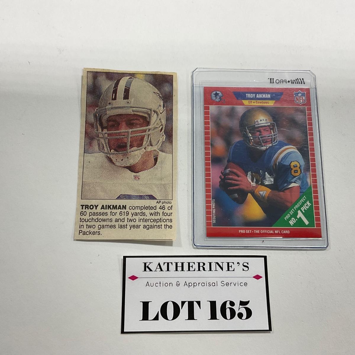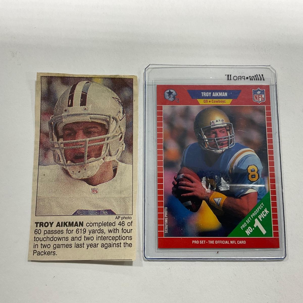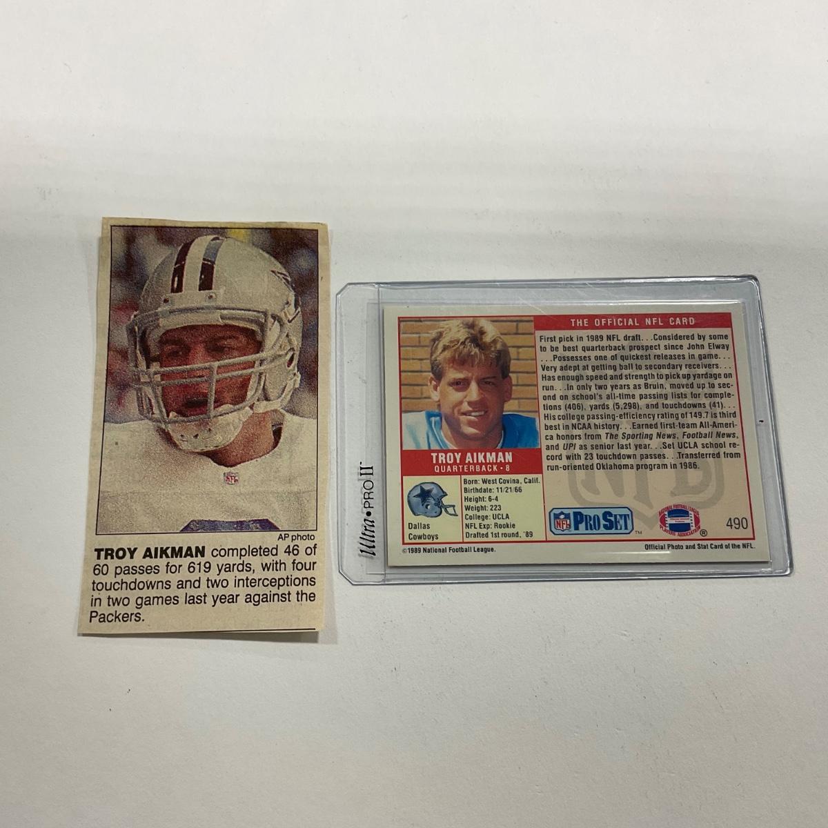 One 1989 Troy Aikman Cowboys #490 Card. Please see photos for details and condition. ::: Shipping is available on this lot. If you require shipping you must let us know at the close of the auction. We will coordinate with you after the item has been won. Shipping fees will include insurance up to or exceeding the value of all items being mailed. If you have any questions regarding this lot please contact the auctioneer either via this website, by direct email or by phone. PICK UP TIMES and other important information can be found in the TERMS and DESCRIPTION of the auction. Please take a look for pertinent information. Thanks!