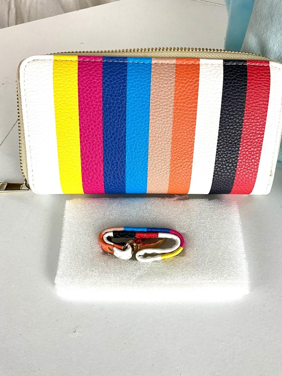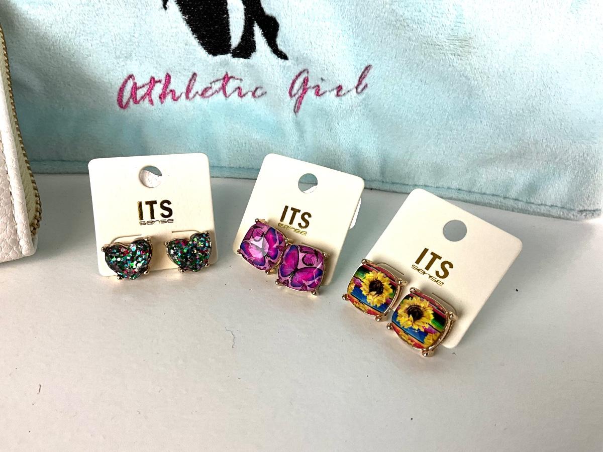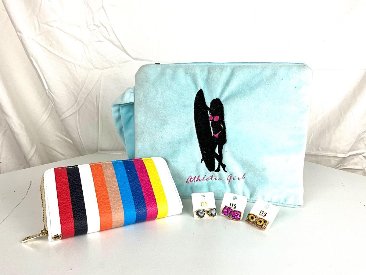165 Swim Suit Bag with Multi Colored Clutch, and Three Pairs of Floral Earrings
