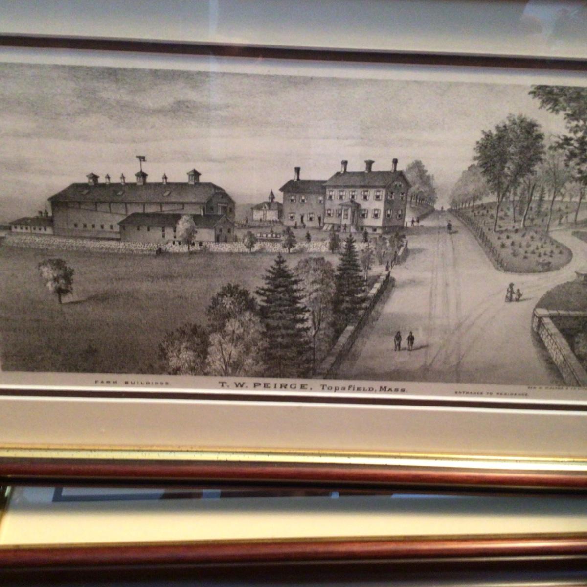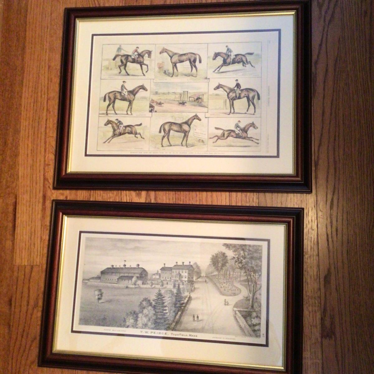 The horse lithograph is matted and framed and measures 16” x 21” and the Topfield Massachussets lithograph is 13” x 20.5”.