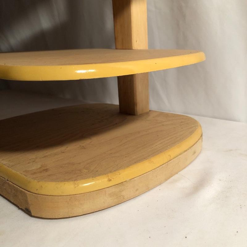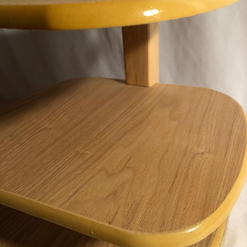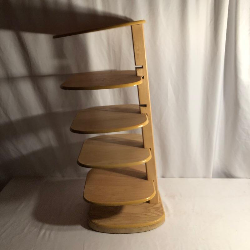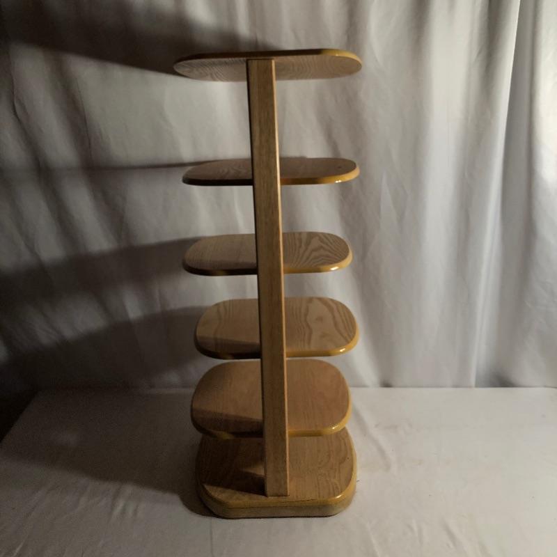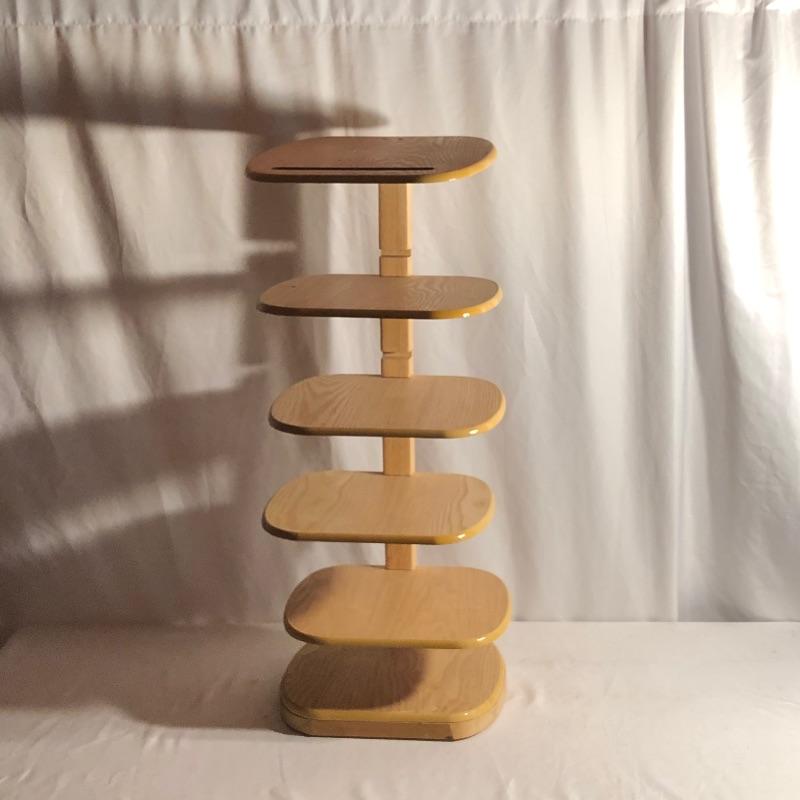 This smooth, light-colored stained wooden shelf (11” x 11” x 29.5”) is small, convenient, and good for multiple different uses! You can put it in a bedroom or office space for organization purposes! Each shelf can come out and be adjusted higher or lower. Local pickup only.