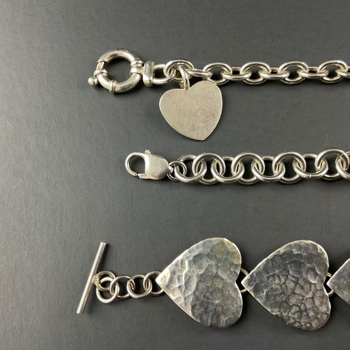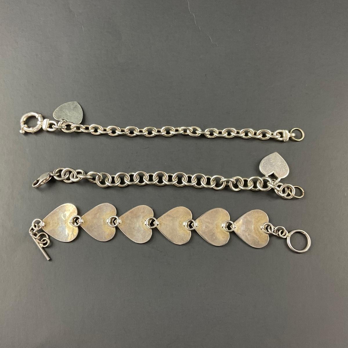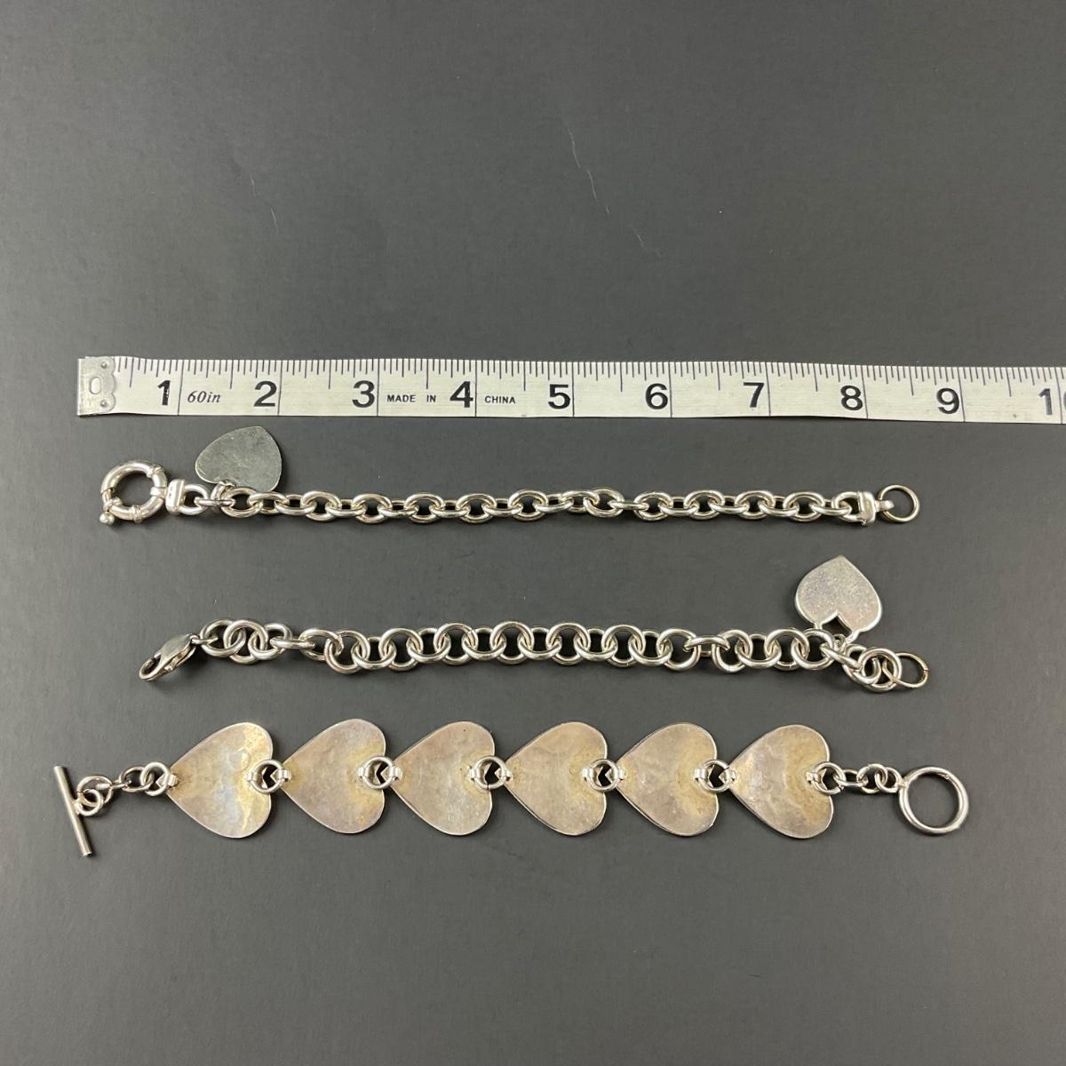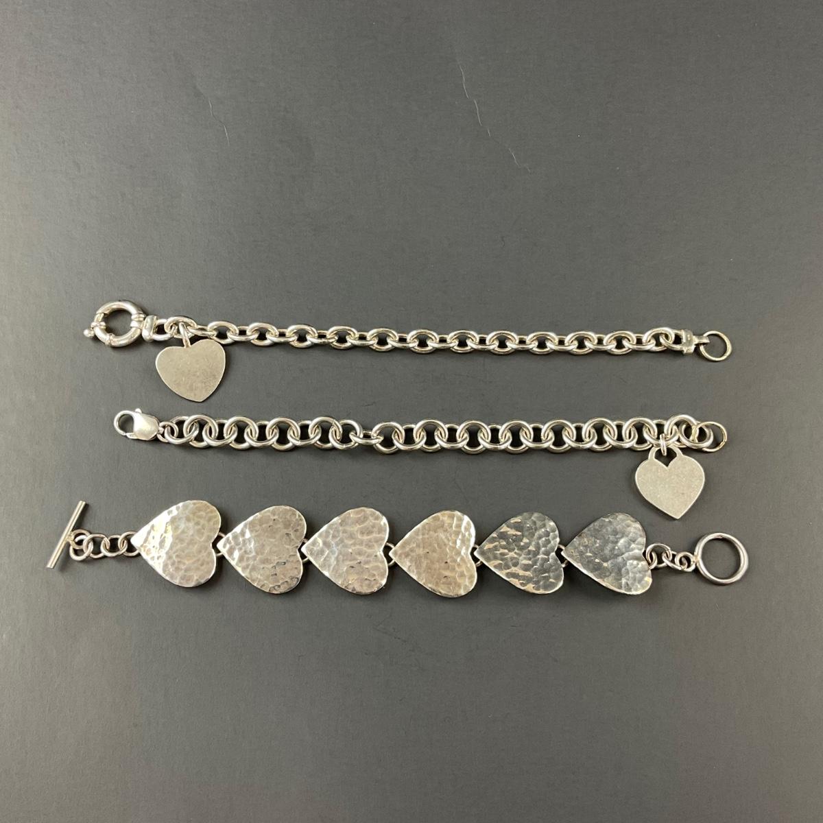 Three unmarked sterling silver heart bracelets. Total weight of all three bracelets is 99 grams. This piece has no damage, and appears to be in great shape with no visable chips, cracks, or broken pieces. Please see photos for details and condition. Any condition statement is given as a courtesy to a client, is an opinion, and should not be treated as a statement of fact. Reference to condition written, oral or within a condition report shall not be regarded as a full account of condition and may not include all defects, alterations, or restorations. Absence of a condition report does not imply a lot is flawless or lacking imperfections or damage. Katherine’s Auction & Appraisal Service shall have no responsibility for any error or omission. Returns shall not be accepted on the basis of condition. ::: Shipping is available on this lot. If you require shipping you must let us know at the close of the auction. We will coordinate with you after the item has been won. Shipping fees will include insurance up to or exceeding the value of all items being mailed. If you have any questions regarding this lot please contact the auctioneer either via this website, by direct email or by phone. PICK UP TIMES and other important information can be found in the TERMS and DESCRIPTION of the auction. Please take a look for pertinent information. Thanks!