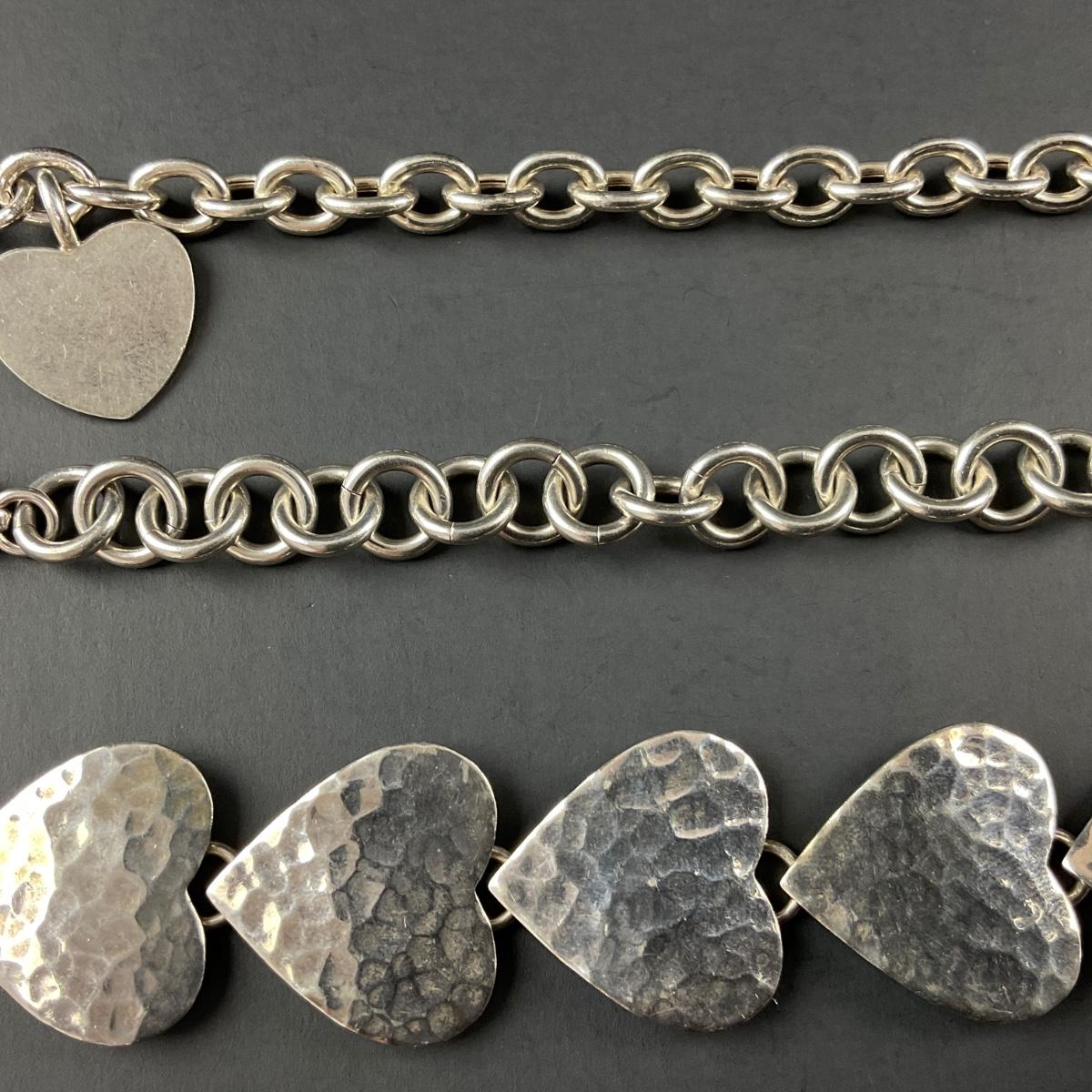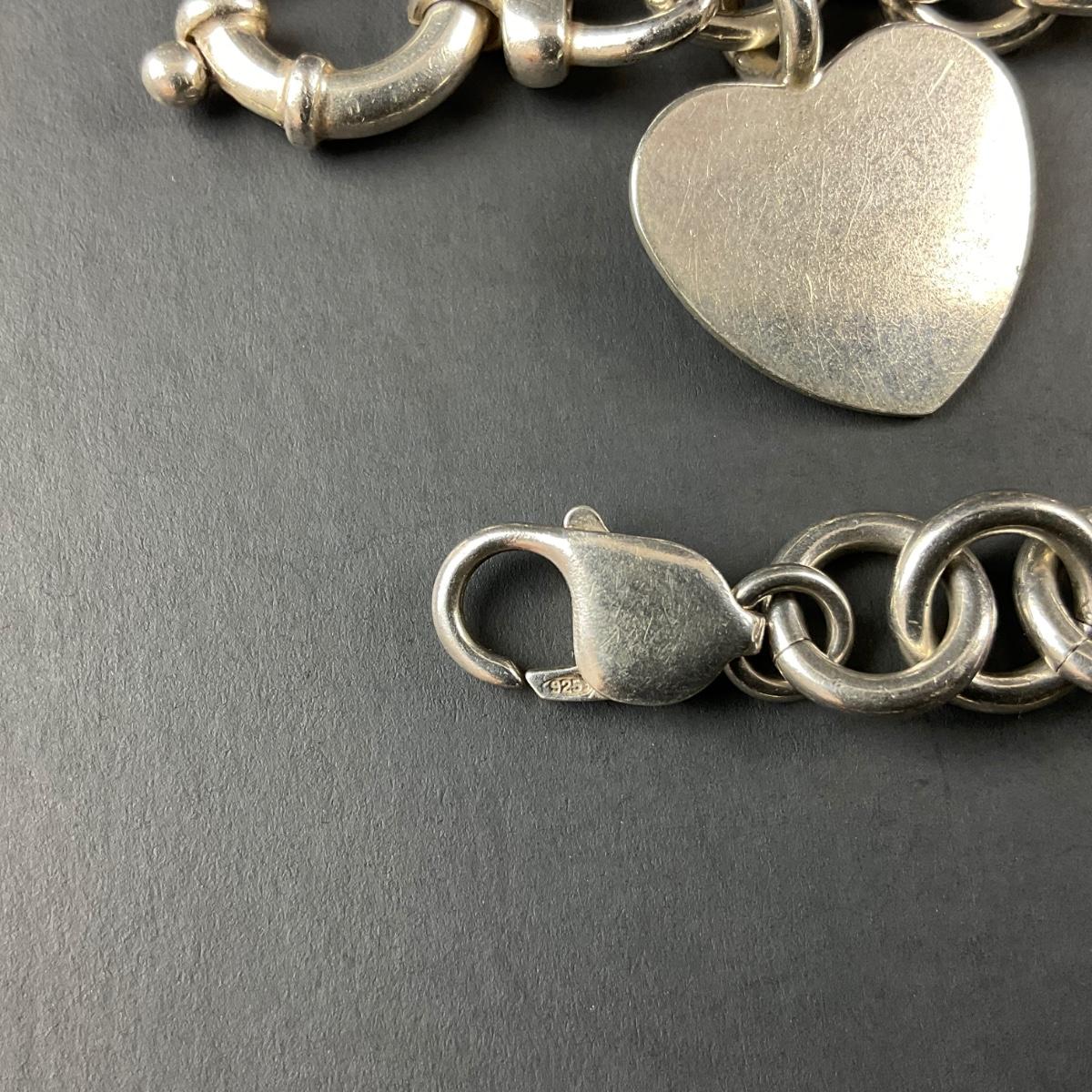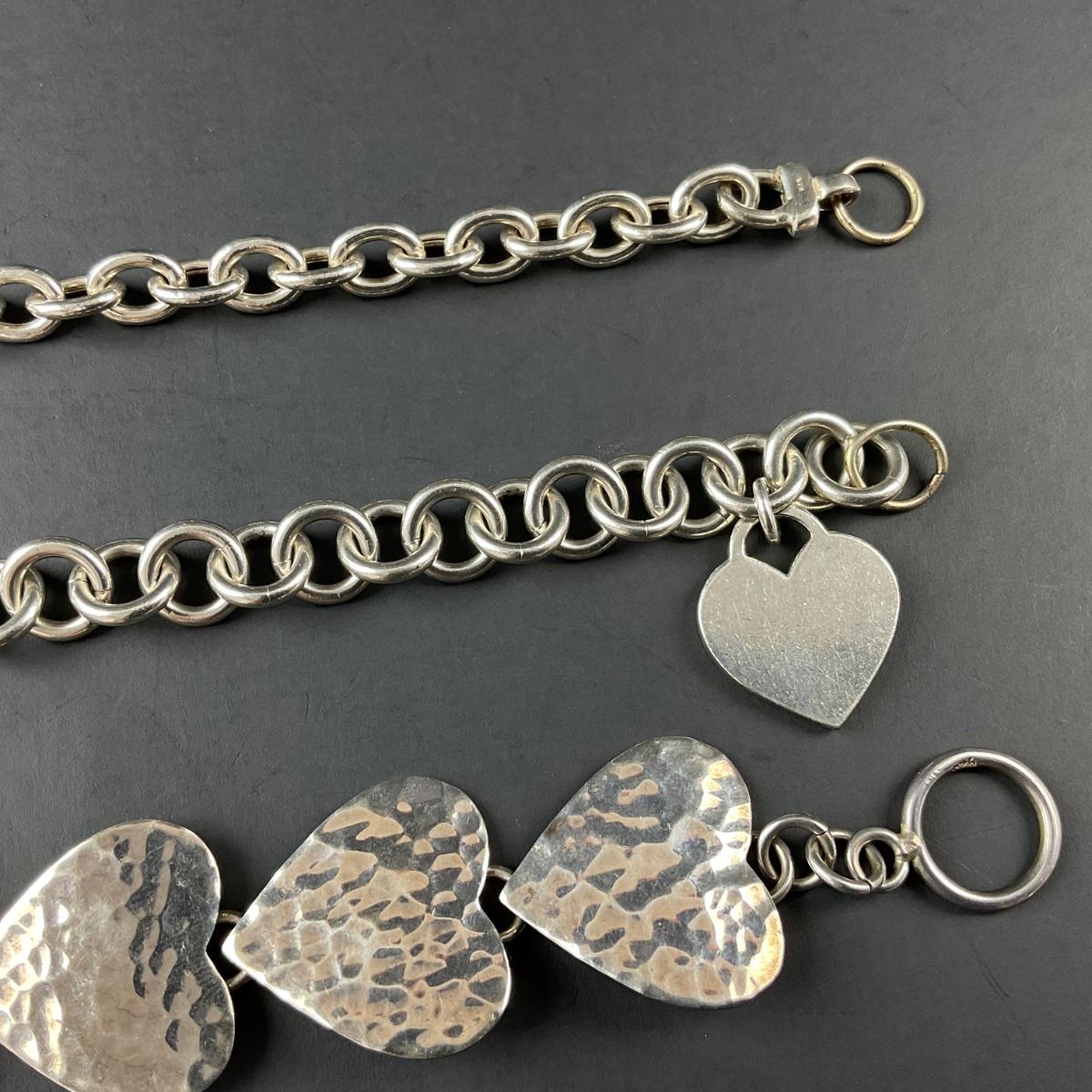 Three unmarked sterling silver heart bracelets. Total weight of all three bracelets is 99 grams. This piece has no damage, and appears to be in great shape with no visable chips, cracks, or broken pieces. Please see photos for details and condition. Any condition statement is given as a courtesy to a client, is an opinion, and should not be treated as a statement of fact. Reference to condition written, oral or within a condition report shall not be regarded as a full account of condition and may not include all defects, alterations, or restorations. Absence of a condition report does not imply a lot is flawless or lacking imperfections or damage. Katherine’s Auction & Appraisal Service shall have no responsibility for any error or omission. Returns shall not be accepted on the basis of condition. ::: Shipping is available on this lot. If you require shipping you must let us know at the close of the auction. We will coordinate with you after the item has been won. Shipping fees will include insurance up to or exceeding the value of all items being mailed. If you have any questions regarding this lot please contact the auctioneer either via this website, by direct email or by phone. PICK UP TIMES and other important information can be found in the TERMS and DESCRIPTION of the auction. Please take a look for pertinent information. Thanks!