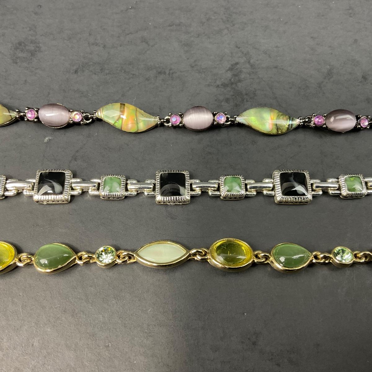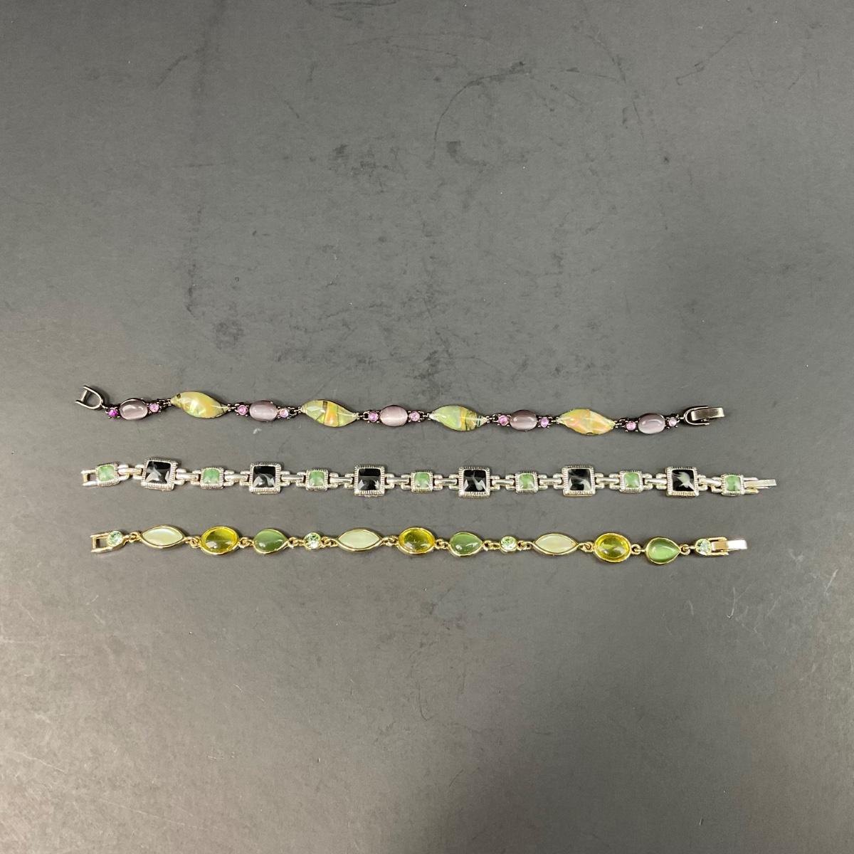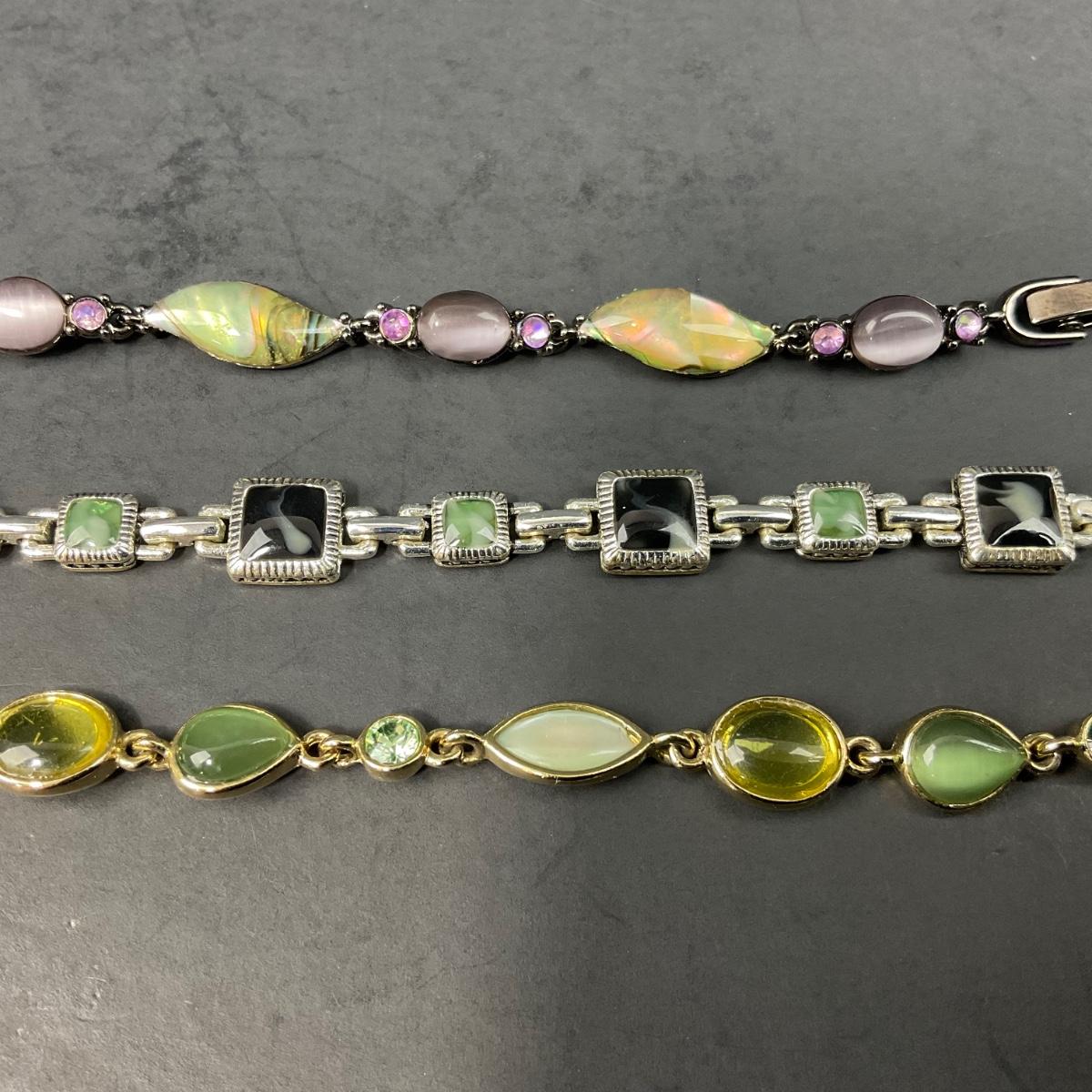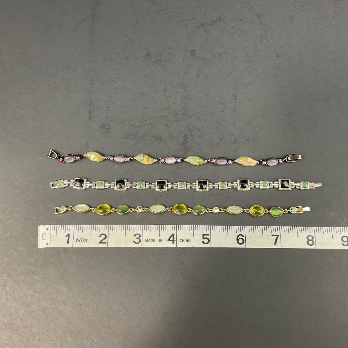 Three vintage assorted colored bracelets. Please see photos for details and condition. Any condition statement is given as a courtesy to a client, is an opinion, and should not be treated as a statement of fact. Reference to condition written, oral or within a condition report shall not be regarded as a full account of condition and may not include all defects, alterations, or restorations. Absence of a condition report does not imply a lot is flawless or lacking imperfections or damage. Katherine’s Auction & Appraisal Service shall have no responsibility for any error or omission. Returns shall not be accepted on the basis of condition. ::: Shipping is available on this lot. If you require shipping you must let us know at the close of the auction. We will coordinate with you after the item has been won. Shipping fees will include insurance up to or exceeding the value of all items being mailed. If you have any questions regarding this lot please contact the auctioneer either via this website, by direct email or by phone. PICK UP TIMES and other important information can be found in the TERMS and DESCRIPTION of the auction. Please take a look for pertinent information. Thanks!