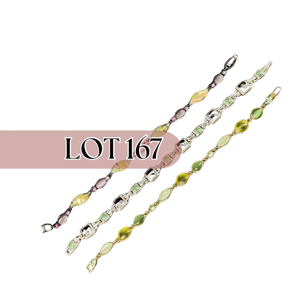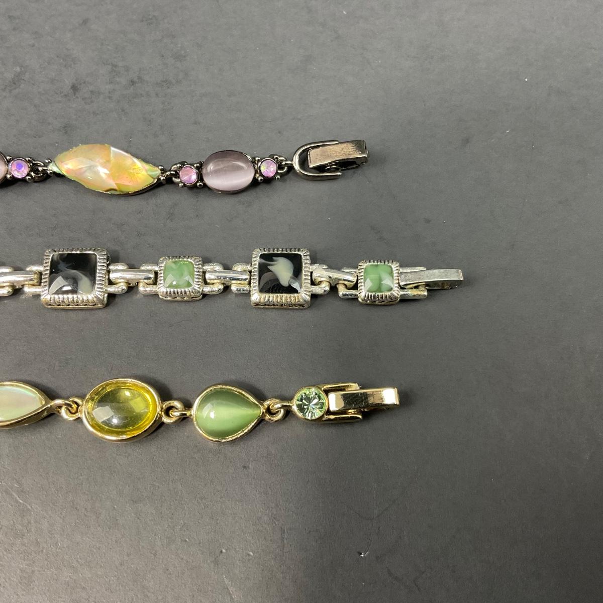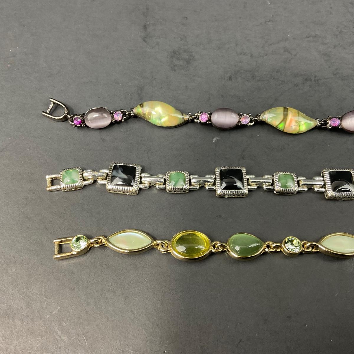 Three vintage assorted colored bracelets. Please see photos for details and condition. Any condition statement is given as a courtesy to a client, is an opinion, and should not be treated as a statement of fact. Reference to condition written, oral or within a condition report shall not be regarded as a full account of condition and may not include all defects, alterations, or restorations. Absence of a condition report does not imply a lot is flawless or lacking imperfections or damage. Katherine’s Auction & Appraisal Service shall have no responsibility for any error or omission. Returns shall not be accepted on the basis of condition. ::: Shipping is available on this lot. If you require shipping you must let us know at the close of the auction. We will coordinate with you after the item has been won. Shipping fees will include insurance up to or exceeding the value of all items being mailed. If you have any questions regarding this lot please contact the auctioneer either via this website, by direct email or by phone. PICK UP TIMES and other important information can be found in the TERMS and DESCRIPTION of the auction. Please take a look for pertinent information. Thanks!