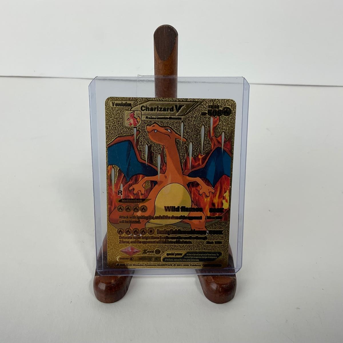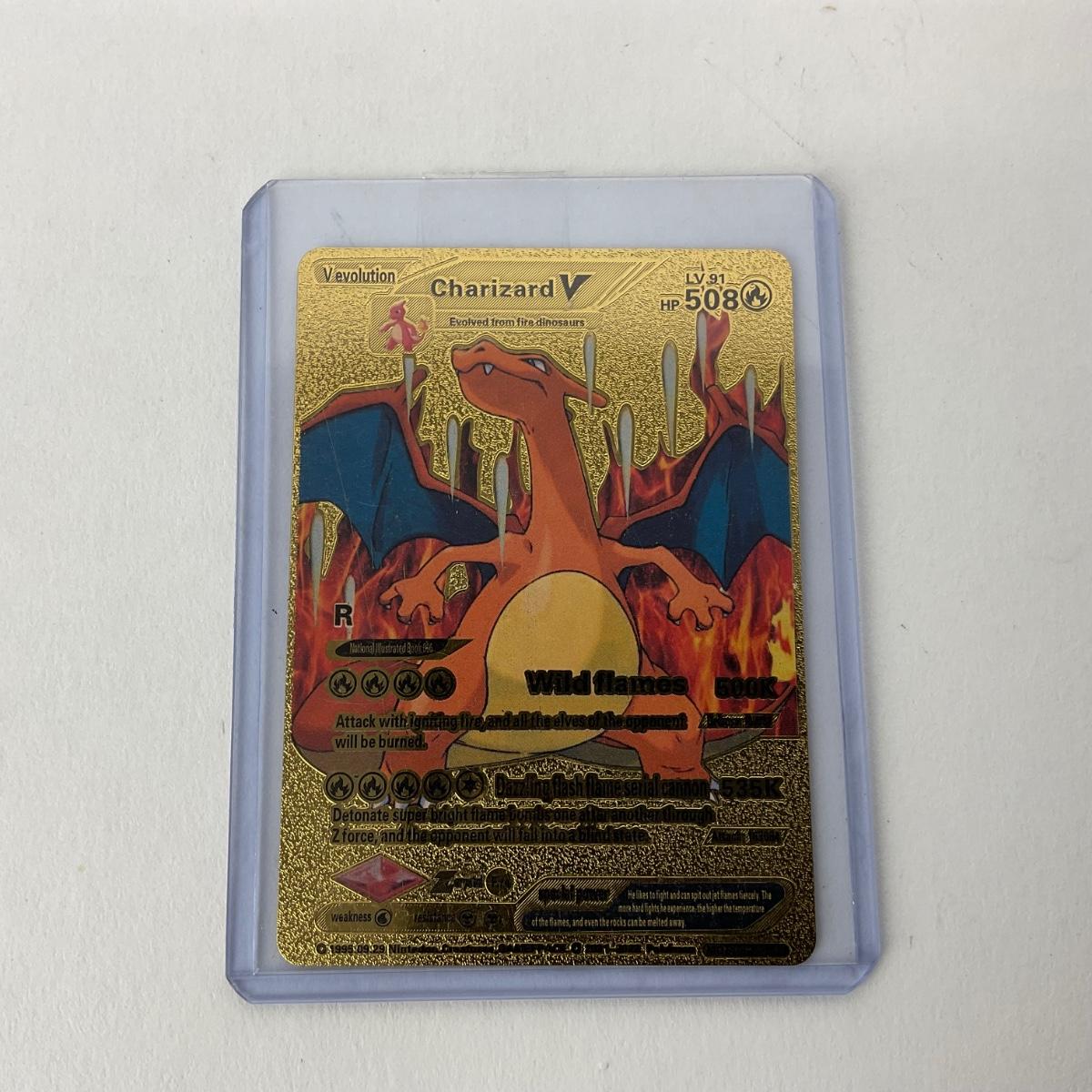 One Pokémon gold foil Charizard card in plastic sleeve. Please see photos for details and condition. ::: Shipping is available on this lot. If you require shipping you must let us know at the close of the auction. We will coordinate with you after the item has been won. Shipping fees will include insurance up to or exceeding the value of all items being mailed. If you have any questions regarding this lot please contact the auctioneer either via this website, by direct email or by phone. PICK UP TIMES and other important information can be found in the TERMS and DESCRIPTION of the auction. Please take a look for pertinent information. Thanks!
