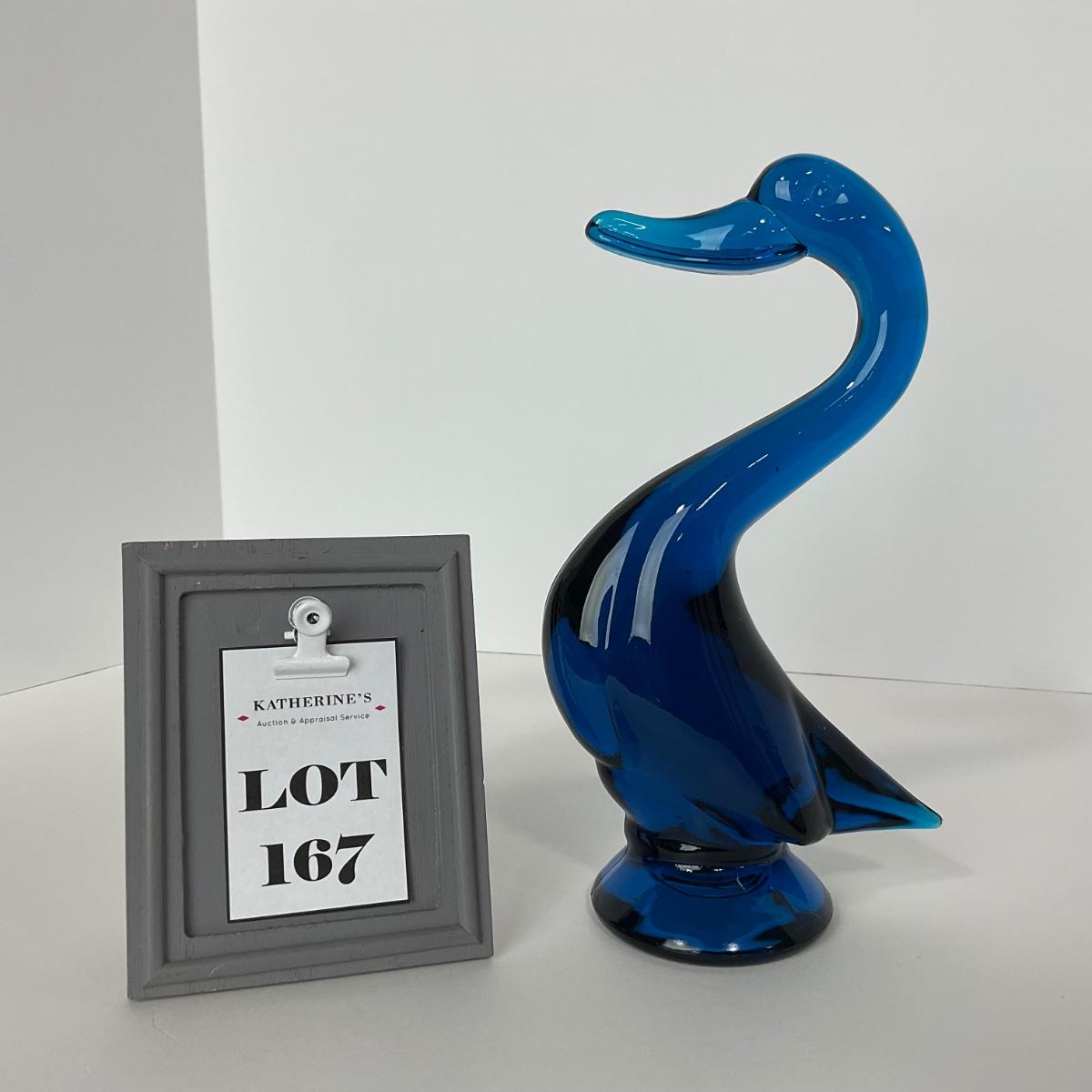 One Viking mid century bluenique duck with a curved neck 5 inches wide by 9 1/4 inches tall . This piece has no damage, and appears to be in great shape with no visable chips, cracks, or broken pieces. Please see photos for details and condition. Any condition statement is given as a courtesy to a client, is an opinion, and should not be treated as a statement of fact. Reference to condition written, oral or within a condition report shall not be regarded as a full account of condition and may not include all defects, alterations, or restorations. Absence of a condition report does not imply a lot is flawless or lacking imperfections or damage. Katherine’s Auction & Appraisal Service shall have no responsibility for any error or omission. Returns shall not be accepted on the basis of condition. ::: Shipping is available on this lot. If you require shipping you must let us know at the close of the auction. We will coordinate with you after the item has been won. Shipping fees will include insurance up to or exceeding the value of all items being mailed. If you have any questions regarding this lot please contact the auctioneer either via this website, by direct email or by phone. PICK UP TIMES and other important information can be found in the TERMS and DESCRIPTION of the auction. Please take a look for pertinent information. Thanks!