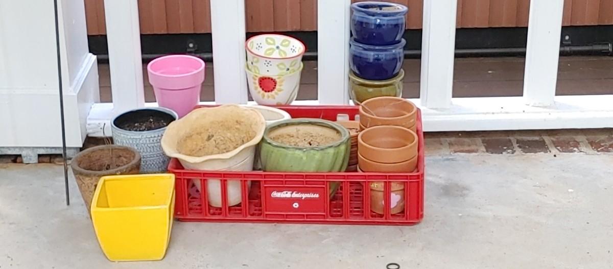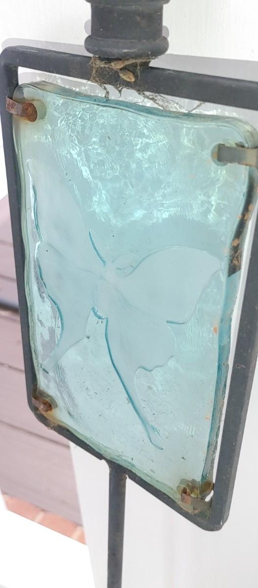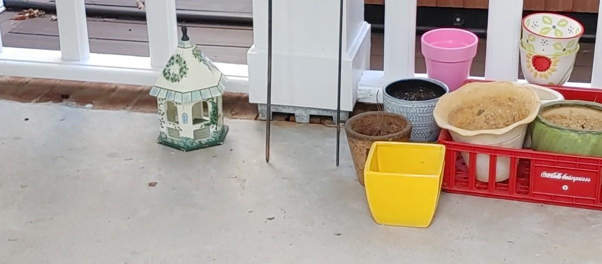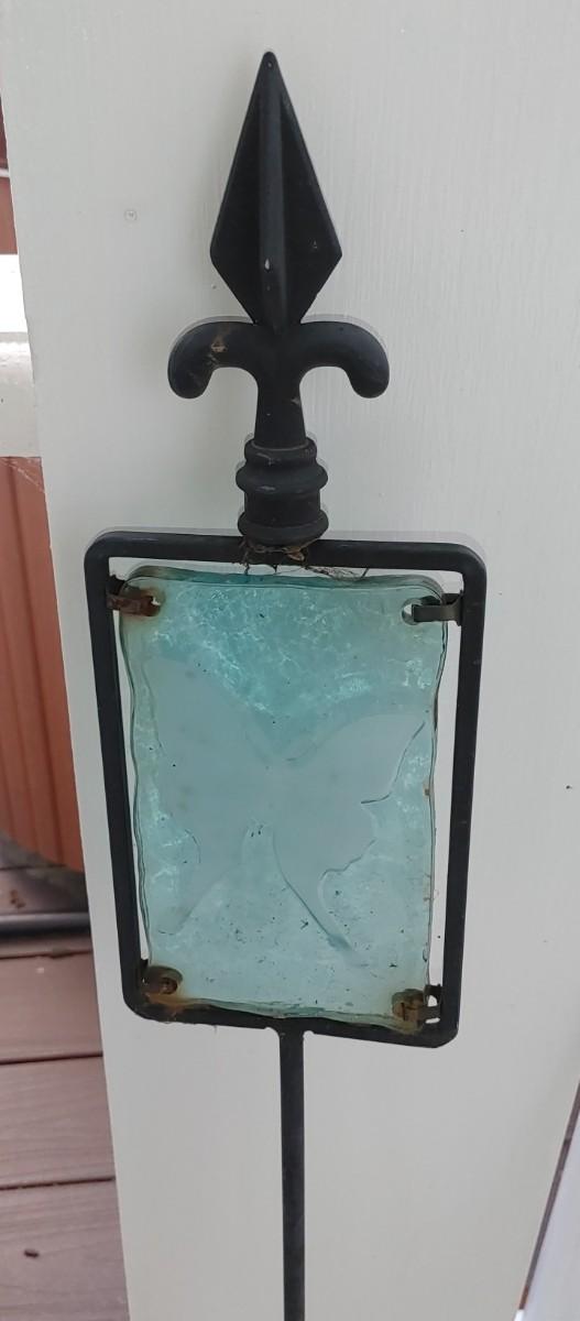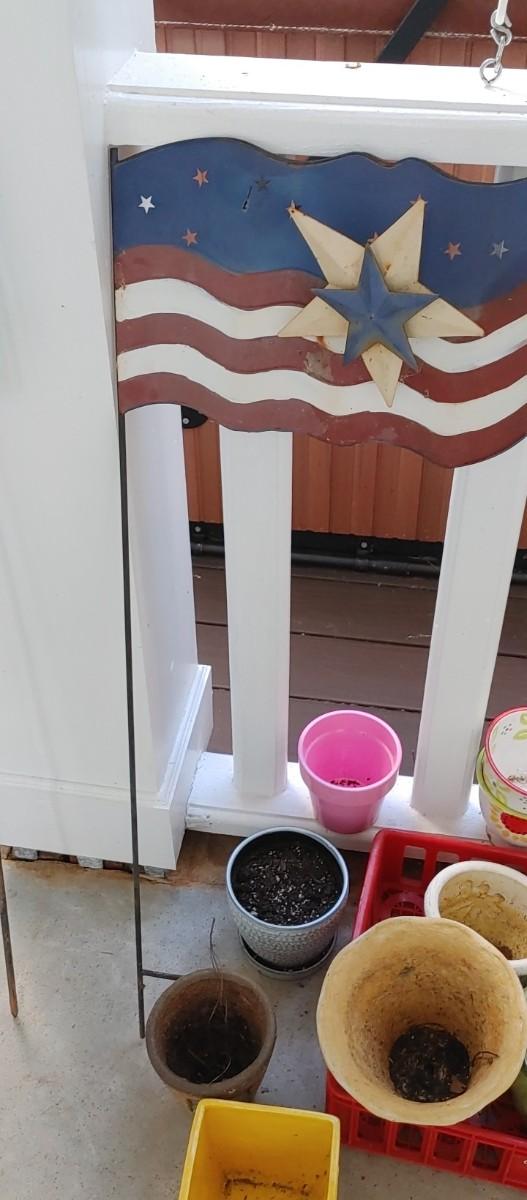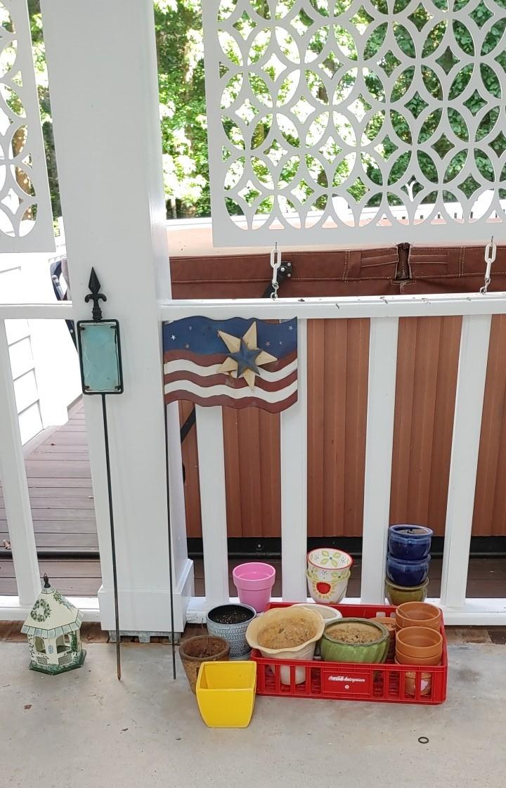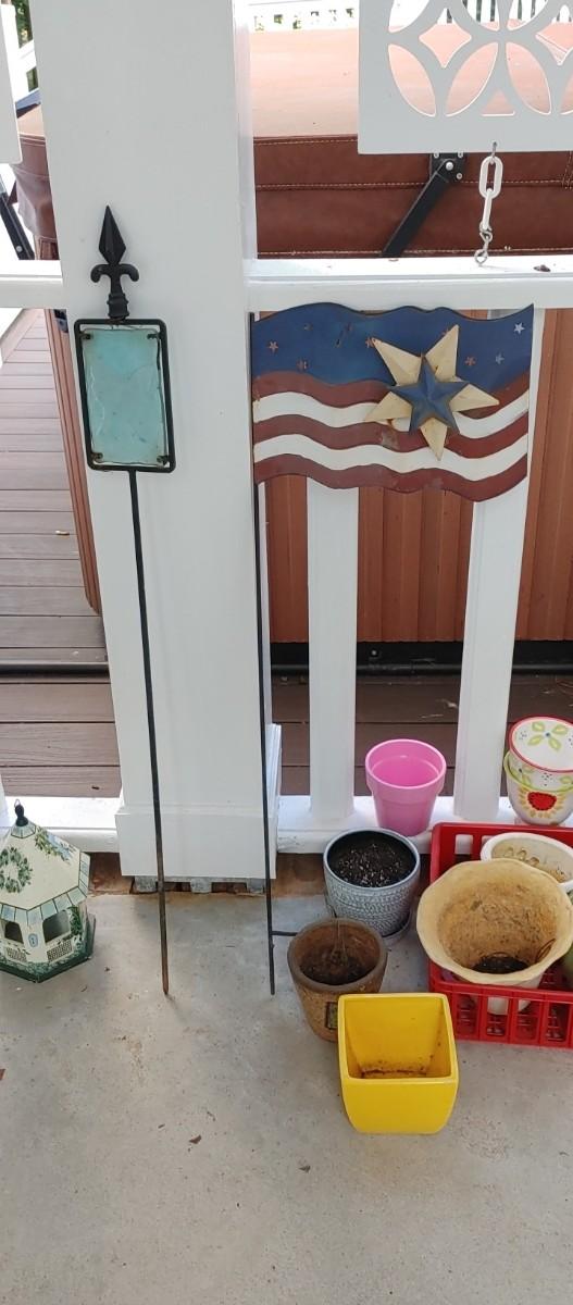 Beautiful butterfly glass fleur-de-lis Garden ornament plus large American flag for the Garden or yard beautiful brightly colored Planters and Many small terracotta pots pottery planters!