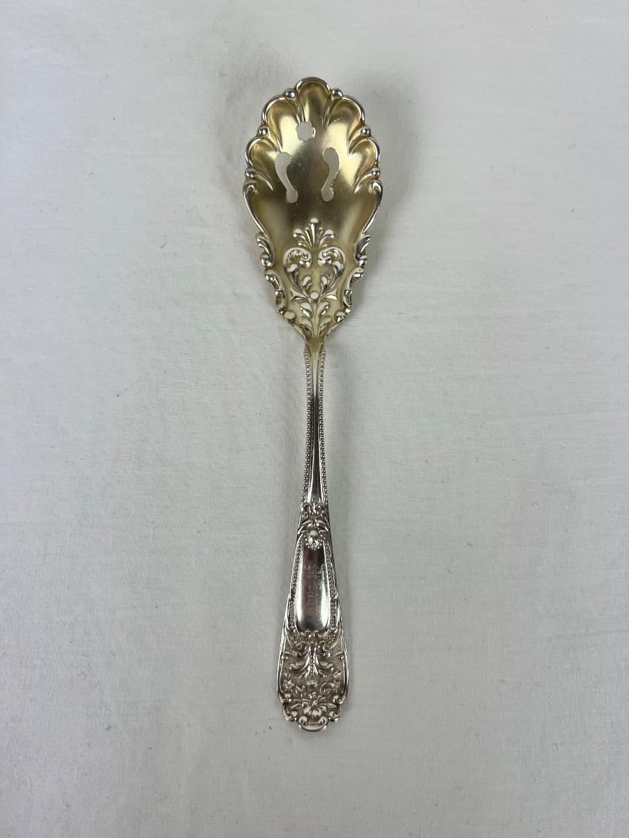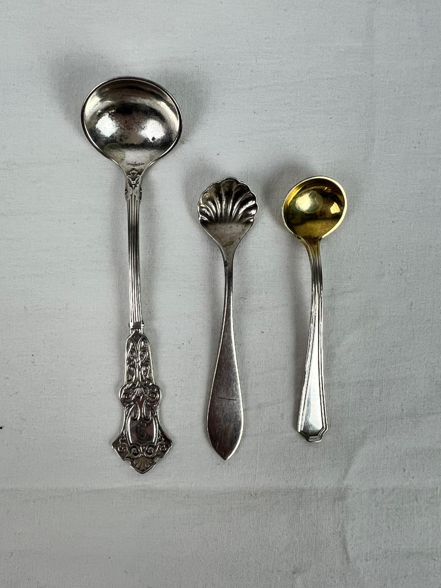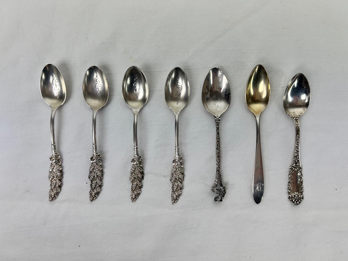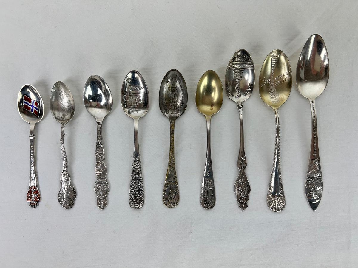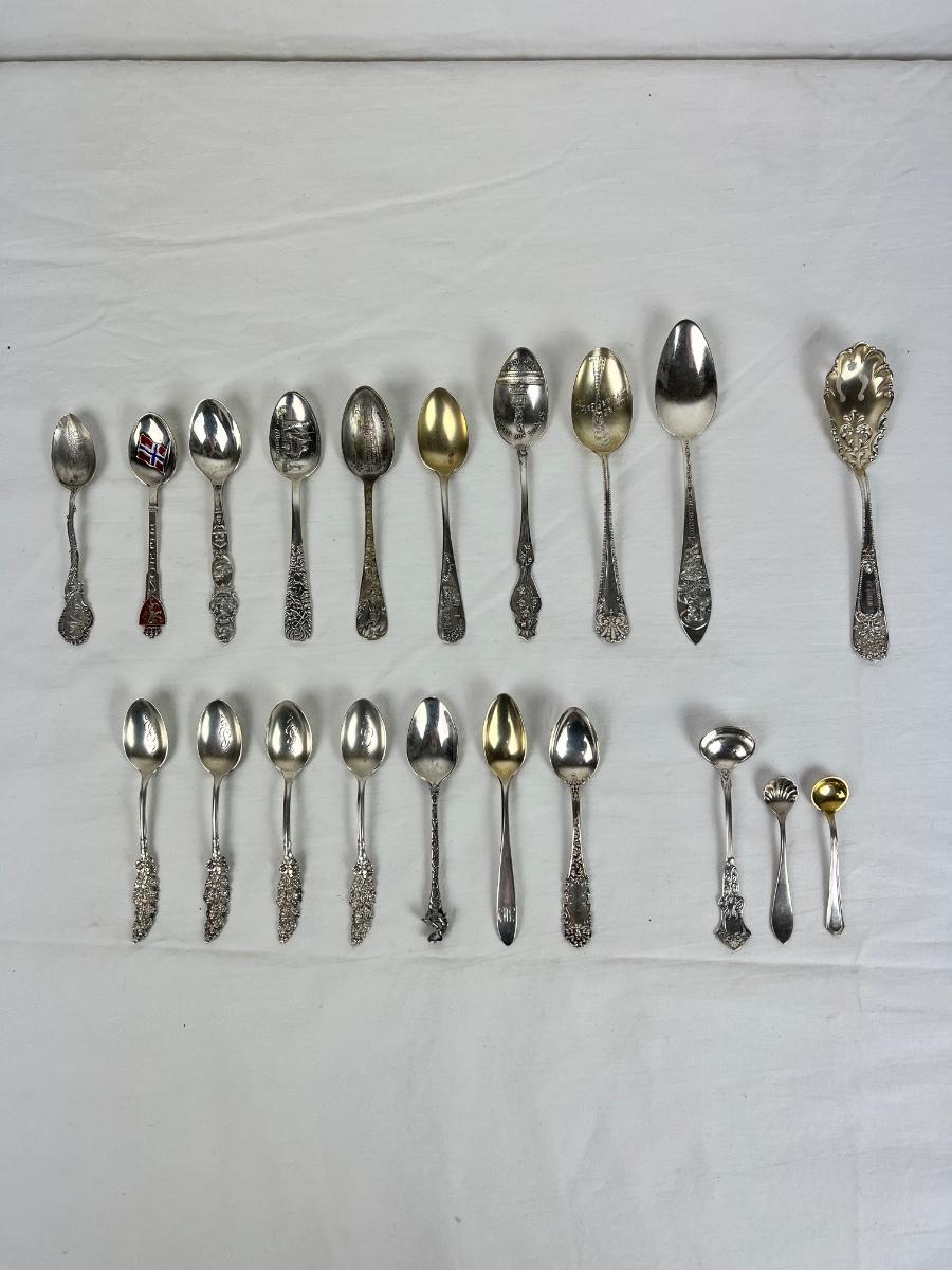 9 sterling souvenir spoons, 7 sterling demitasse, 3 sterling salt spoons, and a sterling olive spoon. Total of 20 spoons.