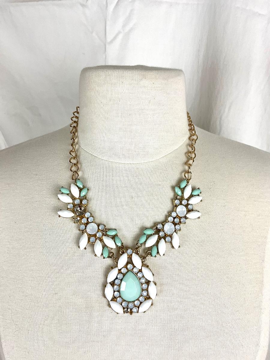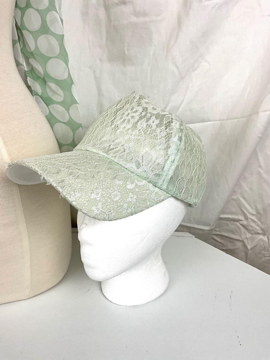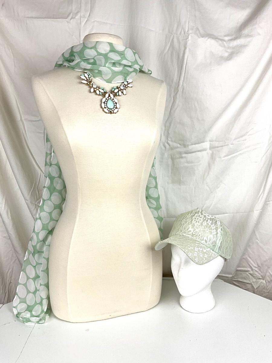White and mint green stone necklace , with mint green lace baseball cap and scarf