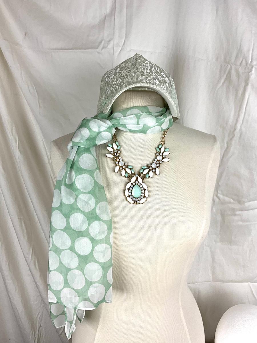 168 Mint Green & White Polka Dot Scarf with Statement Necklace and Lace Cap