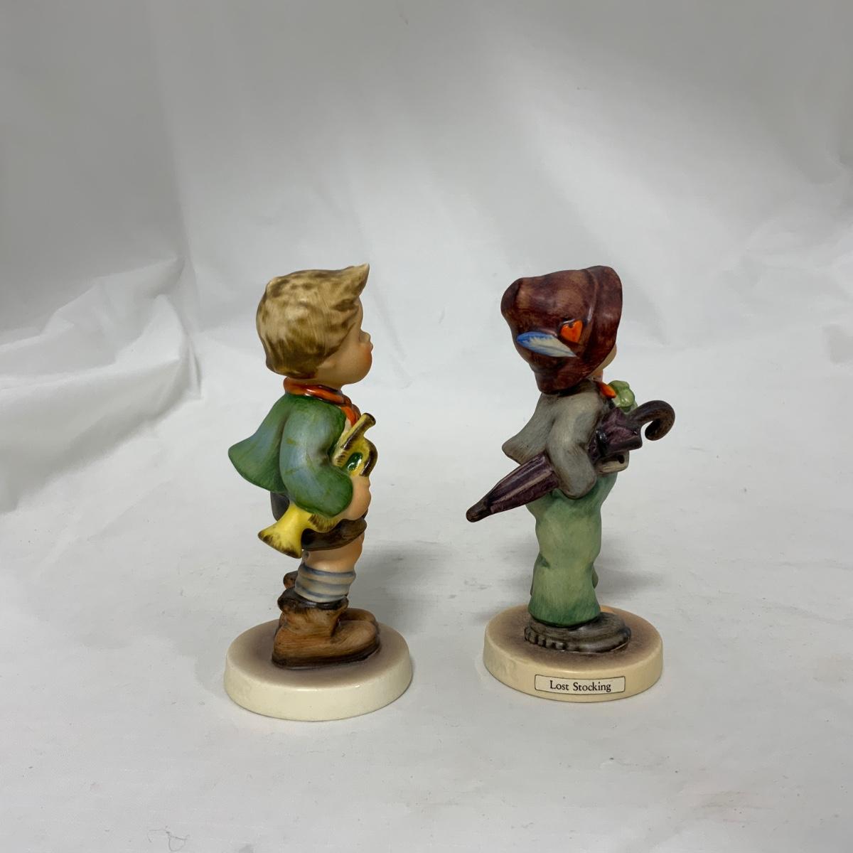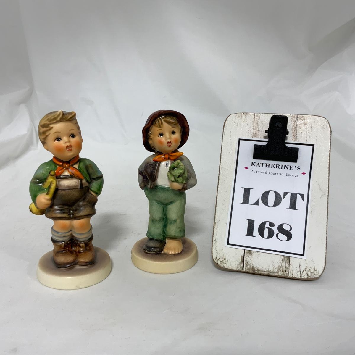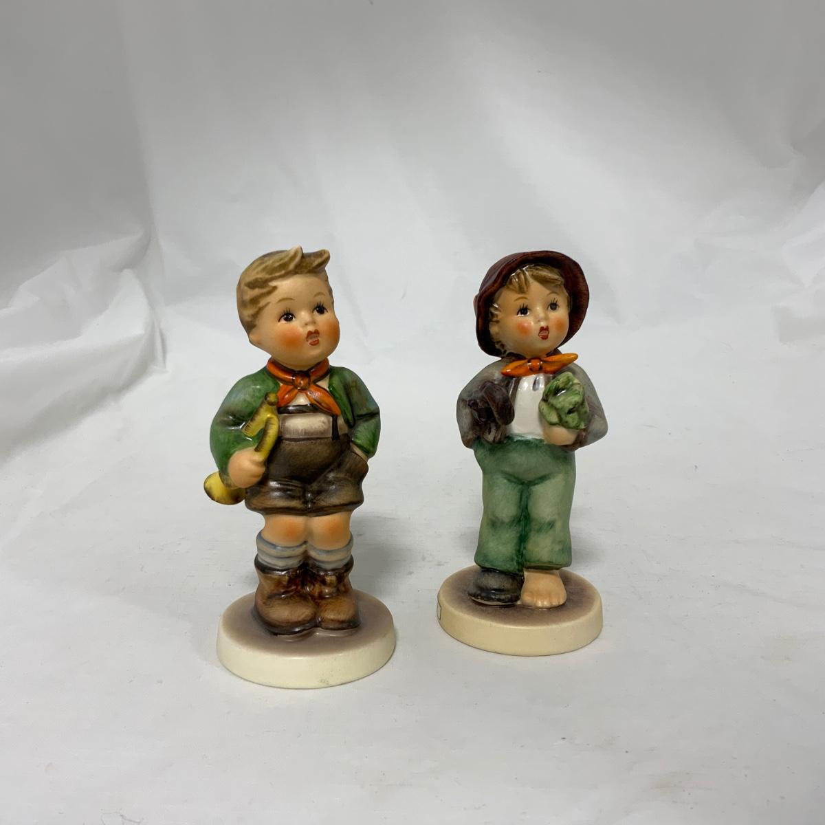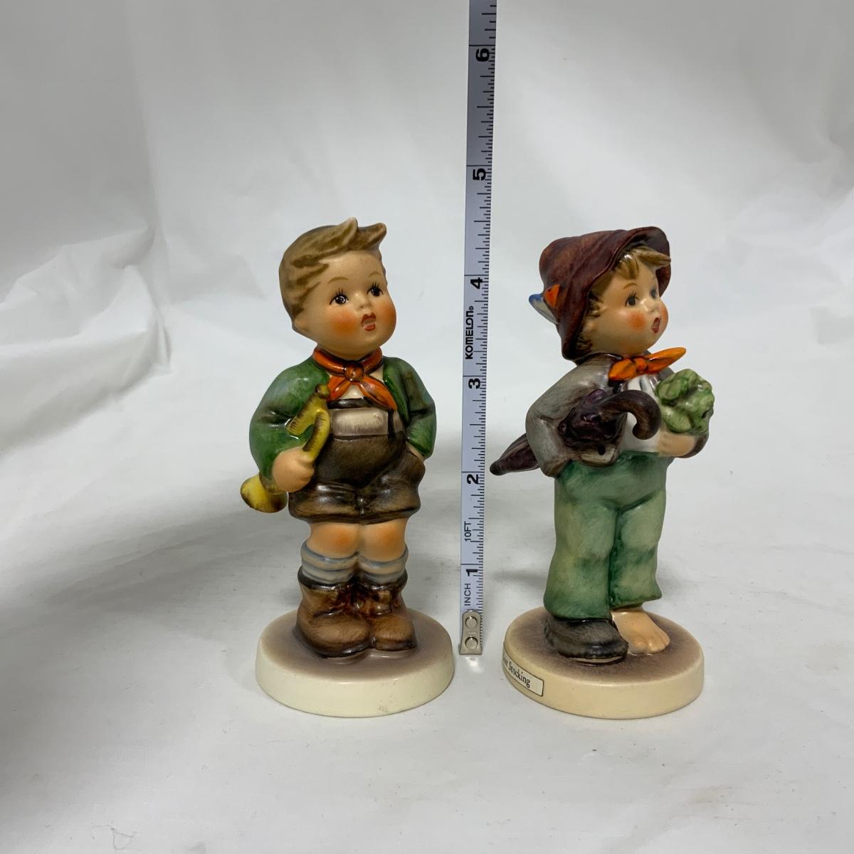 Two little boy Hummels. Trumpet Boy, Hum 97 - TMK-3. Lost Stocking, Hum 374 - TMK-5. Please see photos for details and condition. Crazing noted. ::: Shipping is available on this lot. If you require shipping you must let us know at the close of the auction. We will coordinate with you after the item has been won. Shipping fees will include insurance up to or exceeding the value of all items being mailed. If you have any questions regarding this lot please contact the auctioneer either via this website, by direct email or by phone. PICK UP TIMES and other important information can be found in the TERMS and DESCRIPTION of the auction. Please take a look for pertinent information. Thanks!