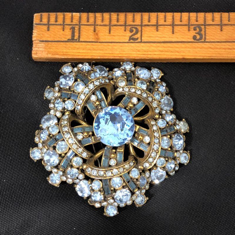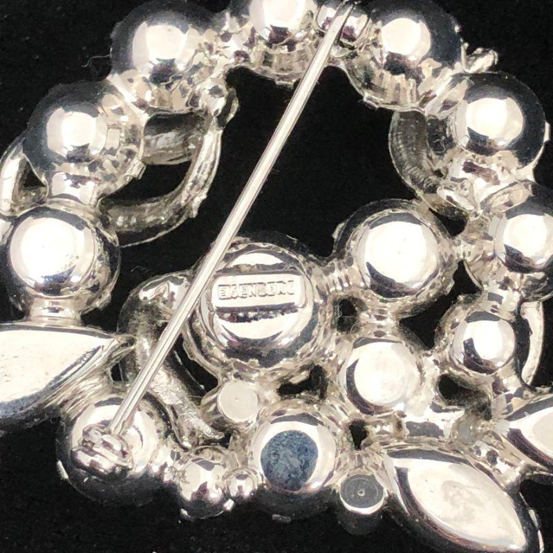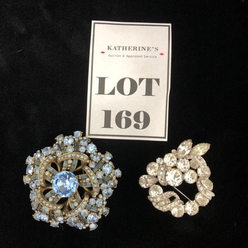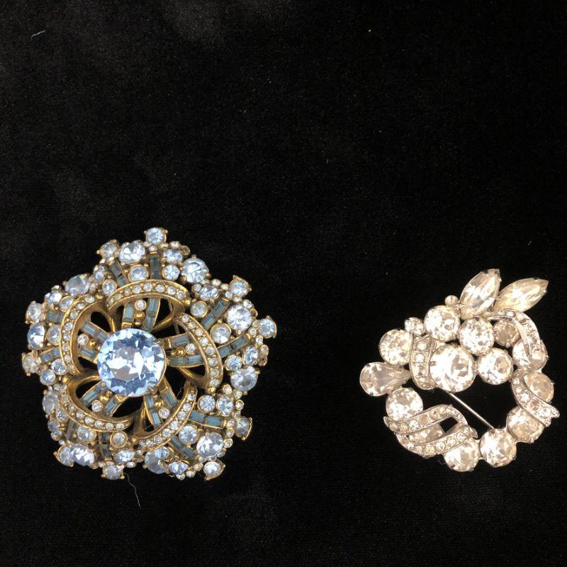 Holly Craft Blue Rhinestone Stone Brooch (1952 marked) & Eisenberg white rhinestone brooch (missing stones noted).