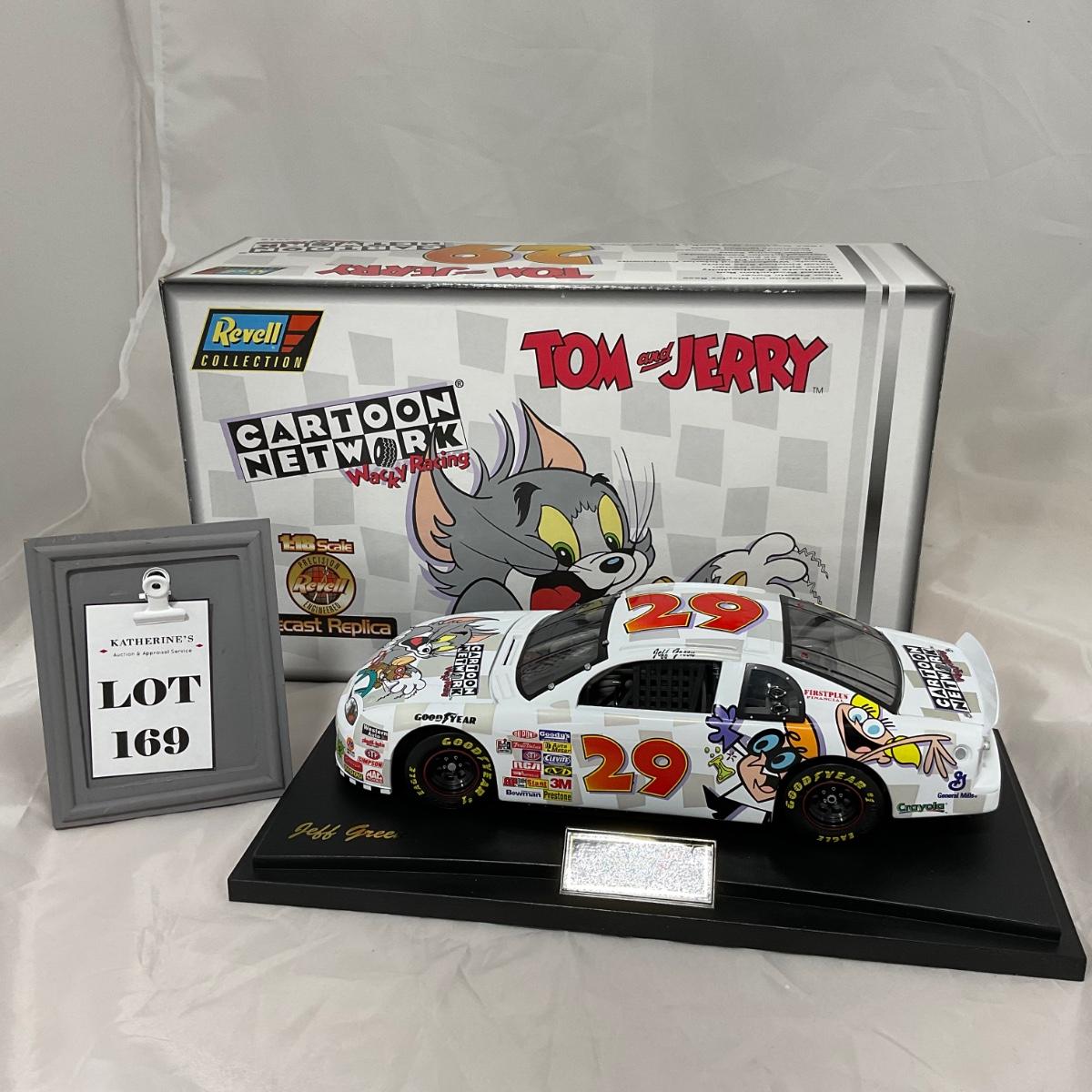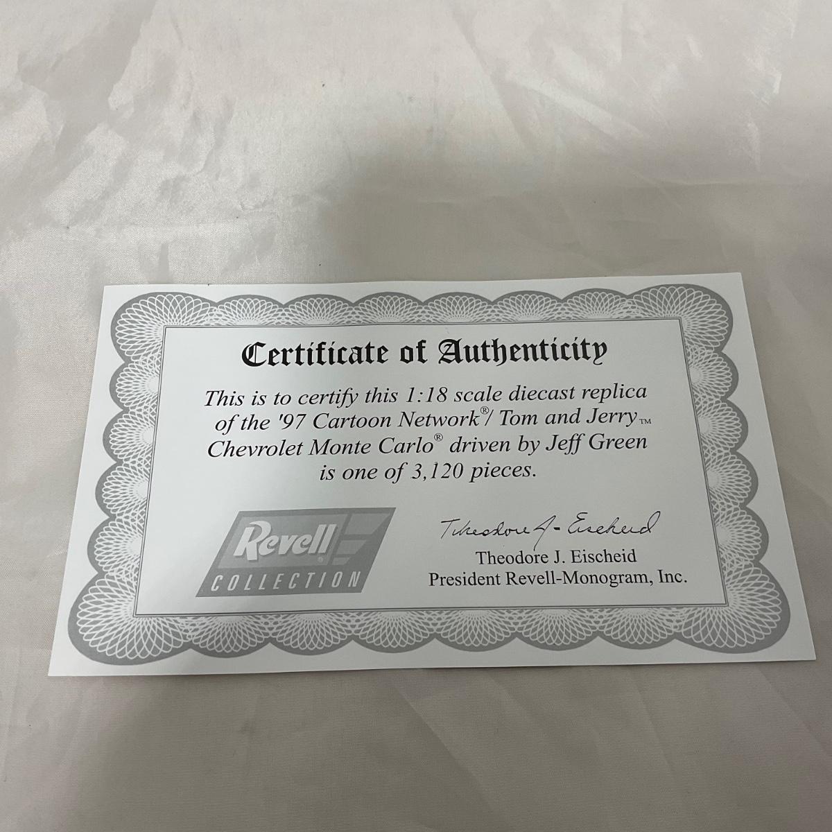 One NASCAR die cast 1:18 scale 1997 Cartoon Network Tom & Jerry Chevrolet Monte Carlo figure. Comes with a Certificate of Authenticity. Driver Jeff Green. Please see photos for details and condition. ::: Shipping is available on this lot. If you require shipping you must let us know at the close of the auction. We will coordinate with you after the item has been won. Shipping fees will include insurance up to or exceeding the value of all items being mailed. If you have any questions regarding this lot please contact the auctioneer either via this website, by direct email or by phone. PICK UP TIMES and other important information can be found in the TERMS and DESCRIPTION of the auction. Please take a look for pertinent information. Thanks!