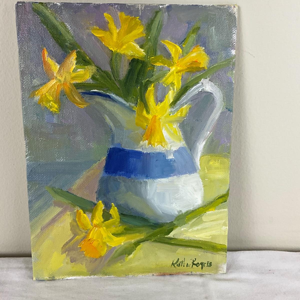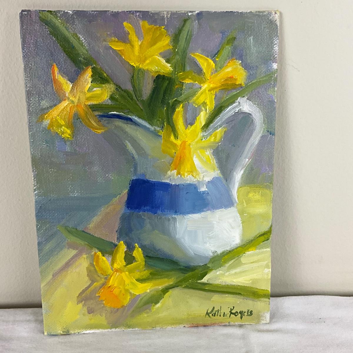 169 Original Oil Painting "Blue and White "Yellow Daffodils" by Kathie Rogers