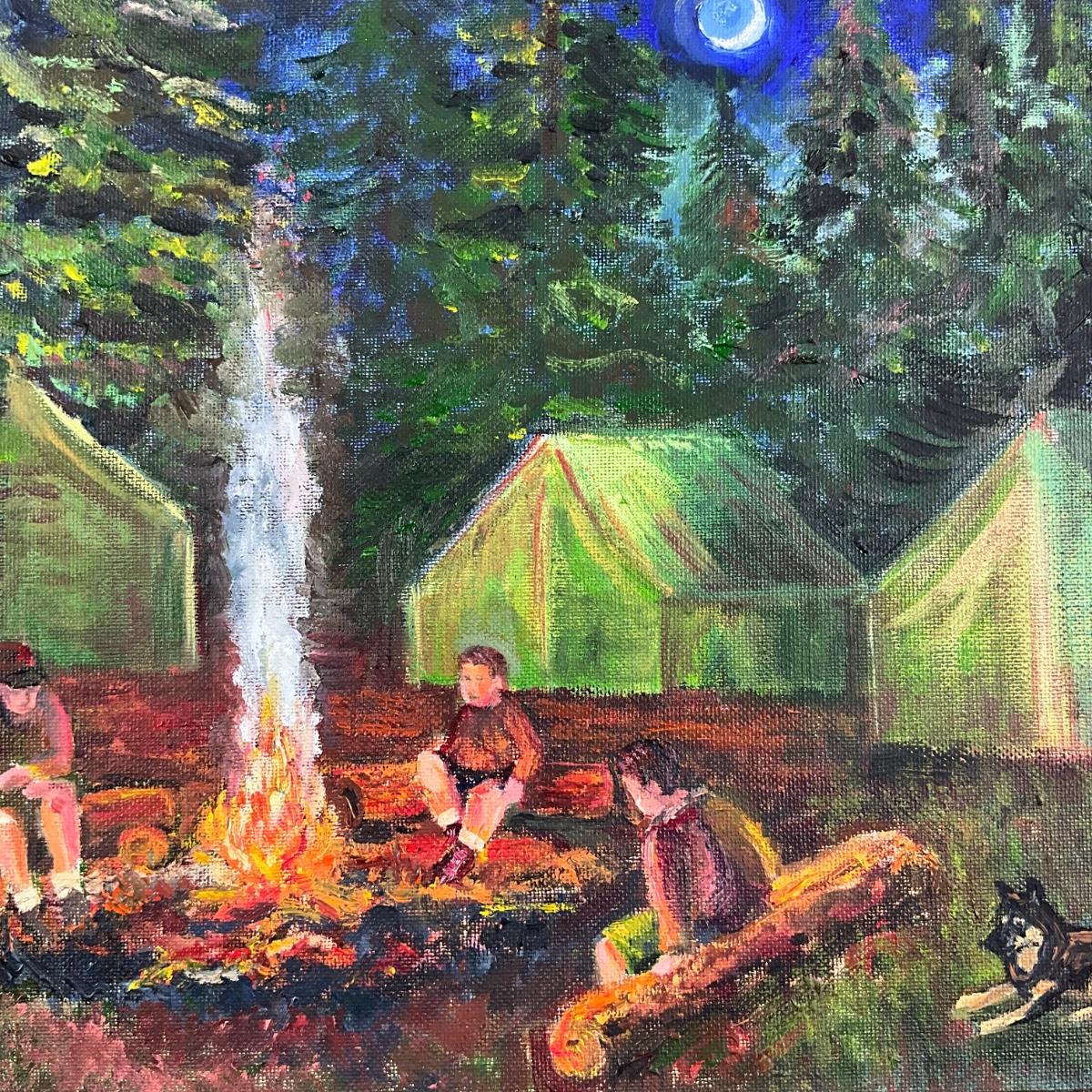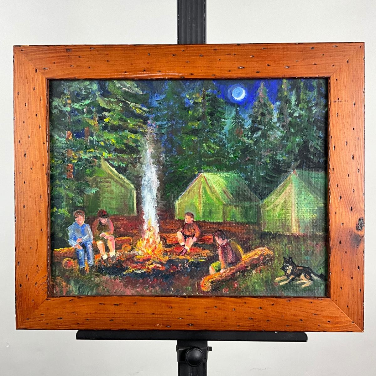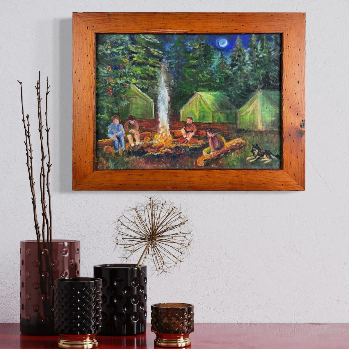071 Original Primitive Style Oil Painting "Bonfire At Summer Camp"