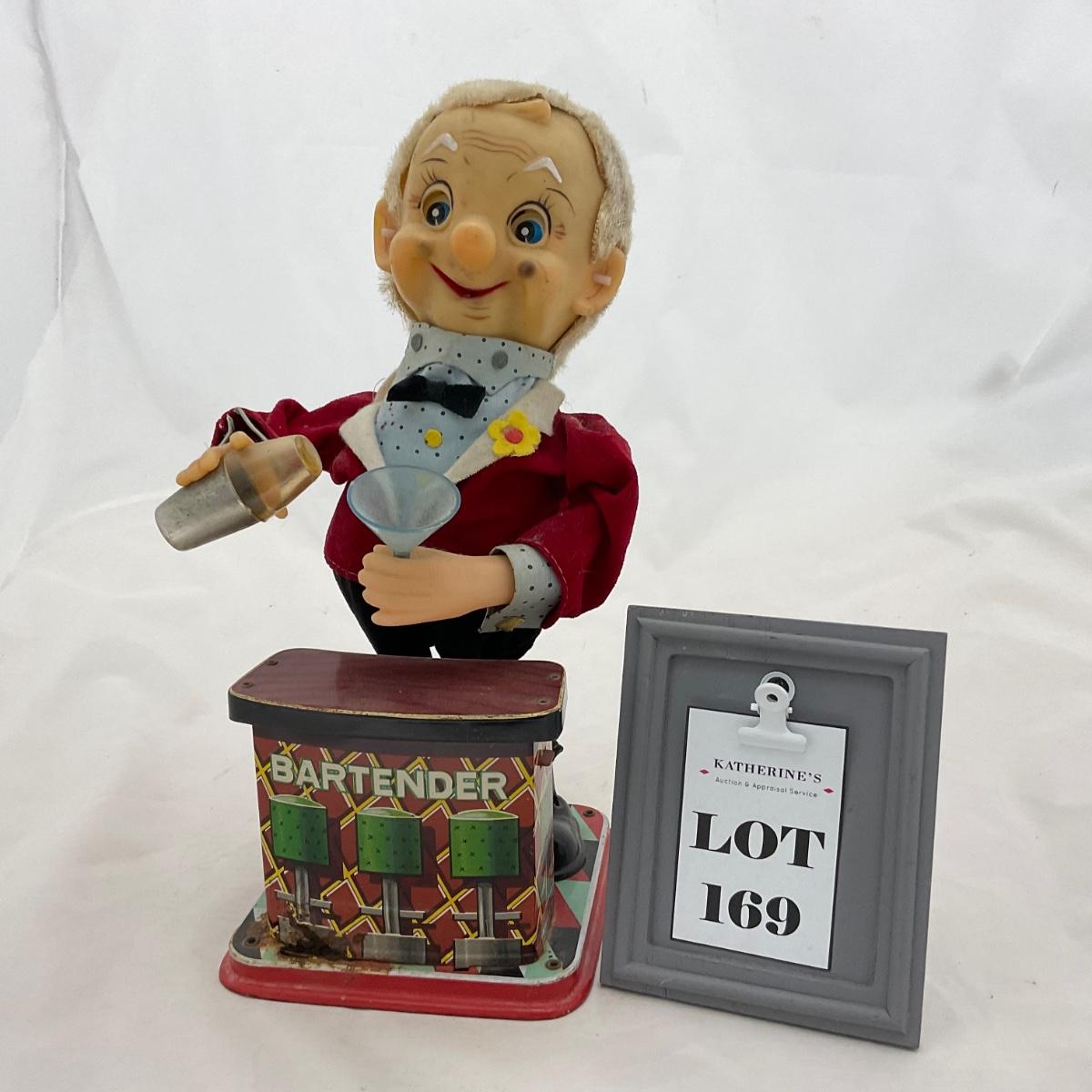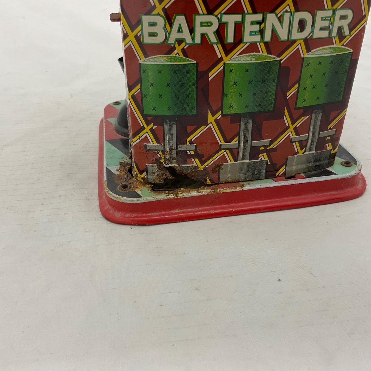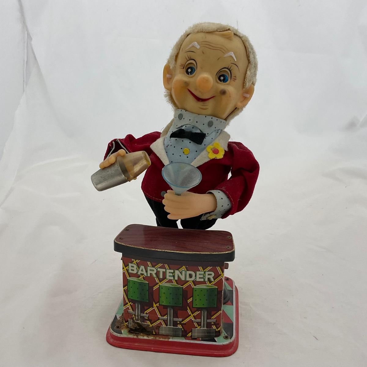 One vintage tine bartender toy. Unsure if in working order. Older toy with a lot of character. Please see photos for details and condition. ::: Shipping is available on this lot. If you require shipping you must let us know at the close of the auction. We will coordinate with you after the item has been won. Shipping fees will include insurance up to or exceeding the value of all items being mailed. If you have any questions regarding this lot please contact the auctioneer either via this website, by direct email or by phone. PICK UP TIMES and other important information can be found in the TERMS and DESCRIPTION of the auction. Please take a look for pertinent information. Thanks!