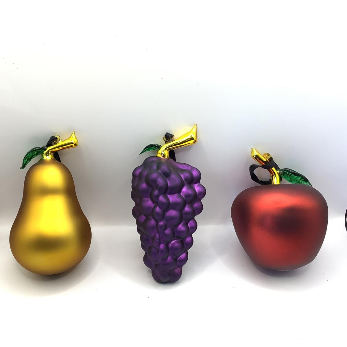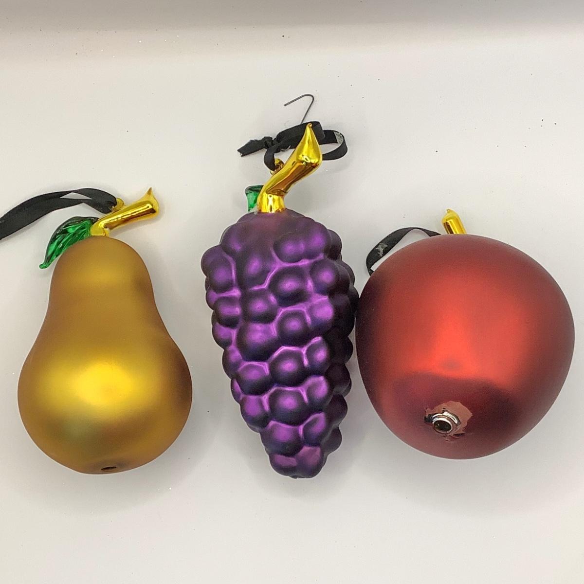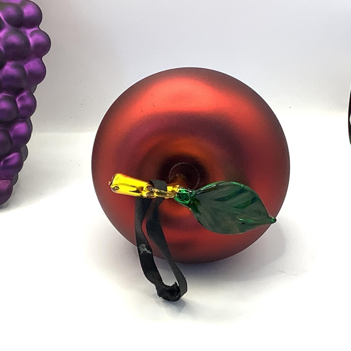 Apple is 3.5" round and has some paint chips on the bottom, grapes are 6" long, and pear is 4.5" high and all have glass leaves