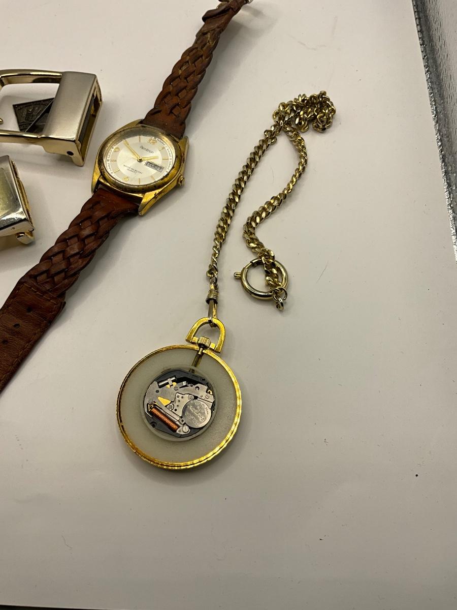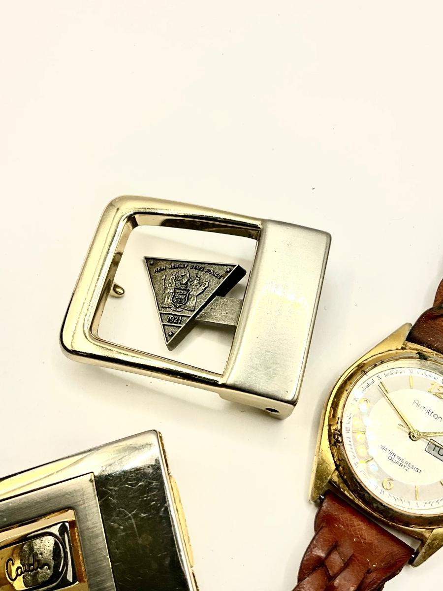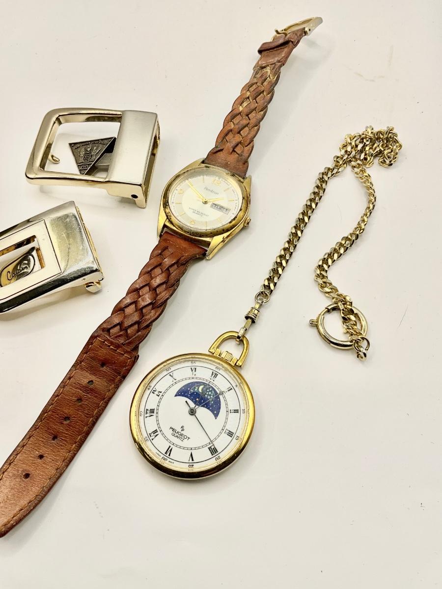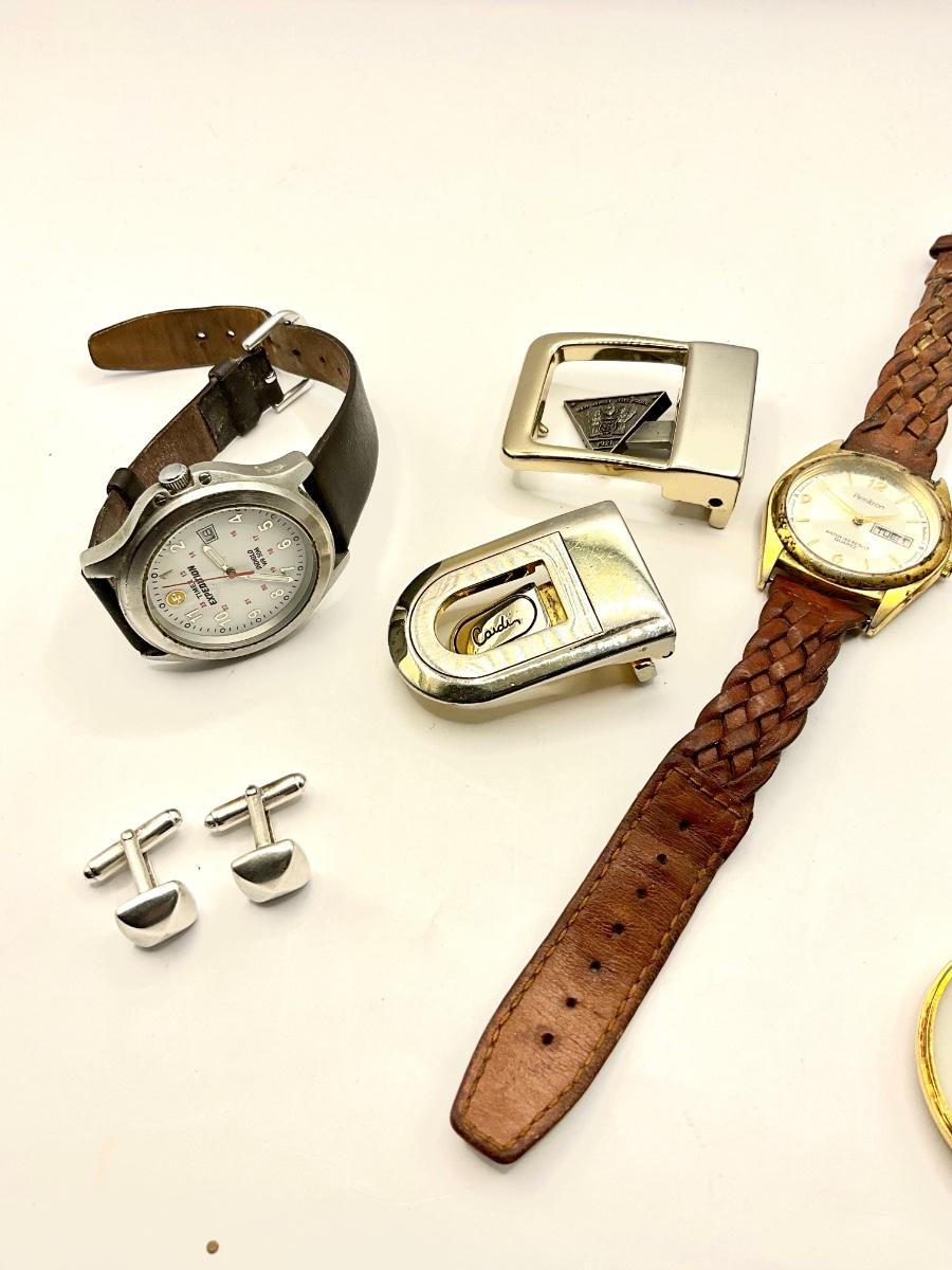 Pierre Cardin belt buckle, timex exhibition watch, armitron, peugeot pocket with missing back