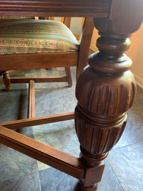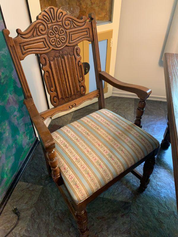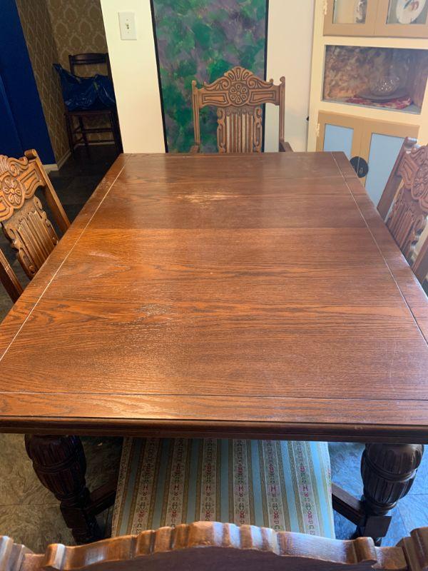 Antique English oak table & six chairs. Table top has a rough spot. One host chair & 5 side chairs,