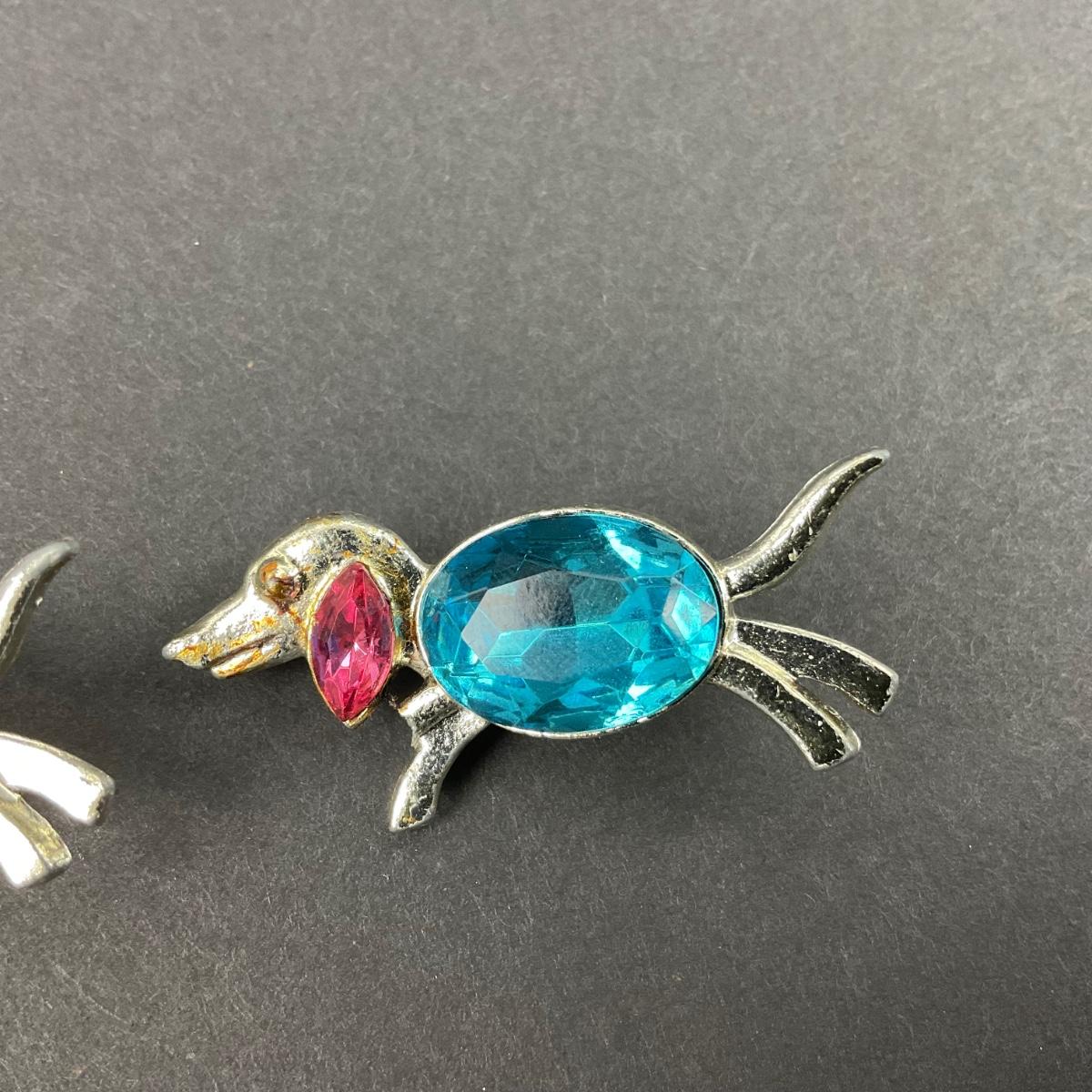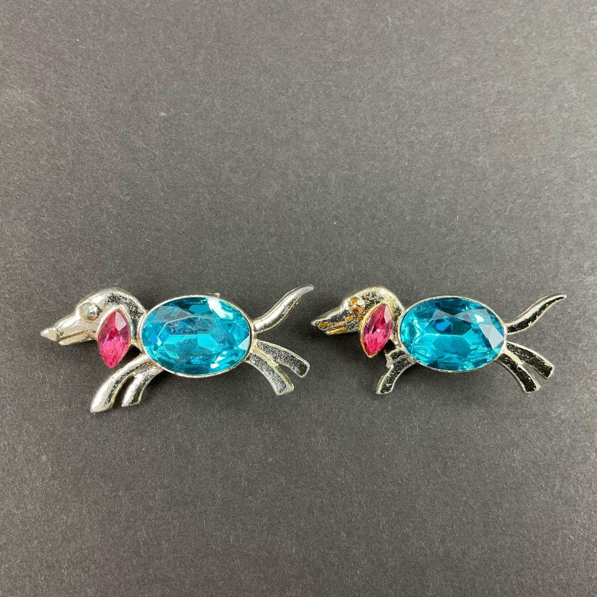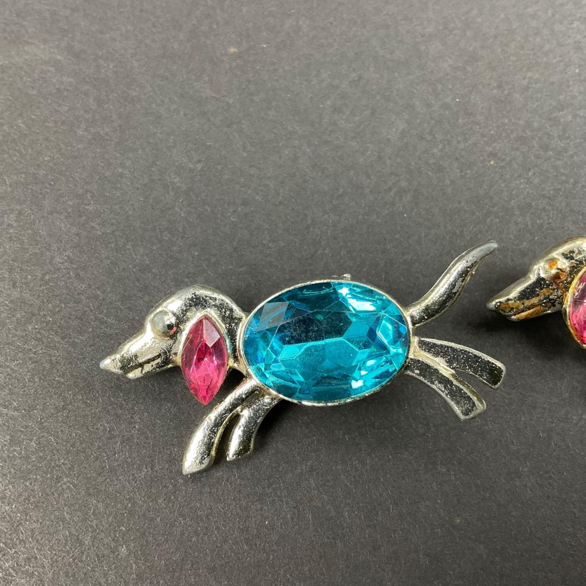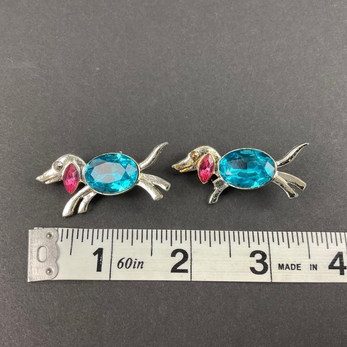 Two vintage silver tone puppy dog brooches. Blue belly pink ear glass faceted stones. This piece does have some scuffs, scratches, marks, or slight damage, but otherwise appears to be in great shape. Please see photos for details and condition. Any condition statement is given as a courtesy to a client, is an opinion, and should not be treated as a statement of fact. Reference to condition written, oral or within a condition report shall not be regarded as a full account of condition and may not include all defects, alterations, or restorations. Absence of a condition report does not imply a lot is flawless or lacking imperfections or damage. Katherine’s Auction & Appraisal Service shall have no responsibility for any error or omission. Returns shall not be accepted on the basis of condition. ::: Shipping is available on this lot. If you require shipping you must let us know at the close of the auction. We will coordinate with you after the item has been won. Shipping fees will include insurance up to or exceeding the value of all items being mailed. If you have any questions regarding this lot please contact the auctioneer either via this website, by direct email or by phone. PICK UP TIMES and other important information can be found in the TERMS and DESCRIPTION of the auction. Please take a look for pertinent information. Thanks!