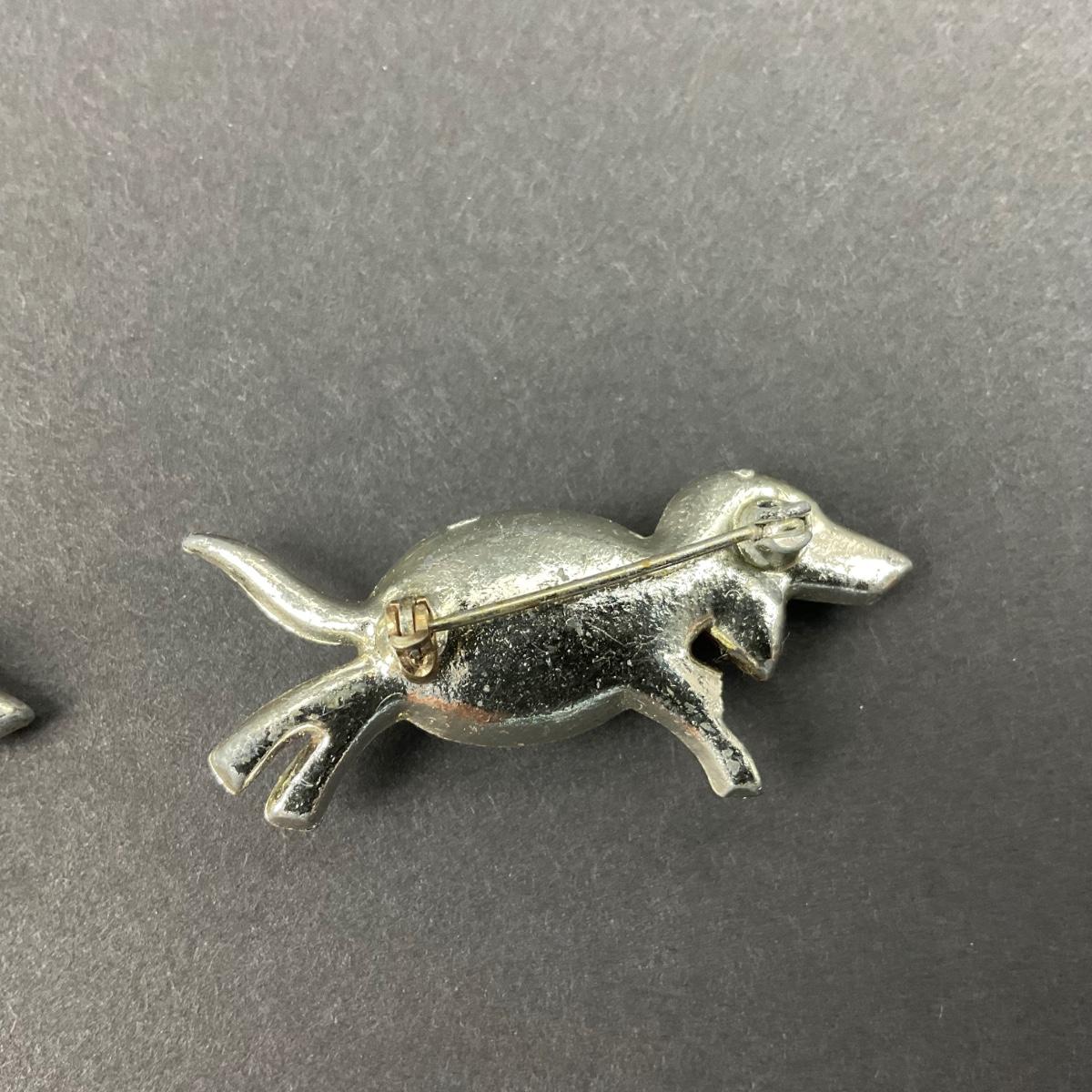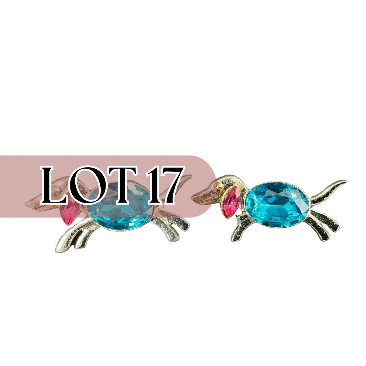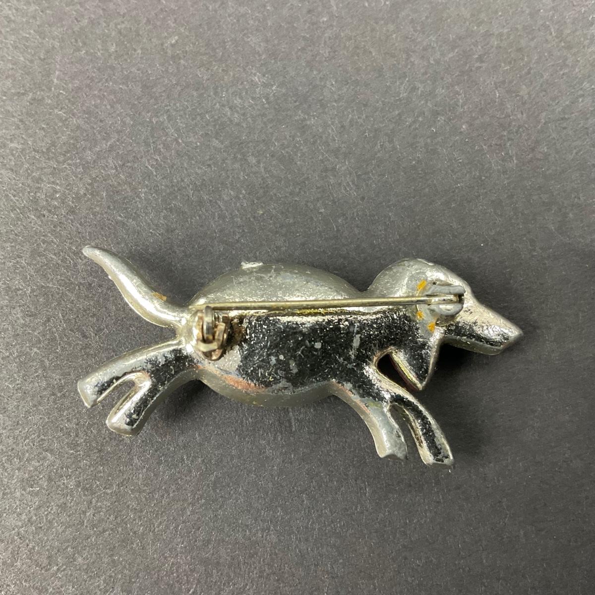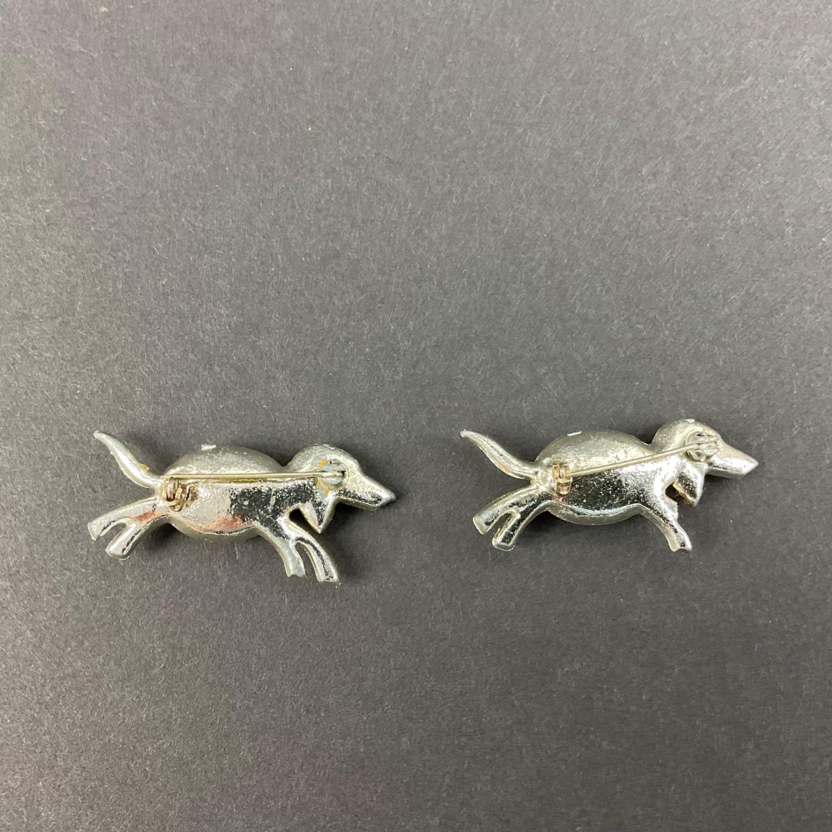 Two vintage silver tone puppy dog brooches. Blue belly pink ear glass faceted stones. This piece does have some scuffs, scratches, marks, or slight damage, but otherwise appears to be in great shape. Please see photos for details and condition. Any condition statement is given as a courtesy to a client, is an opinion, and should not be treated as a statement of fact. Reference to condition written, oral or within a condition report shall not be regarded as a full account of condition and may not include all defects, alterations, or restorations. Absence of a condition report does not imply a lot is flawless or lacking imperfections or damage. Katherine’s Auction & Appraisal Service shall have no responsibility for any error or omission. Returns shall not be accepted on the basis of condition. ::: Shipping is available on this lot. If you require shipping you must let us know at the close of the auction. We will coordinate with you after the item has been won. Shipping fees will include insurance up to or exceeding the value of all items being mailed. If you have any questions regarding this lot please contact the auctioneer either via this website, by direct email or by phone. PICK UP TIMES and other important information can be found in the TERMS and DESCRIPTION of the auction. Please take a look for pertinent information. Thanks!