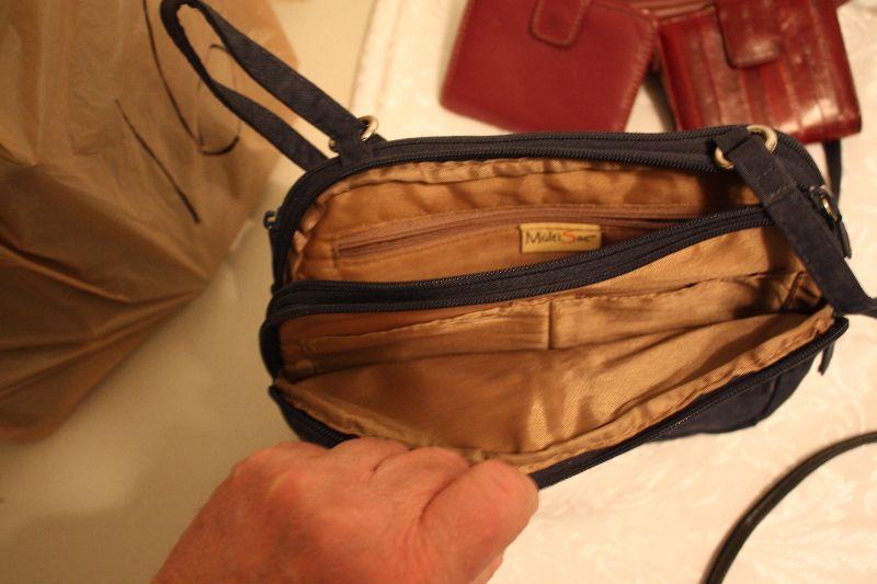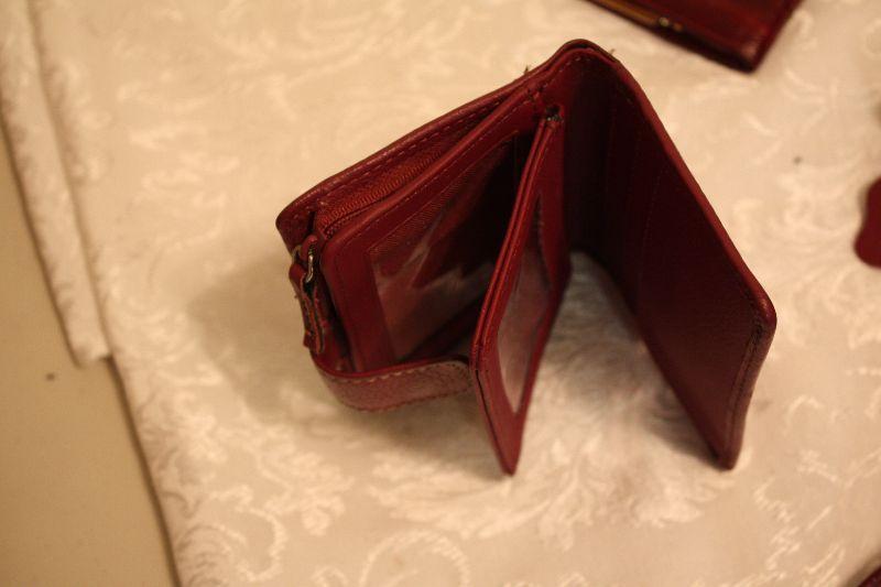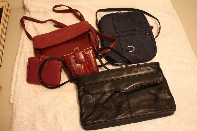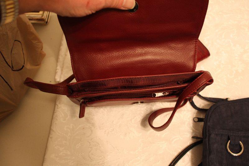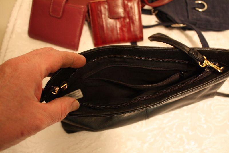 MultiSac navy nylon canvas handbag, burgundy genuine leather handbag, black top grain cowhide handbag, two burgundy leather wallets