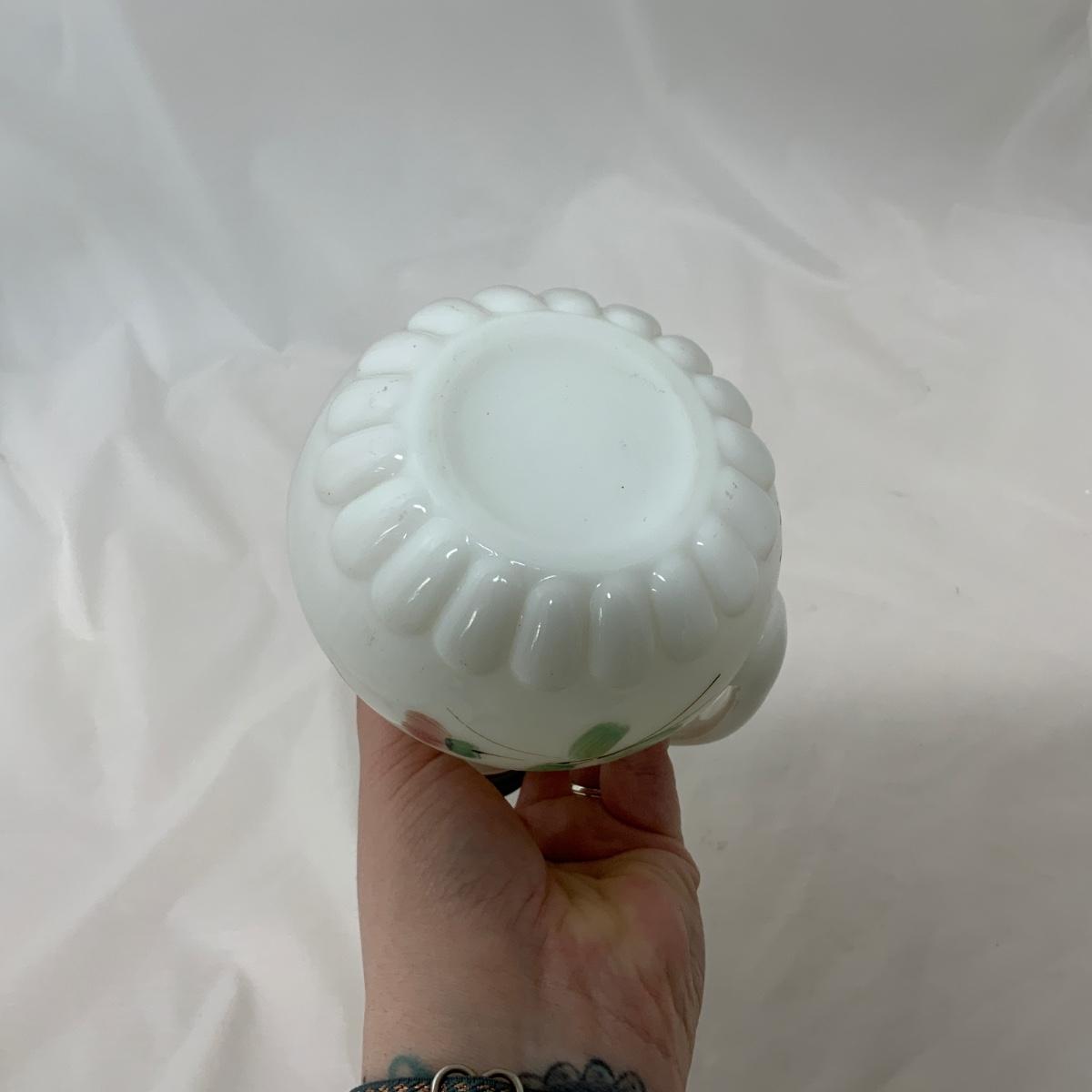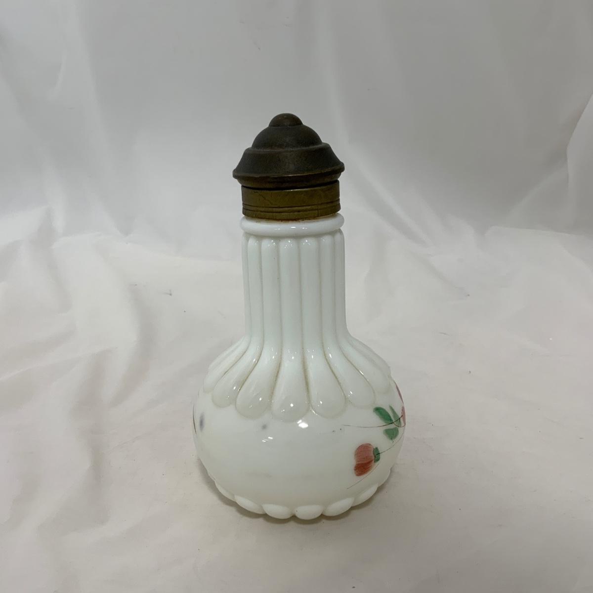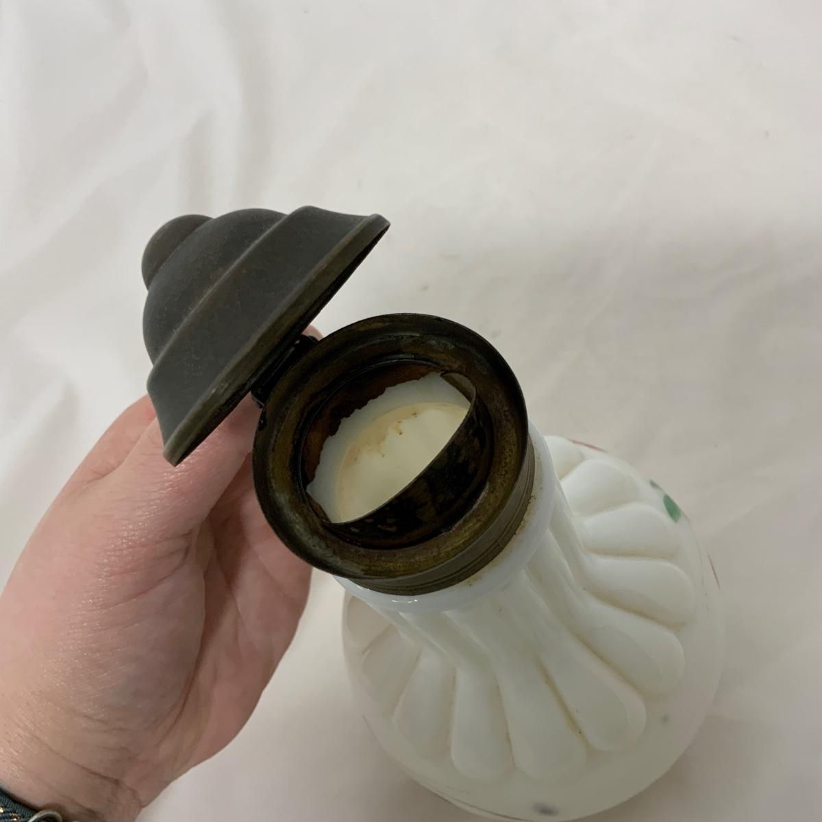 Elegant Milk Glass Syrup with Hand painted floral detail and brass lid. All original pieces, with a strong spring. Please see photos for details and condition. ::: Shipping is available on this lot. If you require shipping you must let us know at the close of the auction. We will coordinate with you after the item has been won. Shipping fees will include insurance up to or exceeding the value of all items being mailed. If you have any questions regarding this lot please contact the auctioneer either via this website, by direct email or by phone. PICK UP TIMES and other important information can be found in the TERMS and DESCRIPTION of the auction. Please take a look for pertinent information. Thanks!