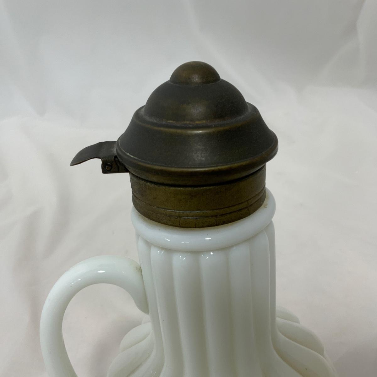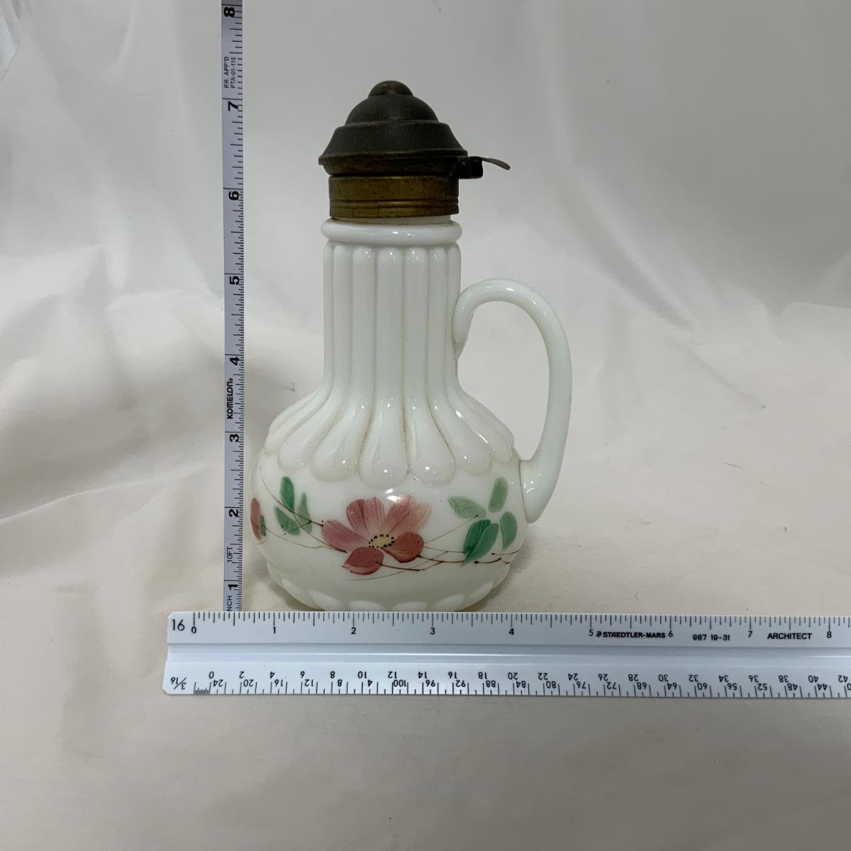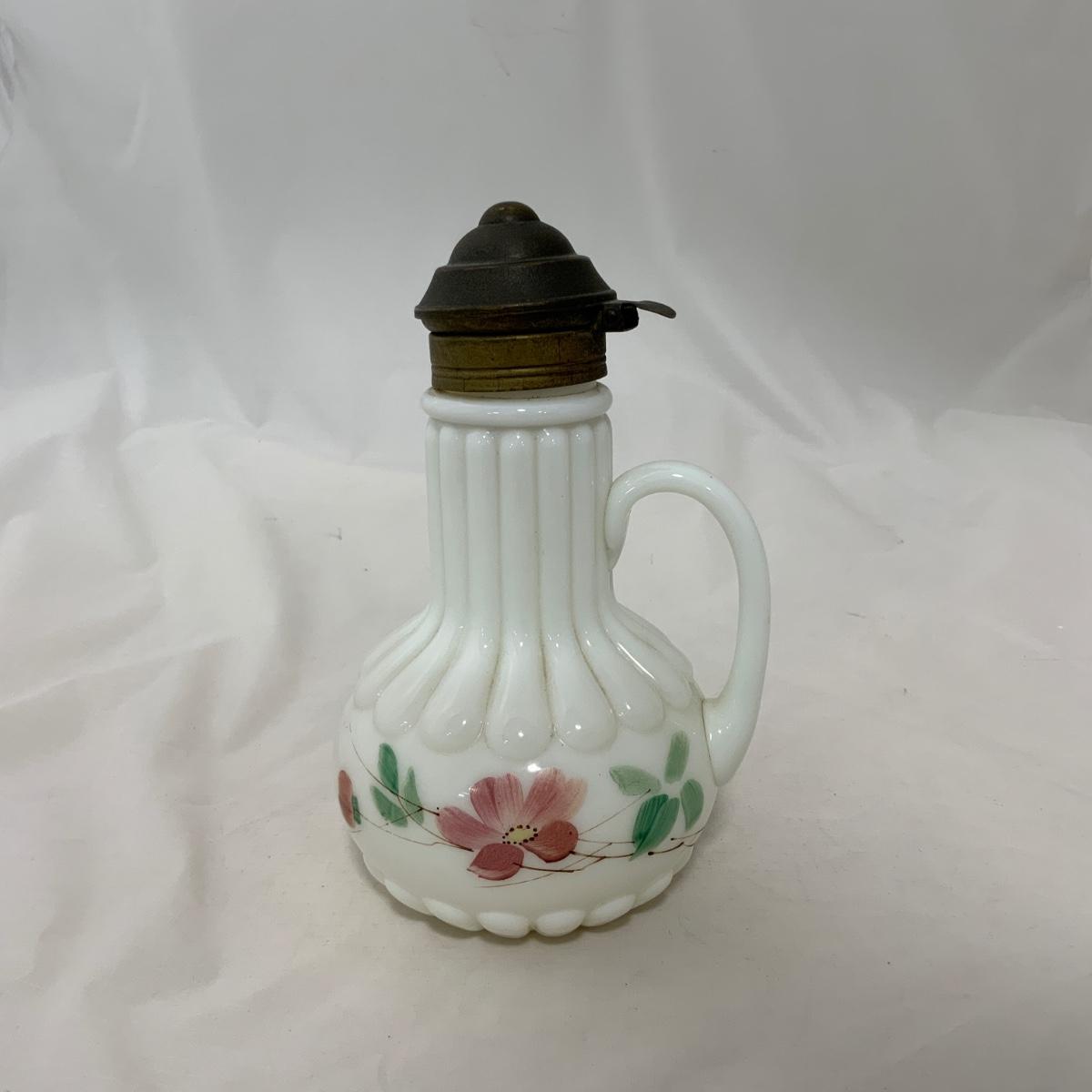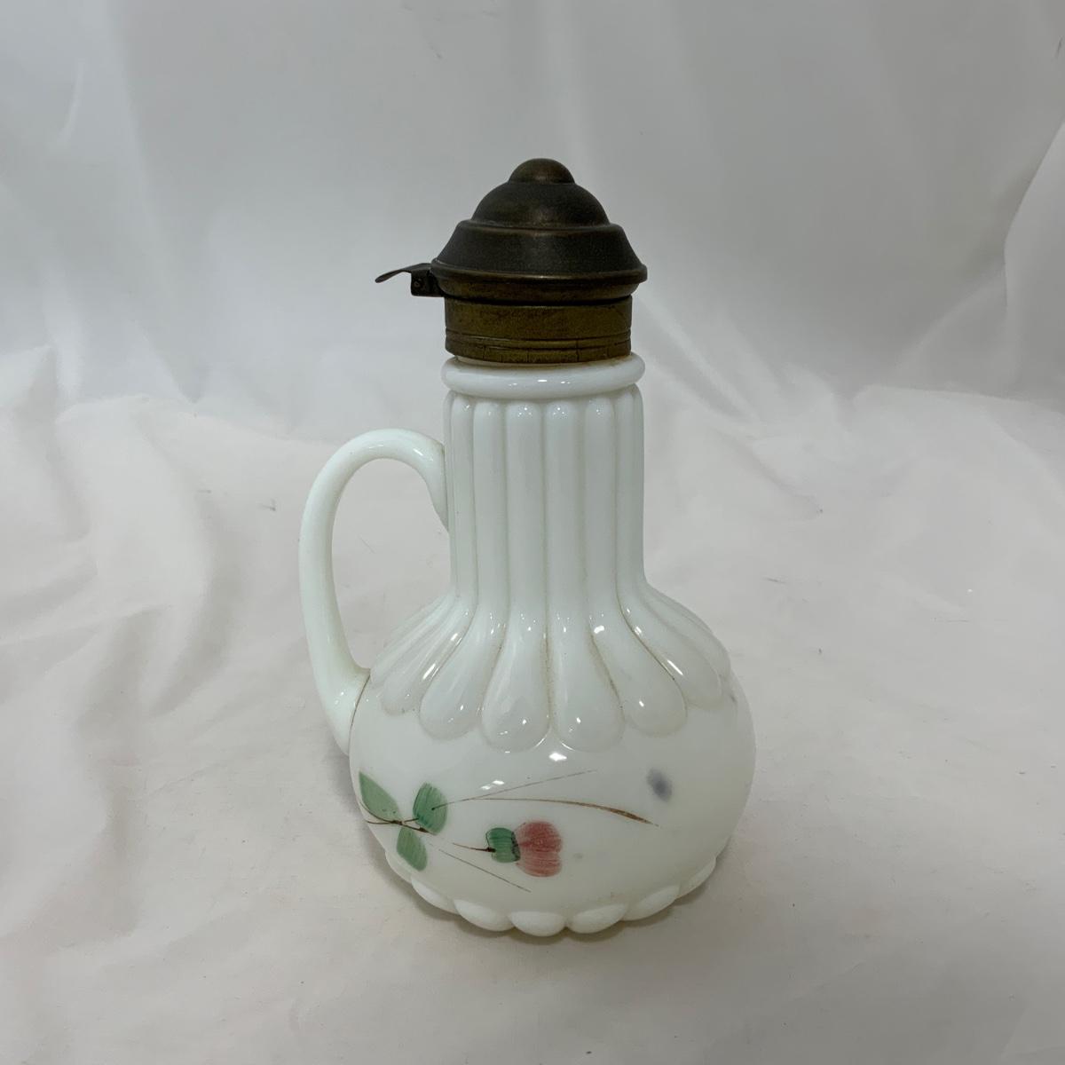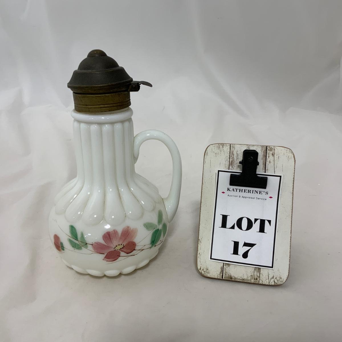 .17. Milk Glass and Brass Hand Painted Syrup | c. 1890