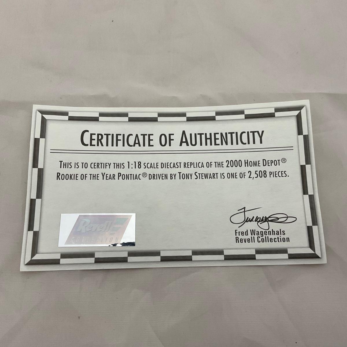 One NASCAR die cast 1:18 scale 2000 Home Depot Rookie of the Year Pontiac figure. Tony Stewart. Comes with a Certificate of Authenticity. Please see photos for details and condition. ::: Shipping is available on this lot. If you require shipping you must let us know at the close of the auction. We will coordinate with you after the item has been won. Shipping fees will include insurance up to or exceeding the value of all items being mailed. If you have any questions regarding this lot please contact the auctioneer either via this website, by direct email or by phone. PICK UP TIMES and other important information can be found in the TERMS and DESCRIPTION of the auction. Please take a look for pertinent information. Thanks!