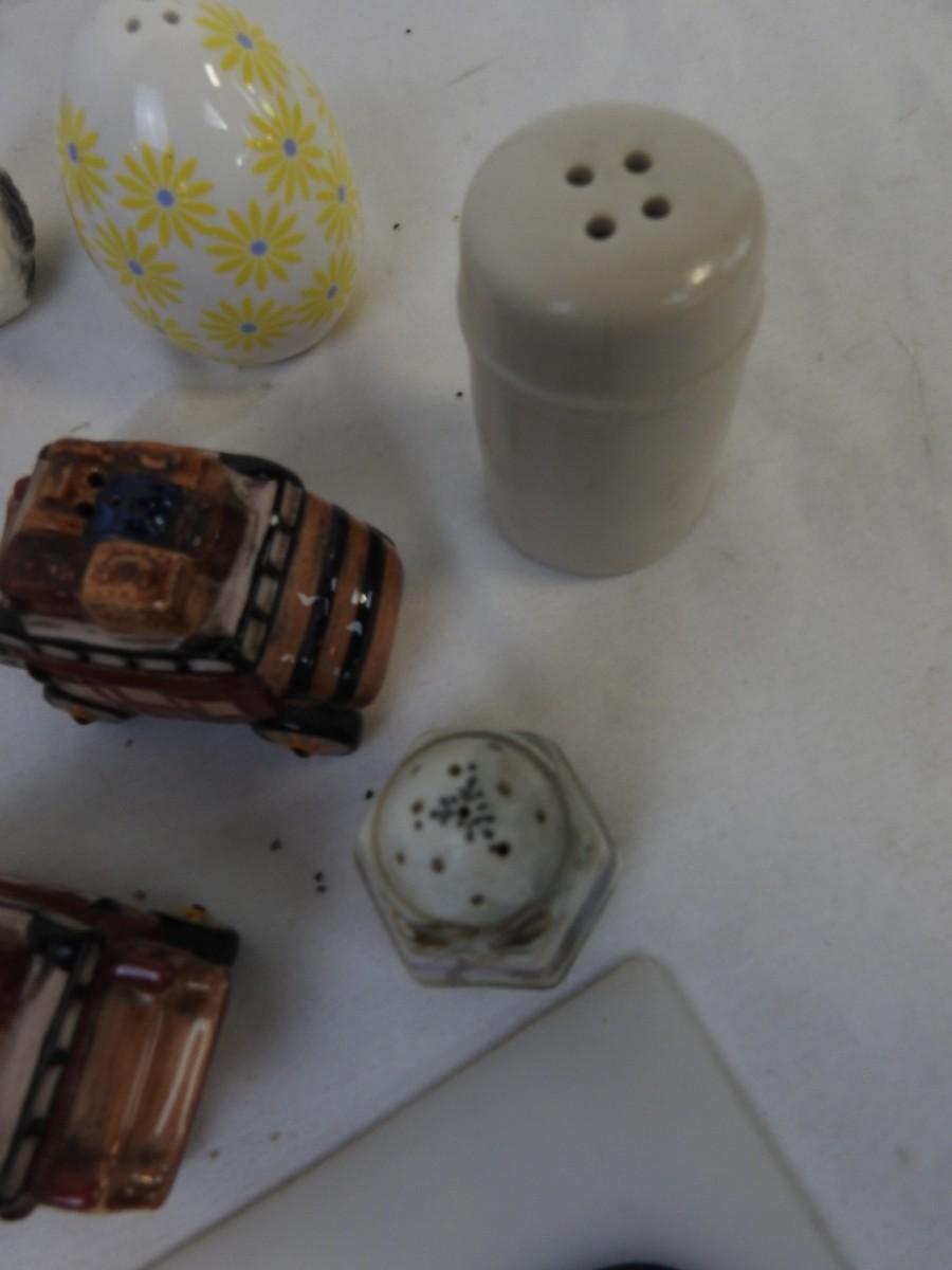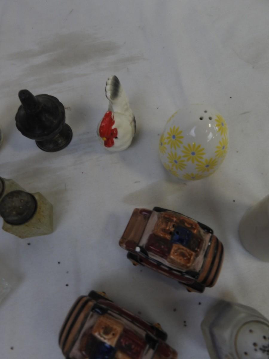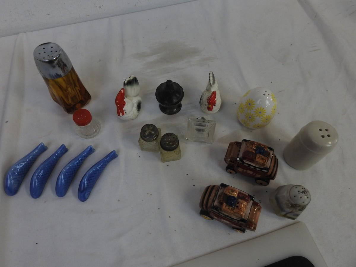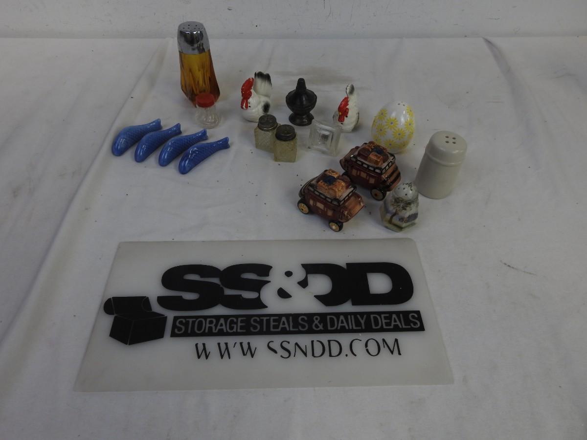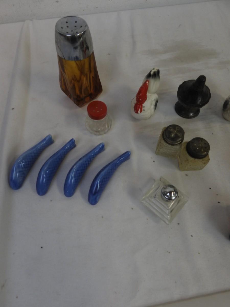 17 pc : Various Salt and Pepper Shakers, 3 sets, 7 misc, & 4 Blue Fish Decor