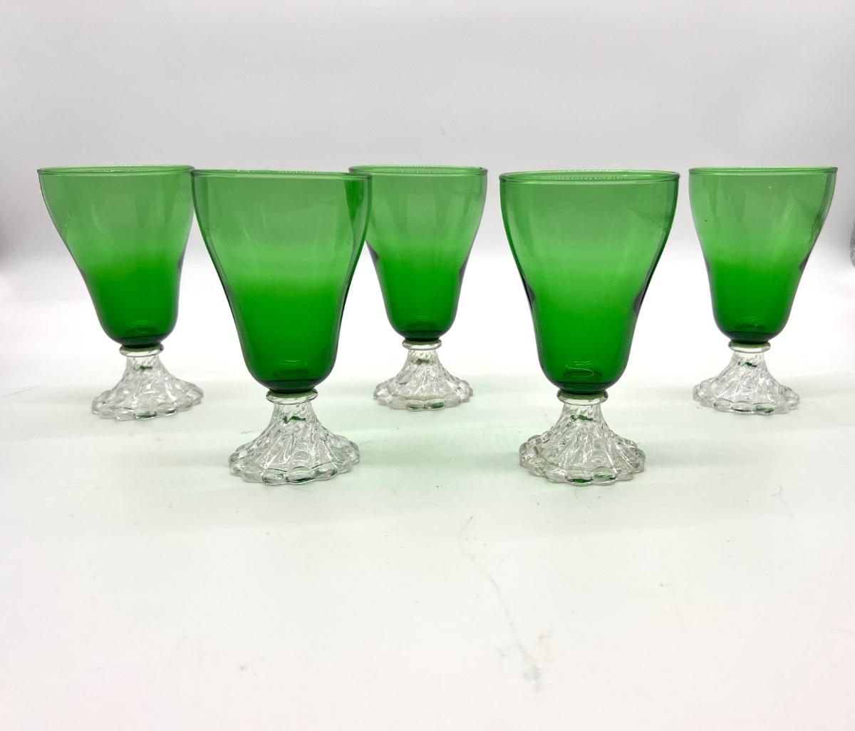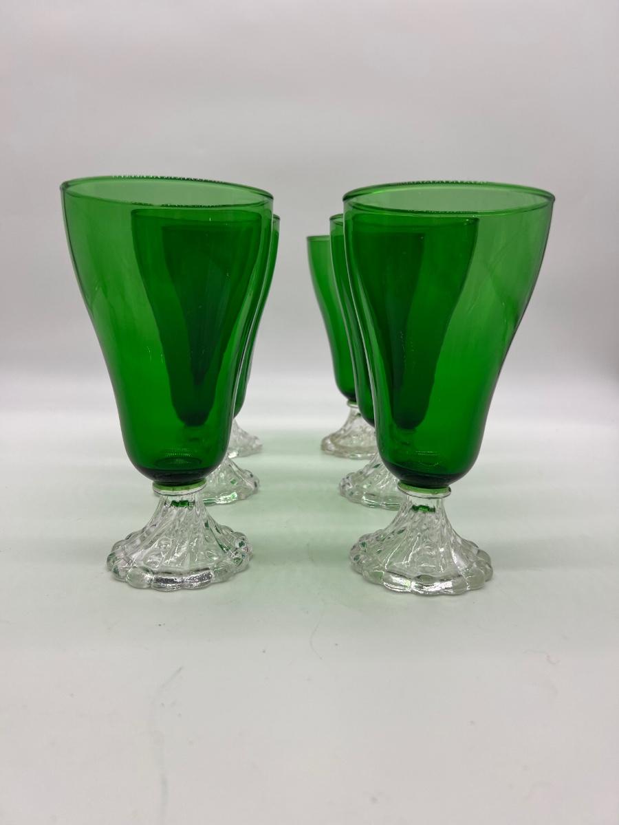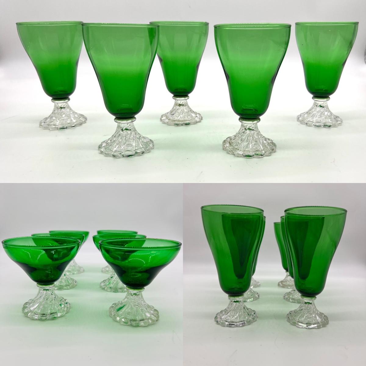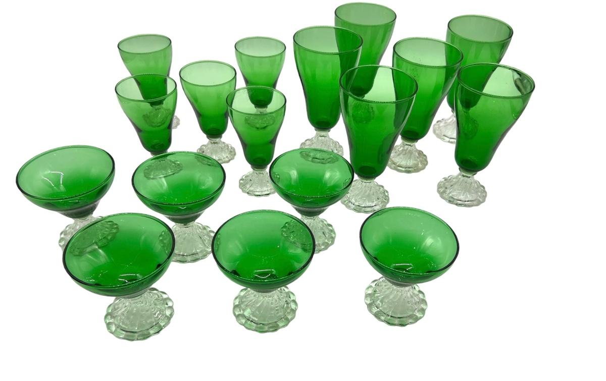 17 pieces Anchor Hocking Burple Green Footed glass. 6 ice tea glasses, 5 goblets, 6 sherbet bowls.