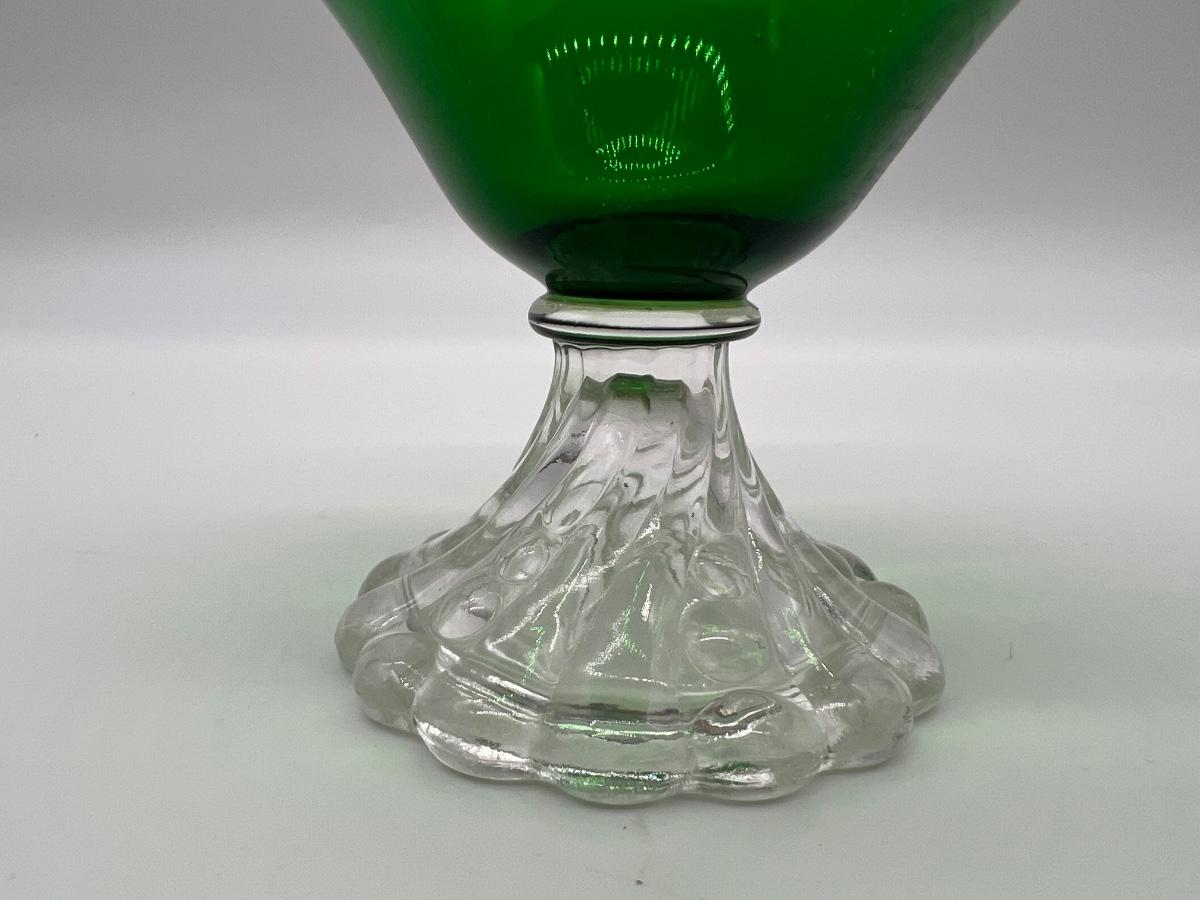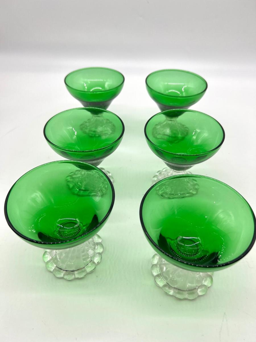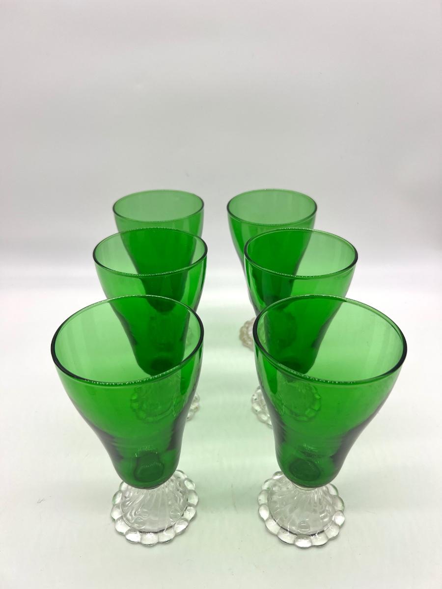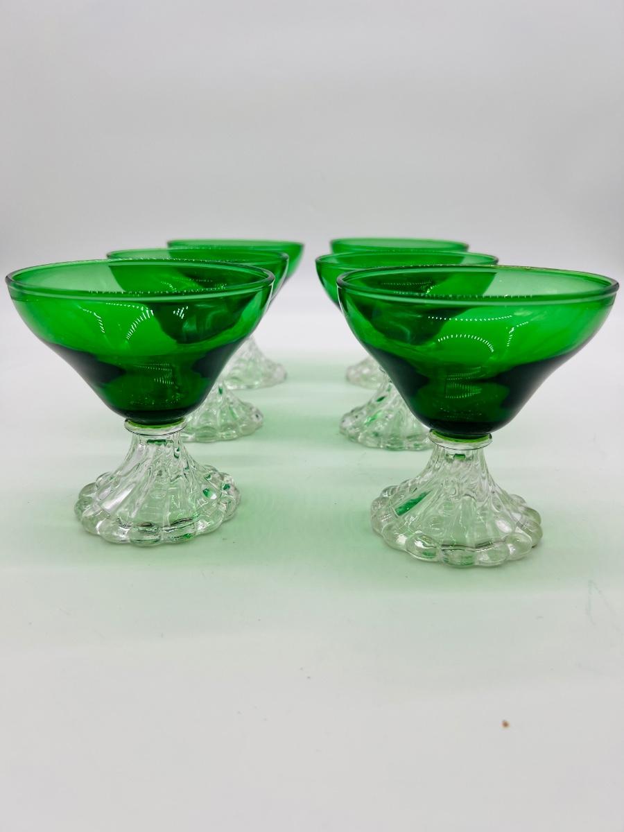 17 pieces Anchor Hocking Burple Green Footed glass. 6 ice tea glasses, 5 goblets, 6 sherbet bowls.