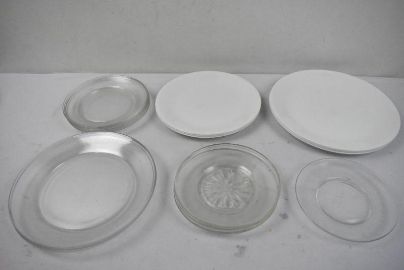 17 Piece White & Clear Dishes Set: 3 Large White Corelle Plates, 3 Small White Corelle Plates, 2 Clear Plates, 5 Clear Small Plates, 3 Small Clear Dessert Plates, and 1 Clear Saucer