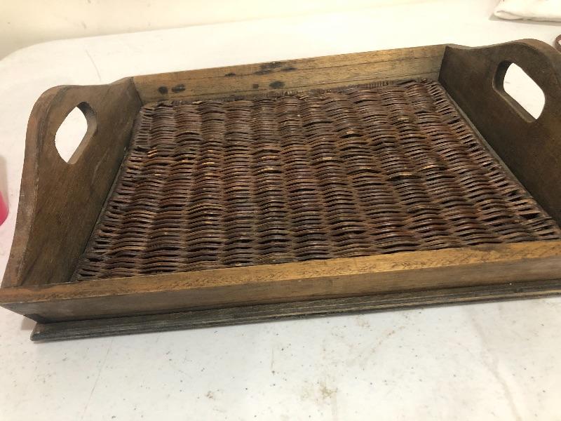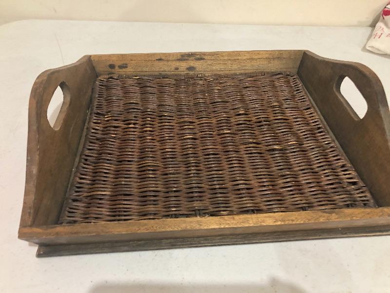 Measures 14 x 12 1/2 cute wicker and wood serving tray with handles. This is an ONSITE Auction all items will need to be picked up on location. Please see auction description for pick up procedures