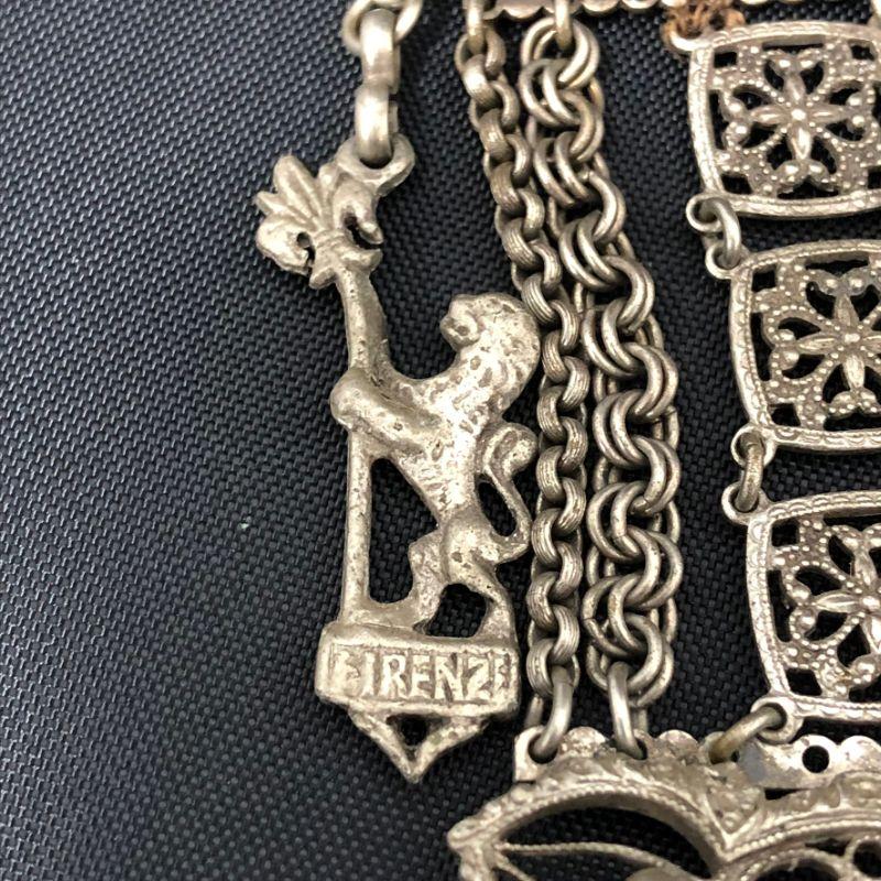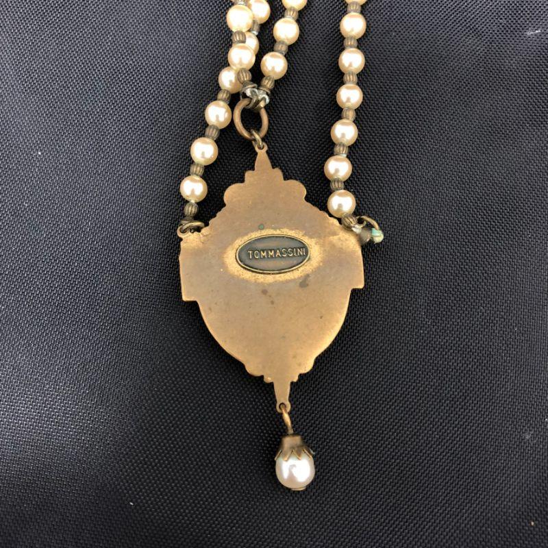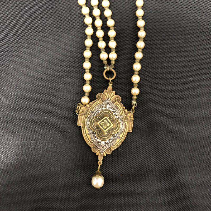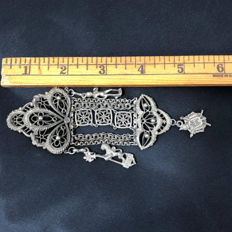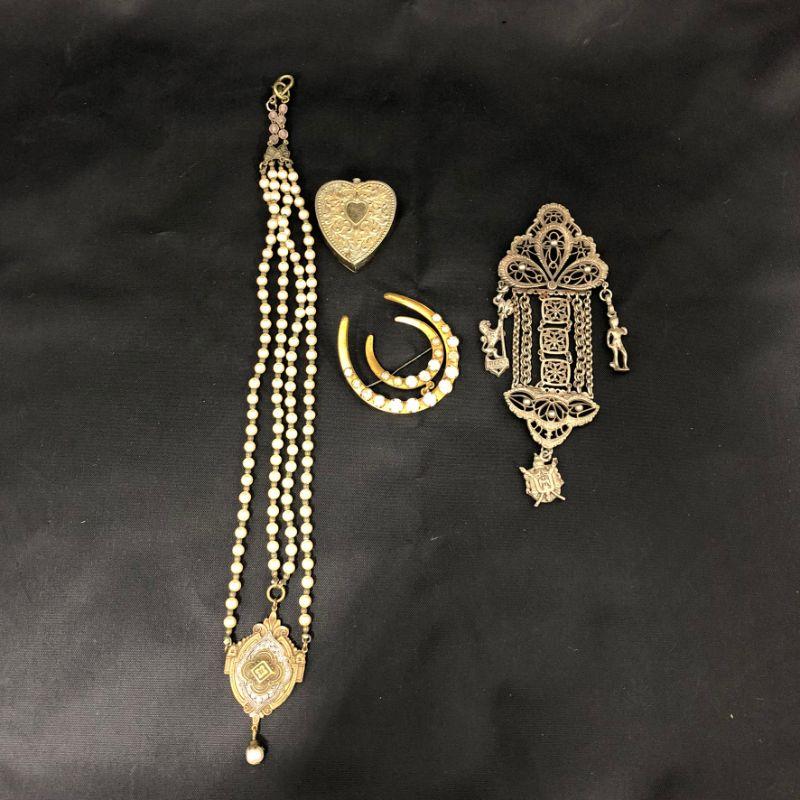 This lot is not to be missed. Herdolic Filgree Brooch with original charms made of German Nickel Silver, Heart-Shaped lighter (needs new flint), Vicorian Double Horseshoe brooch, and Tommassini created-pearl festoon necklace. Antique jewelry at its finest.
