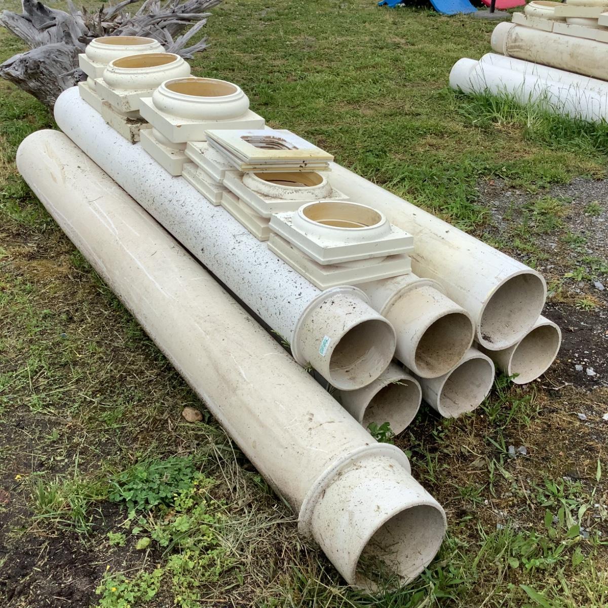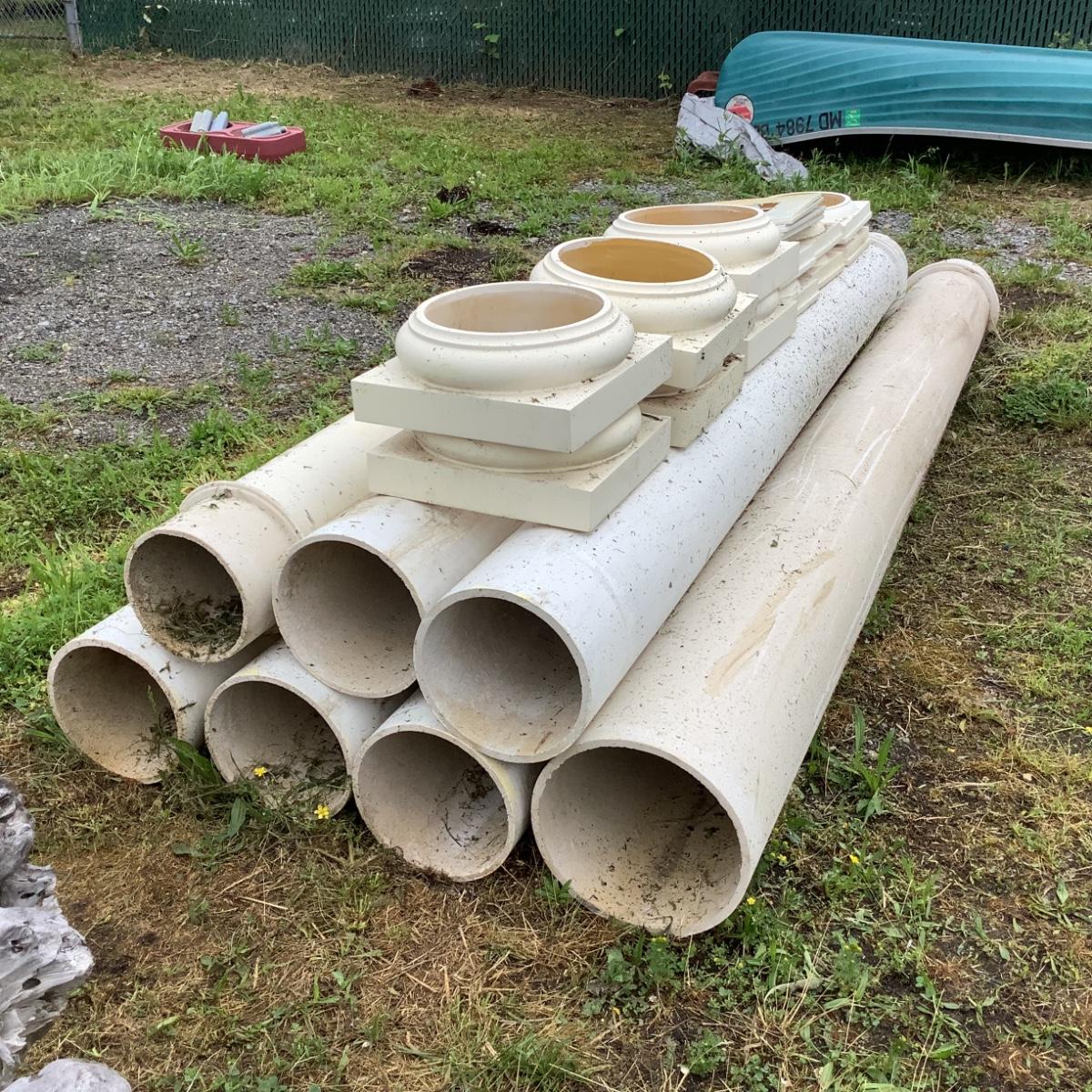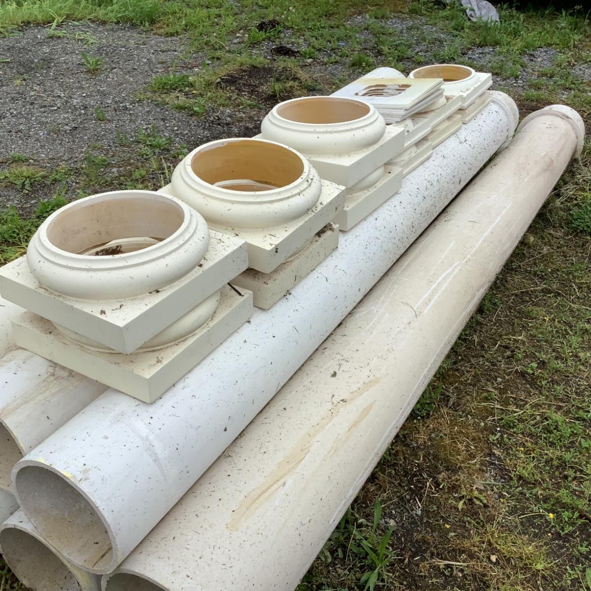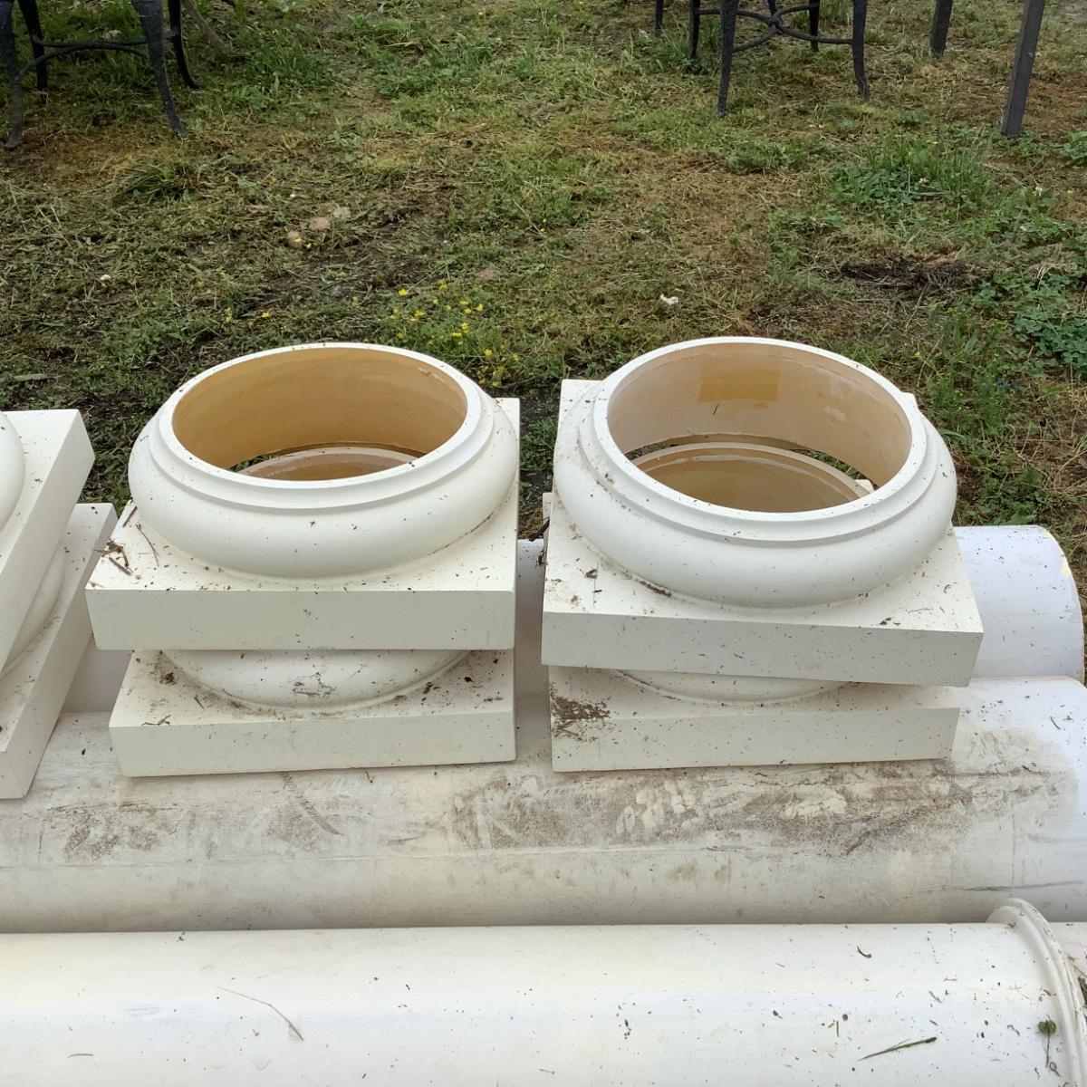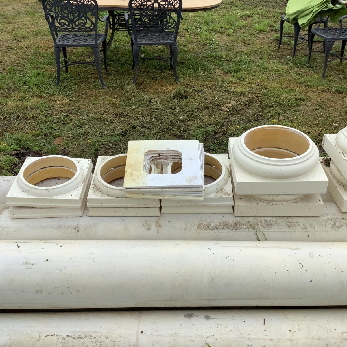 There are 7 columns with caps and bases. The columns are 87" High x 9.5" diameter. The cylinder columns have their caps and matching tops. The base is 11.25" square.