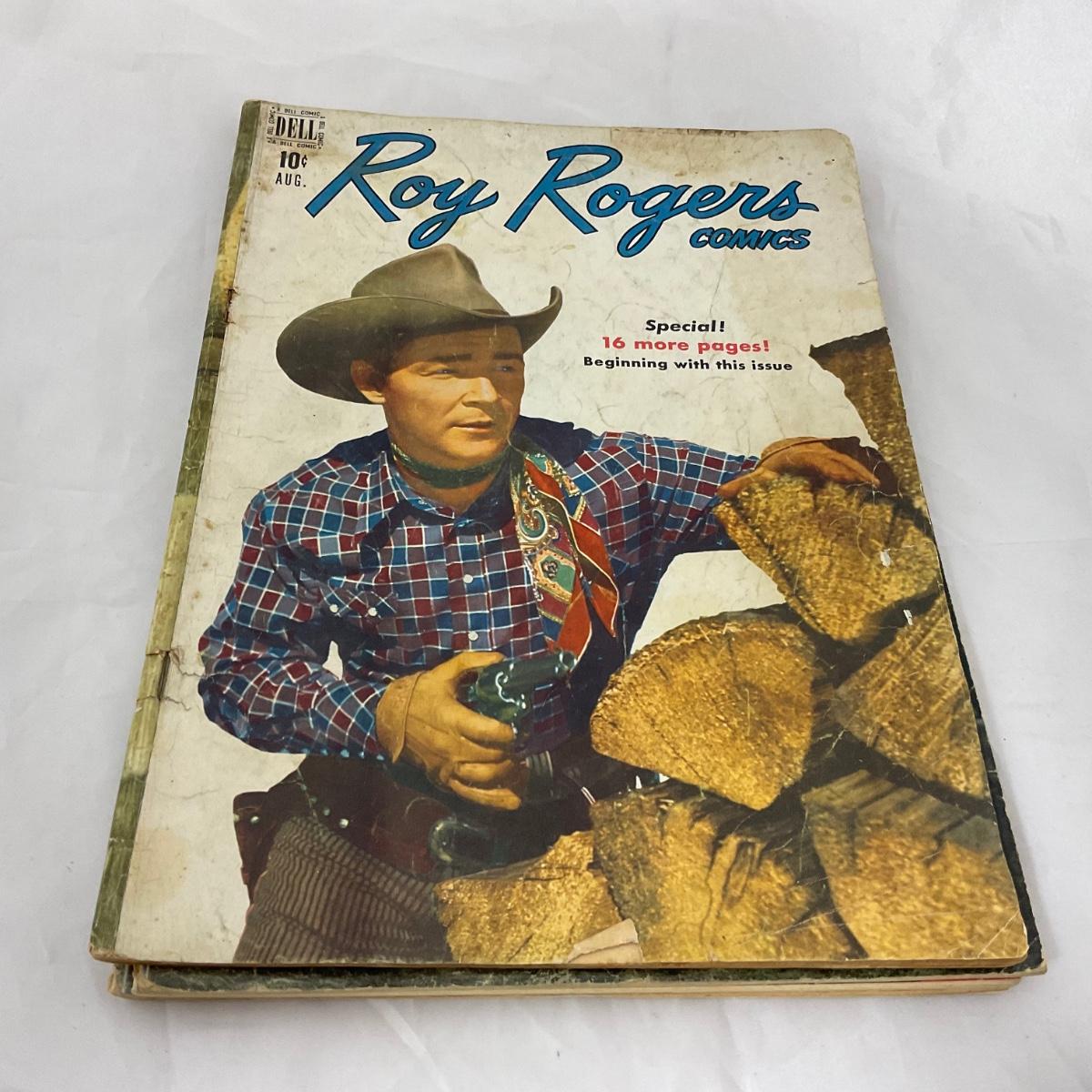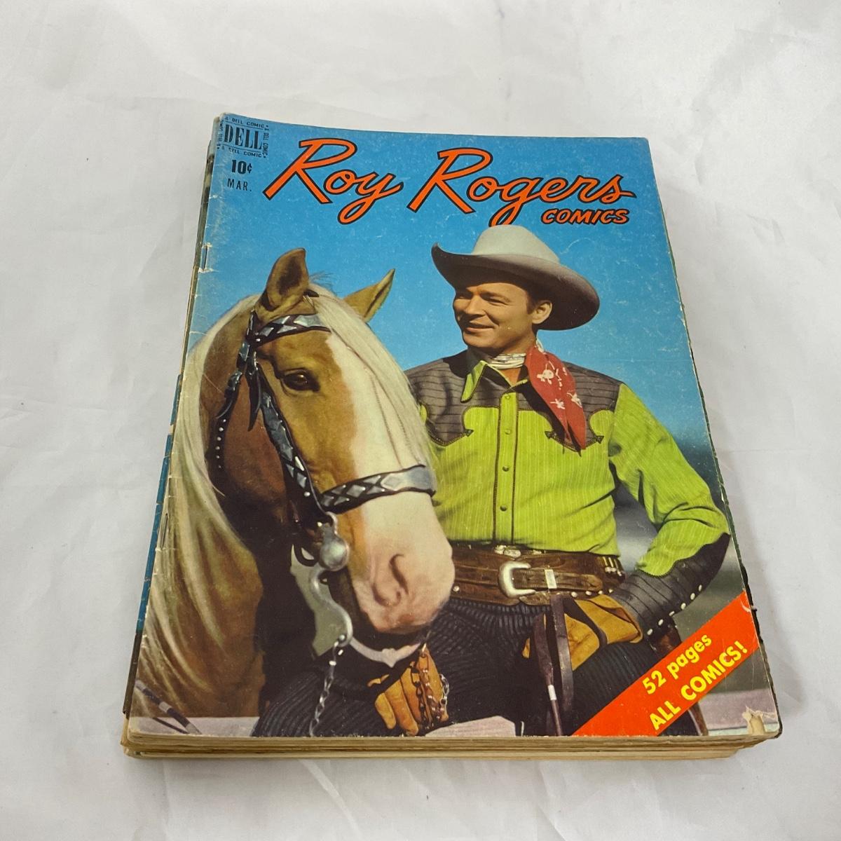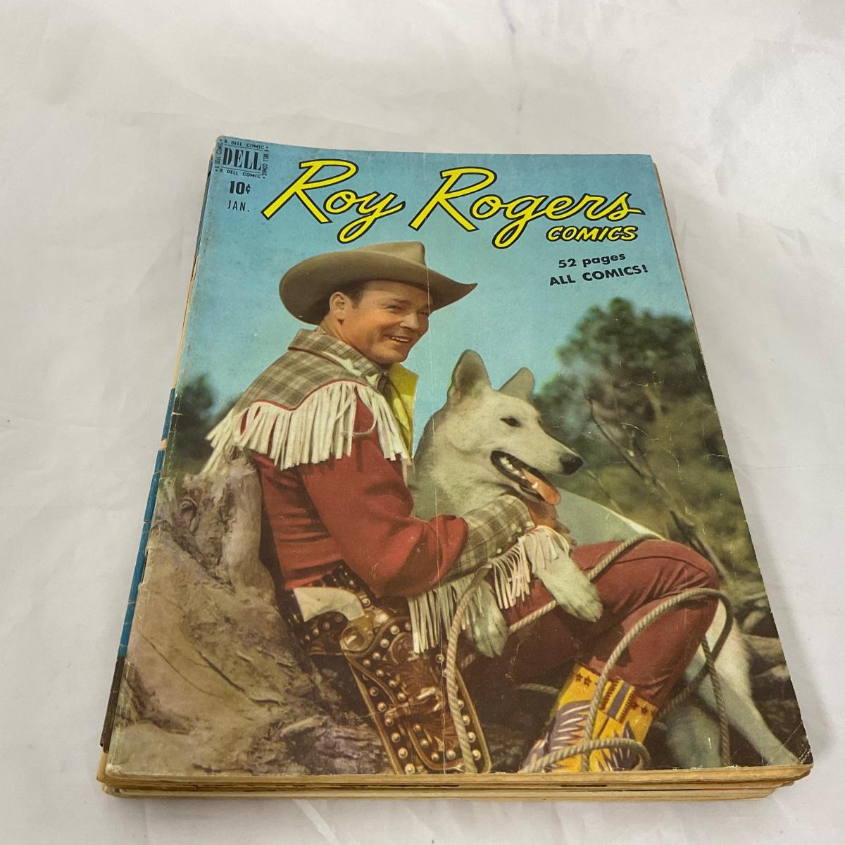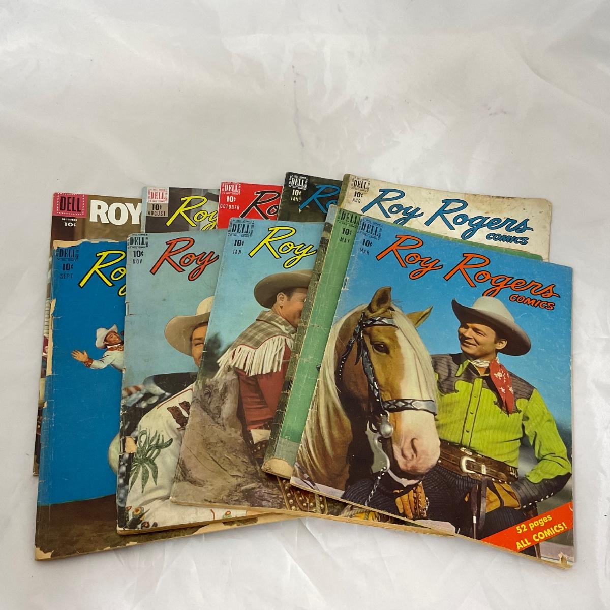 Ten vintage Roy Rogers comics in well loved condition. Please see photos for details and condition. ::: Shipping is available on this lot. If you require shipping you must let us know at the close of the auction. We will coordinate with you after the item has been won. Shipping fees will include insurance up to or exceeding the value of all items being mailed. If you have any questions regarding this lot please contact the auctioneer either via this website, by direct email or by phone. PICK UP TIMES and other important information can be found in the TERMS and DESCRIPTION of the auction. Please take a look for pertinent information. Thanks!