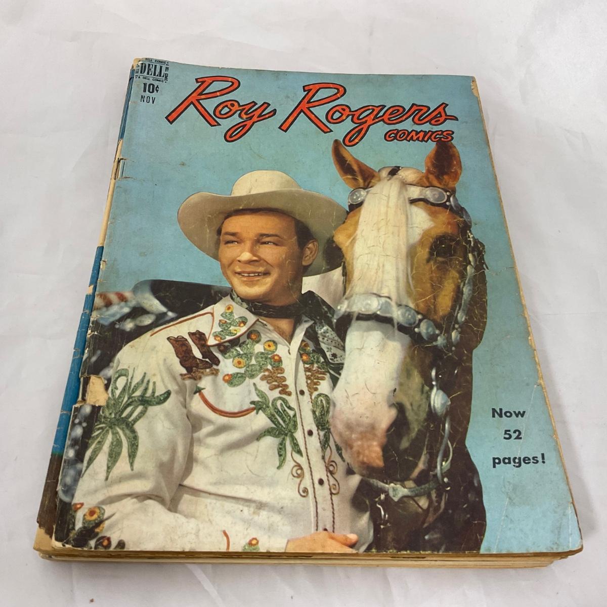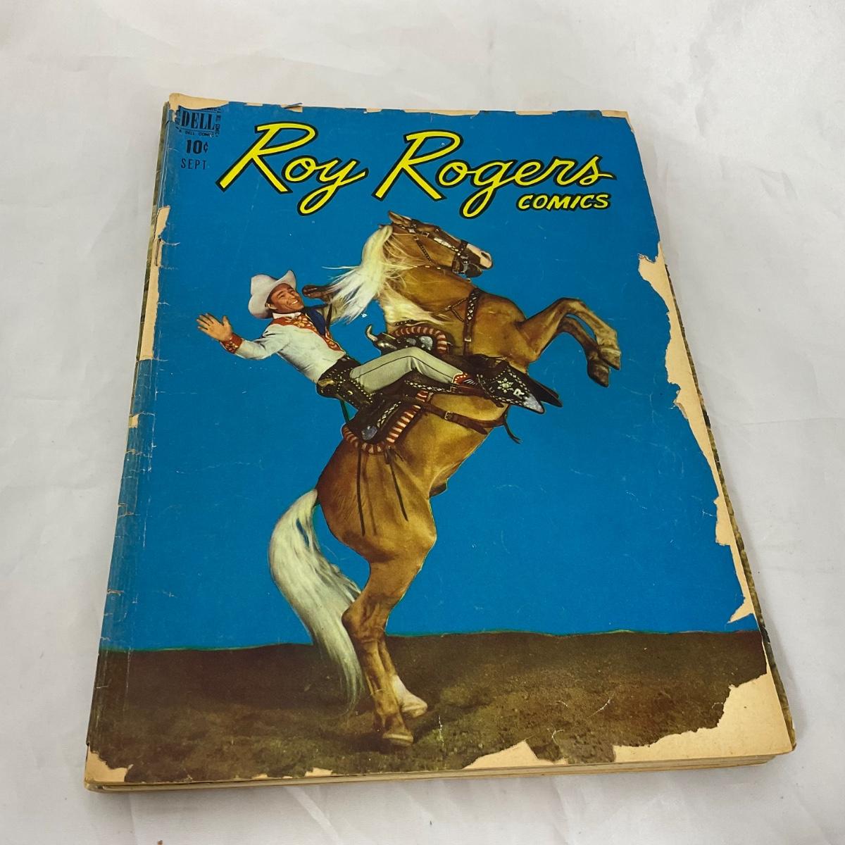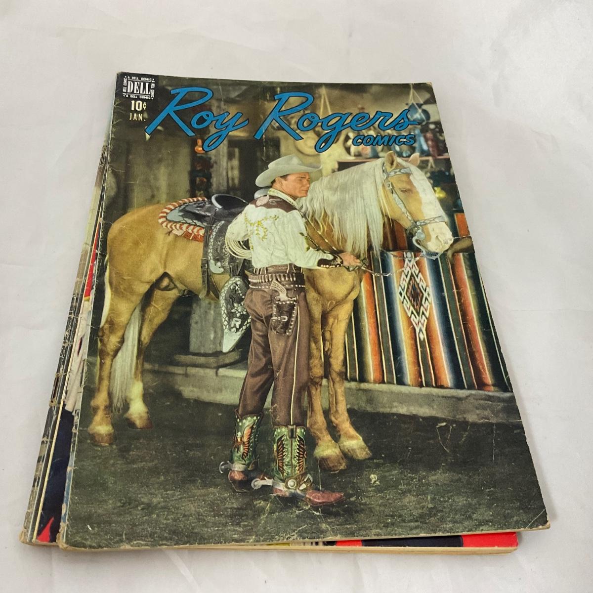 Ten vintage Roy Rogers comics in well loved condition. Please see photos for details and condition. ::: Shipping is available on this lot. If you require shipping you must let us know at the close of the auction. We will coordinate with you after the item has been won. Shipping fees will include insurance up to or exceeding the value of all items being mailed. If you have any questions regarding this lot please contact the auctioneer either via this website, by direct email or by phone. PICK UP TIMES and other important information can be found in the TERMS and DESCRIPTION of the auction. Please take a look for pertinent information. Thanks!