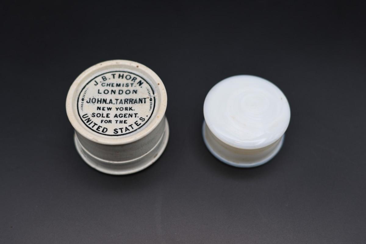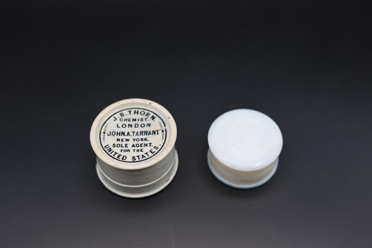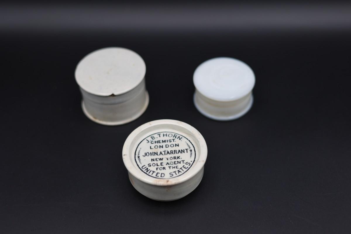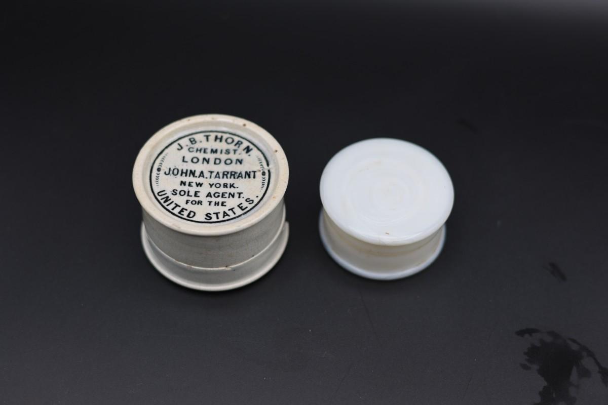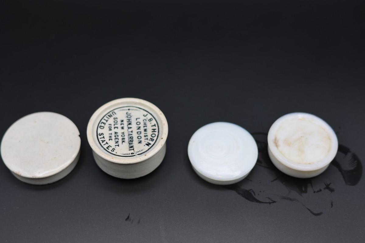 One complete J.B. Thorn Pot and lid, one with only the base of writing with J.B. Thorn.. And one milk glass top and bottom.