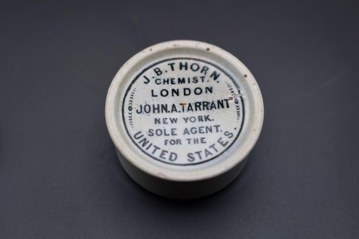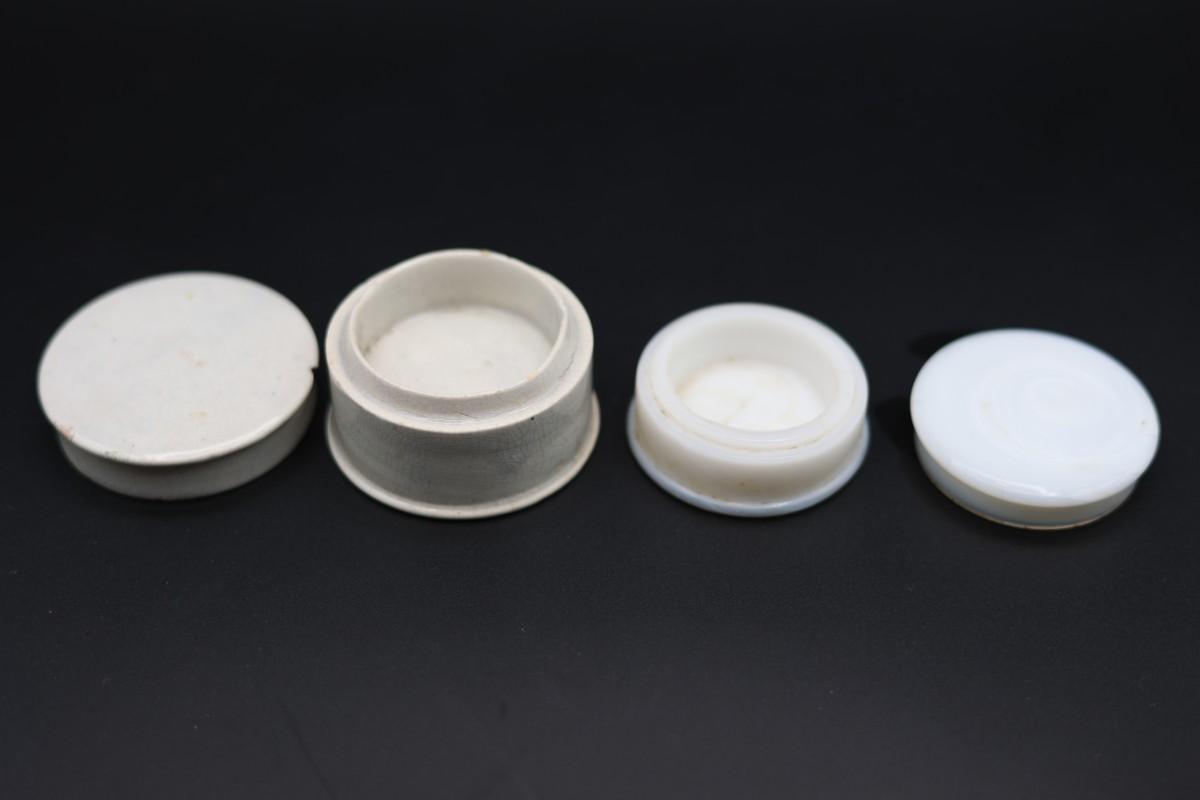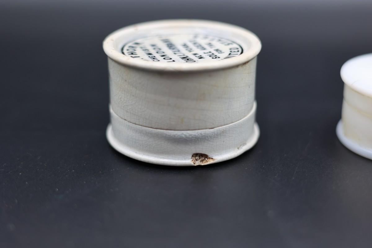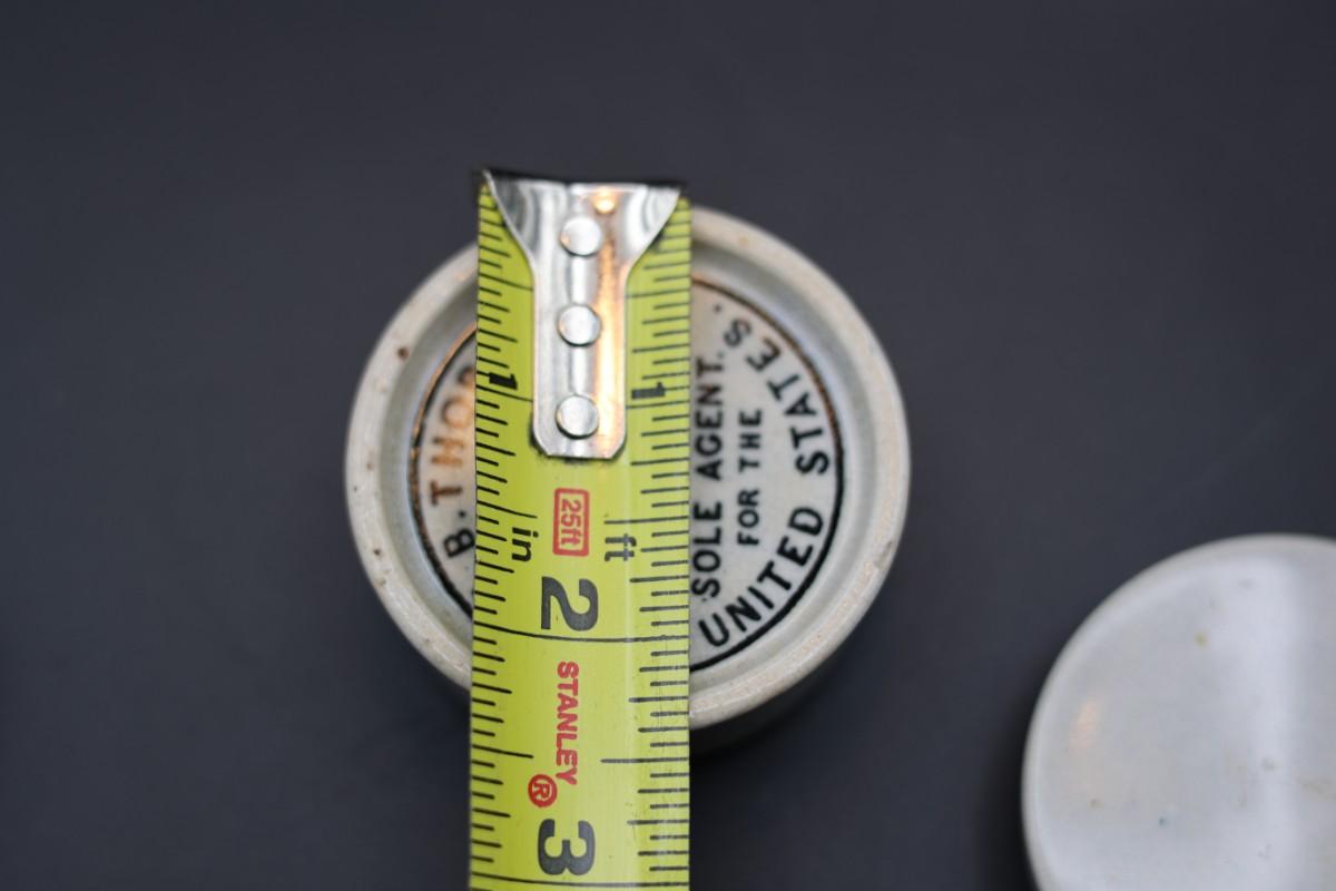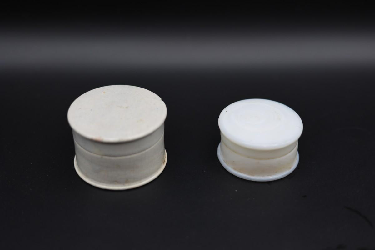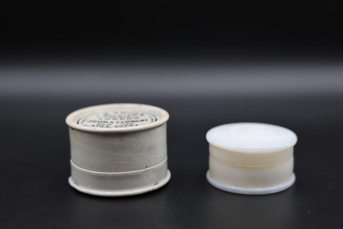 One complete J.B. Thorn Pot and lid, one with only the base of writing with J.B. Thorn.. And one milk glass top and bottom.