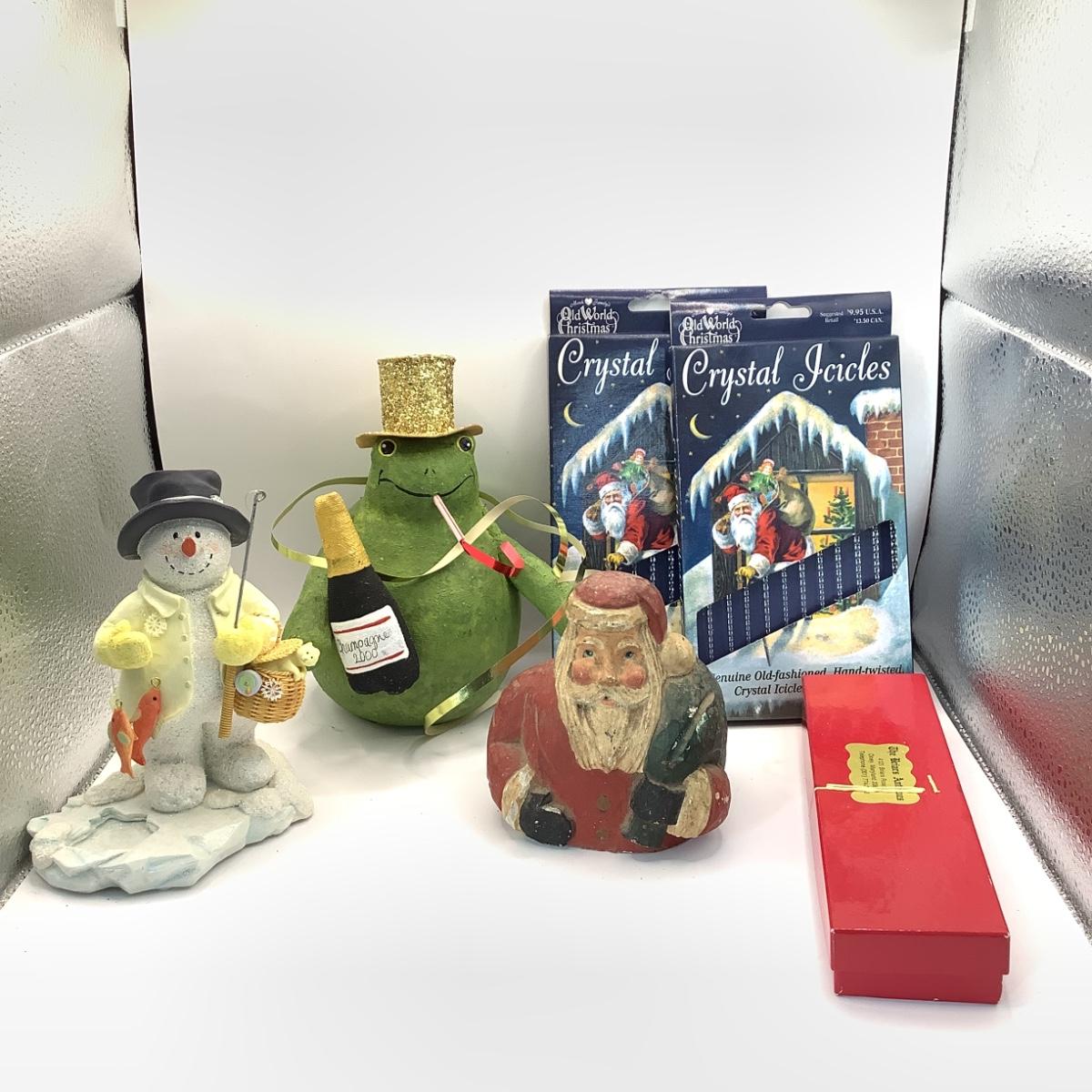 Set of 48 old world christmas icicles, frog, wooden santa, snowman