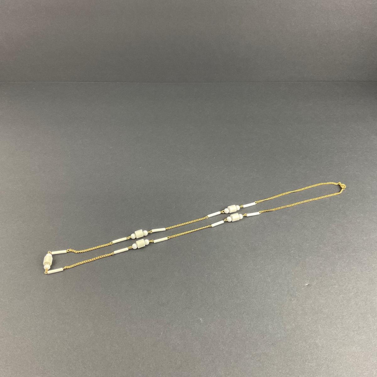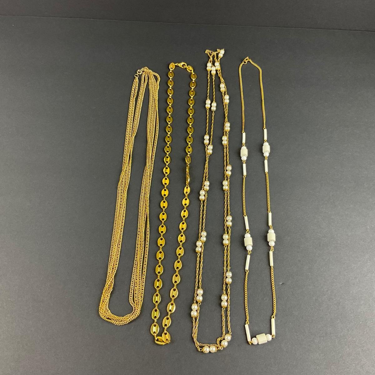 Four unmarked gold tone costume jewelry necklaces. Please see photos for details and condition. Any condition statement is given as a courtesy to a client, is an opinion, and should not be treated as a statement of fact. Reference to condition written, oral or within a condition report shall not be regarded as a full account of condition and may not include all defects, alterations, or restorations. Absence of a condition report does not imply a lot is flawless or lacking imperfections or damage. Katherine’s Auction & Appraisal Service shall have no responsibility for any error or omission. Returns shall not be accepted on the basis of condition. ::: Shipping is available on this lot. If you require shipping you must let us know at the close of the auction. We will coordinate with you after the item has been won. Shipping fees will include insurance up to or exceeding the value of all items being mailed. If you have any questions regarding this lot please contact the auctioneer either via this website, by direct email or by phone. PICK UP TIMES and other important information can be found in the TERMS and DESCRIPTION of the auction. Please take a look for pertinent information. Thanks!