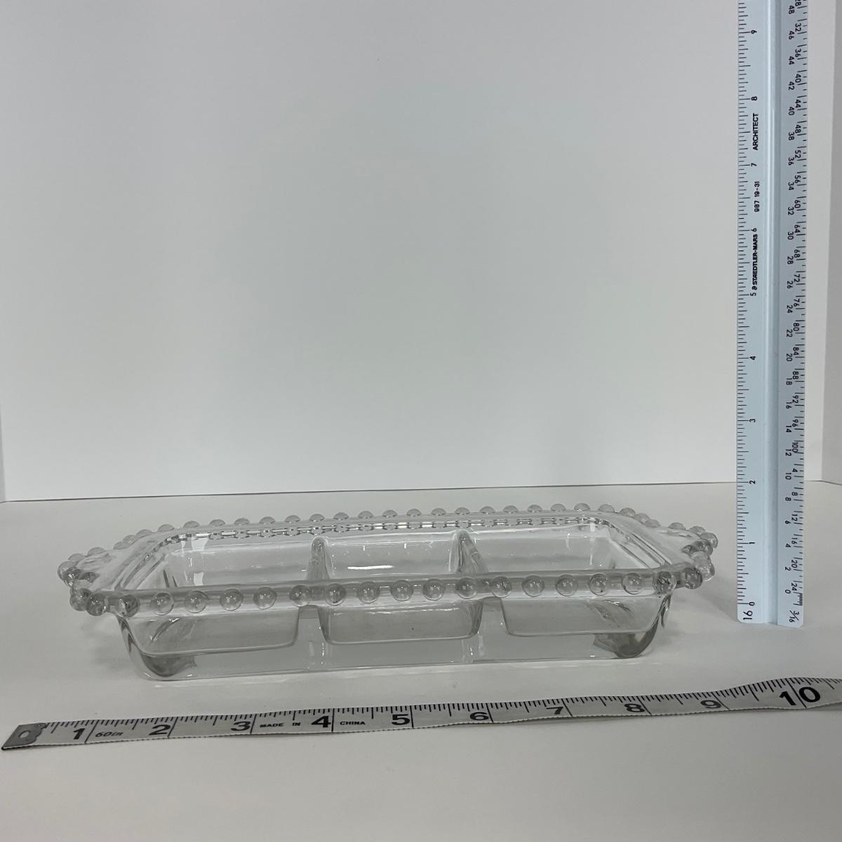 One Candlewick Imperial Glass Co. (1936-1950’s) relish dish and glass serving spoon. Please see photos for details and condition. ::: Shipping is available on this lot. If you require shipping you must let us know at the close of the auction. We will coordinate with you after the item has been won. Shipping fees will include insurance up to or exceeding the value of all items being mailed. If you have any questions regarding this lot please contact the auctioneer either via this website, by direct email or by phone. PICK UP TIMES and other important information can be found in the TERMS and DESCRIPTION of the auction. Please take a look for pertinent information. Thanks!