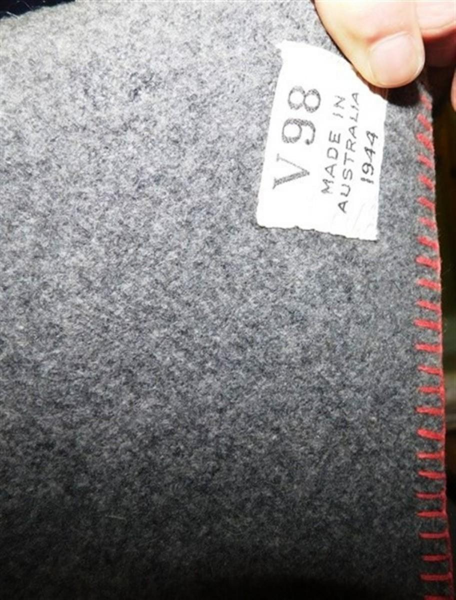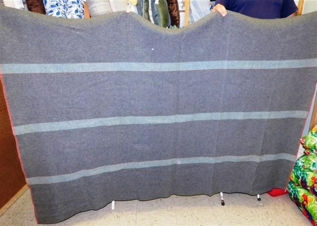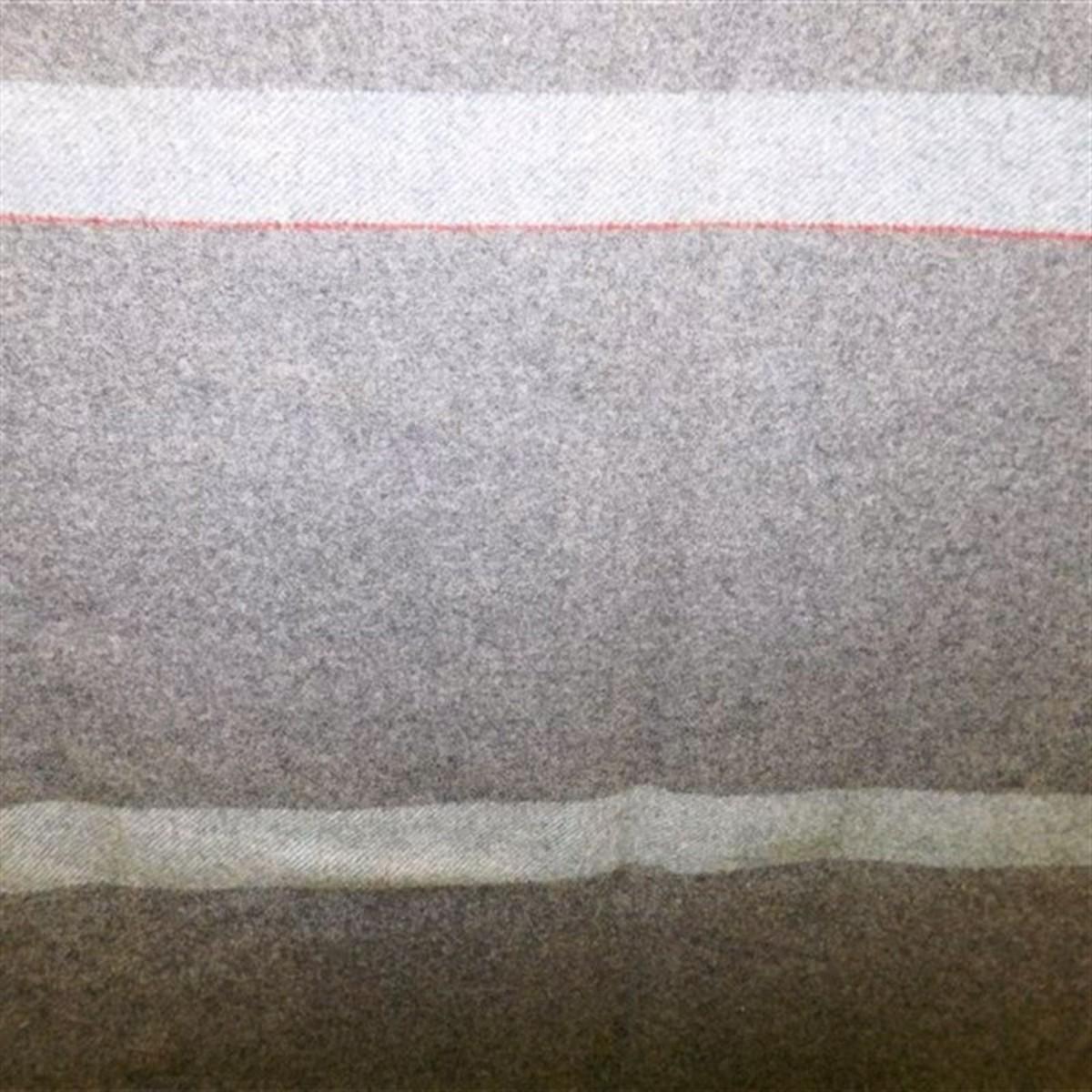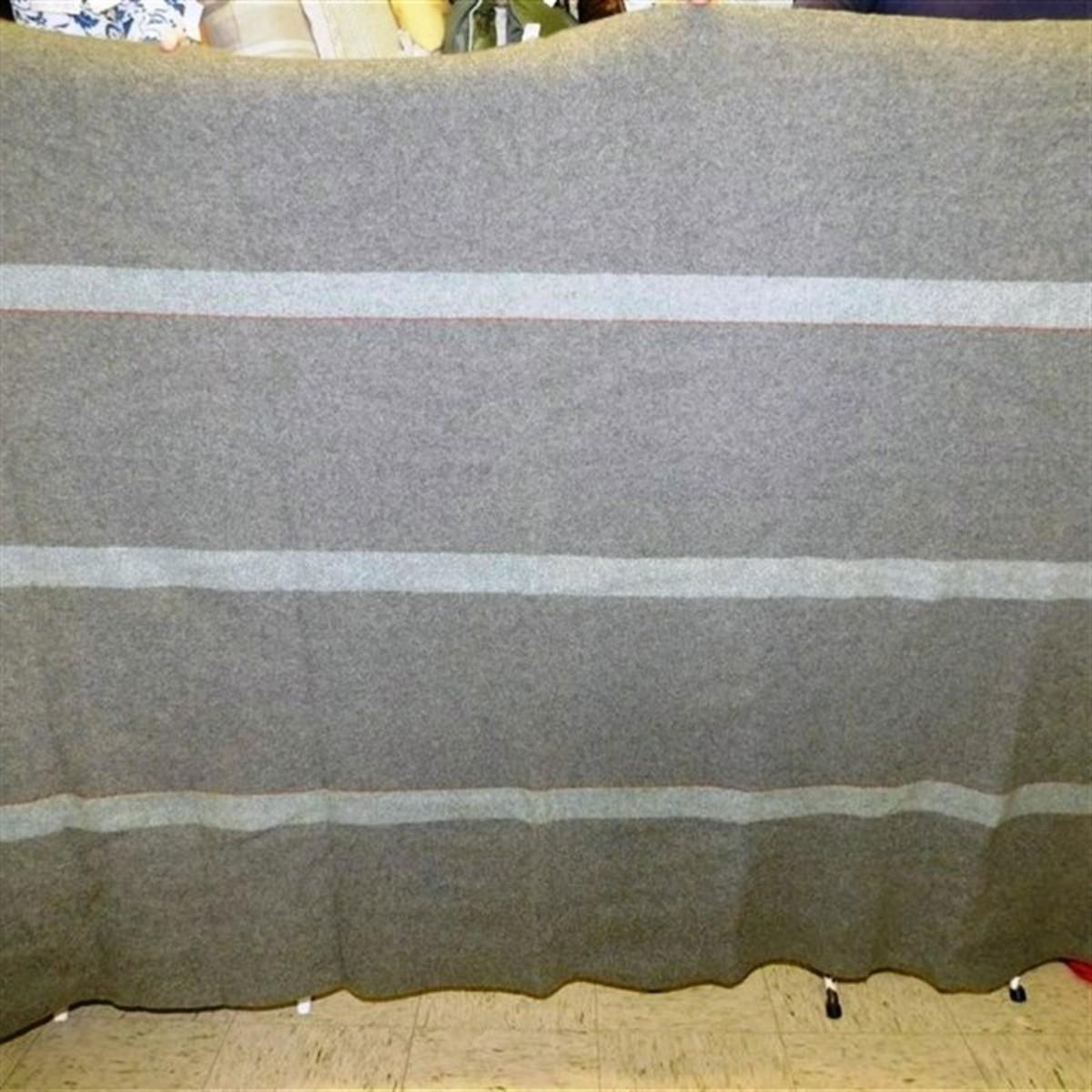 171 Gray Wool Blanket 82 x 54 Made in Australia - Grey with Light Grey Stripe and Red Stitching on Side Has Small Hole