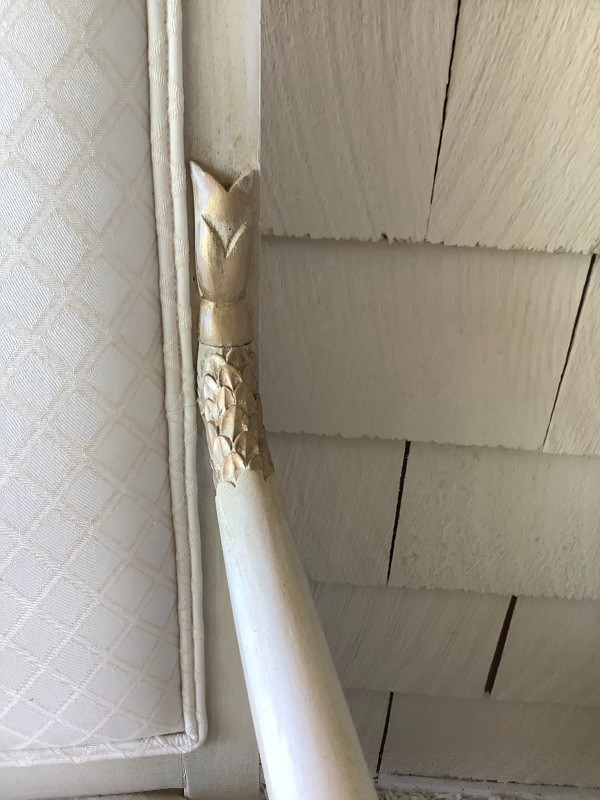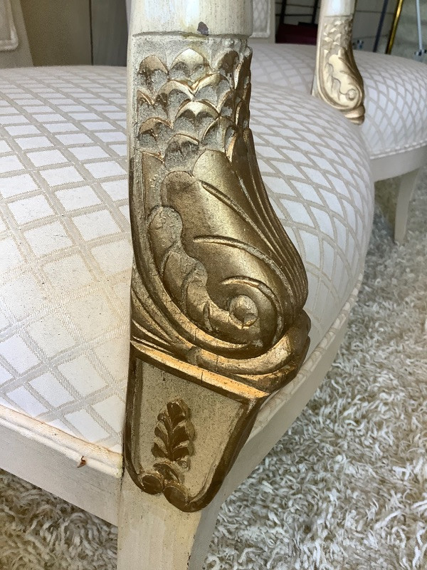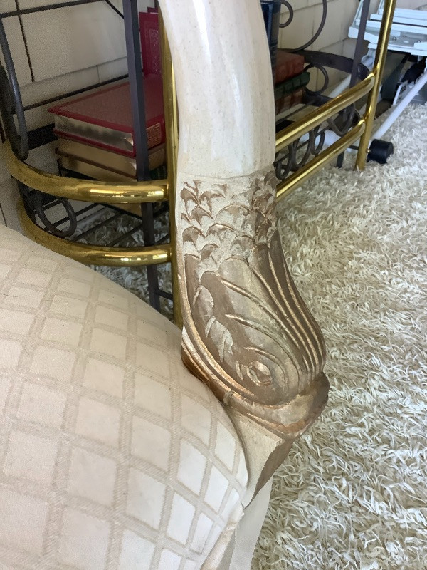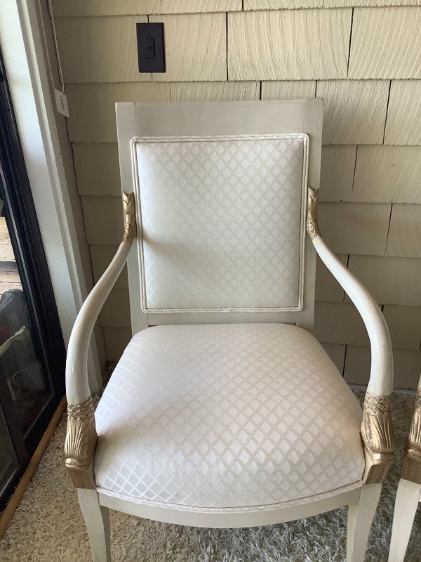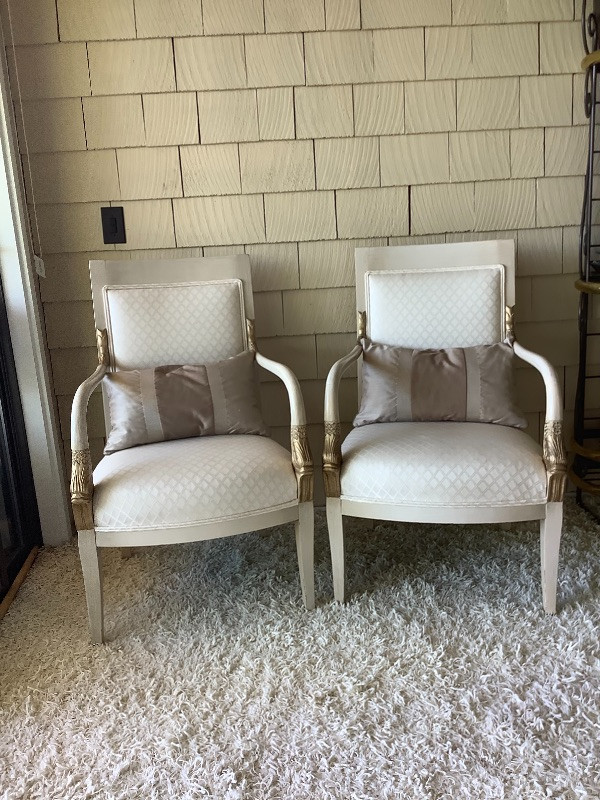 Pair of beautiful White Koi chairs with gold painted trim . These gorgeous sitting chairs will fit in almost any setting