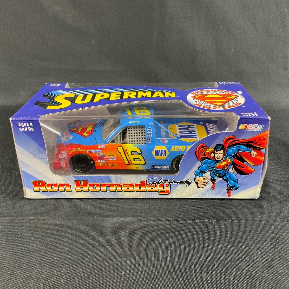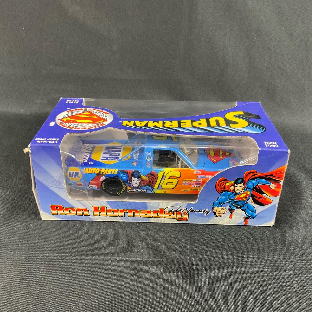 One new in box super truck 1/24 scale Ron Hornaday #16. Please see photos for details and condition. Any condition statement is given as a courtesy to a client, is an opinion, and should not be treated as a statement of fact. Reference to condition written, oral or within a condition report shall not be regarded as a full account of condition and may not include all defects, alterations, or restorations. Absence of a condition report does not imply a lot is flawless or lacking imperfections or damage. Katherine’s Auction & Appraisal Service shall have no responsibility for any error or omission. Returns shall not be accepted on the basis of condition. ::: Shipping is available on this lot. If you require shipping you must let us know at the close of the auction. We will coordinate with you after the item has been won. Shipping fees will include insurance up to or exceeding the value of all items being mailed. If you have any questions regarding this lot please contact the auctioneer either via this website, by direct email or by phone. PICK UP TIMES and other important information can be found in the TERMS and DESCRIPTION of the auction. Please take a look for pertinent information. Thanks!